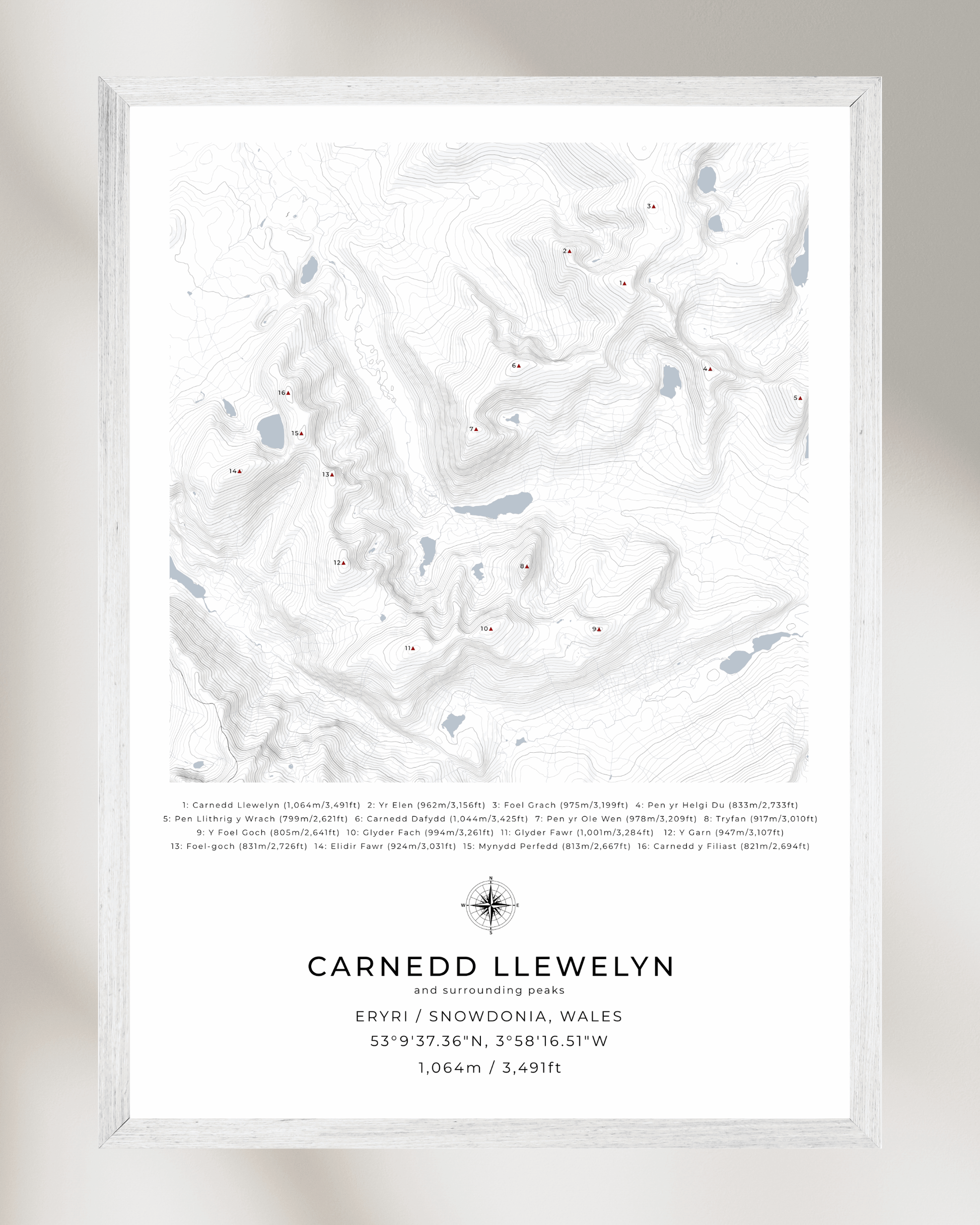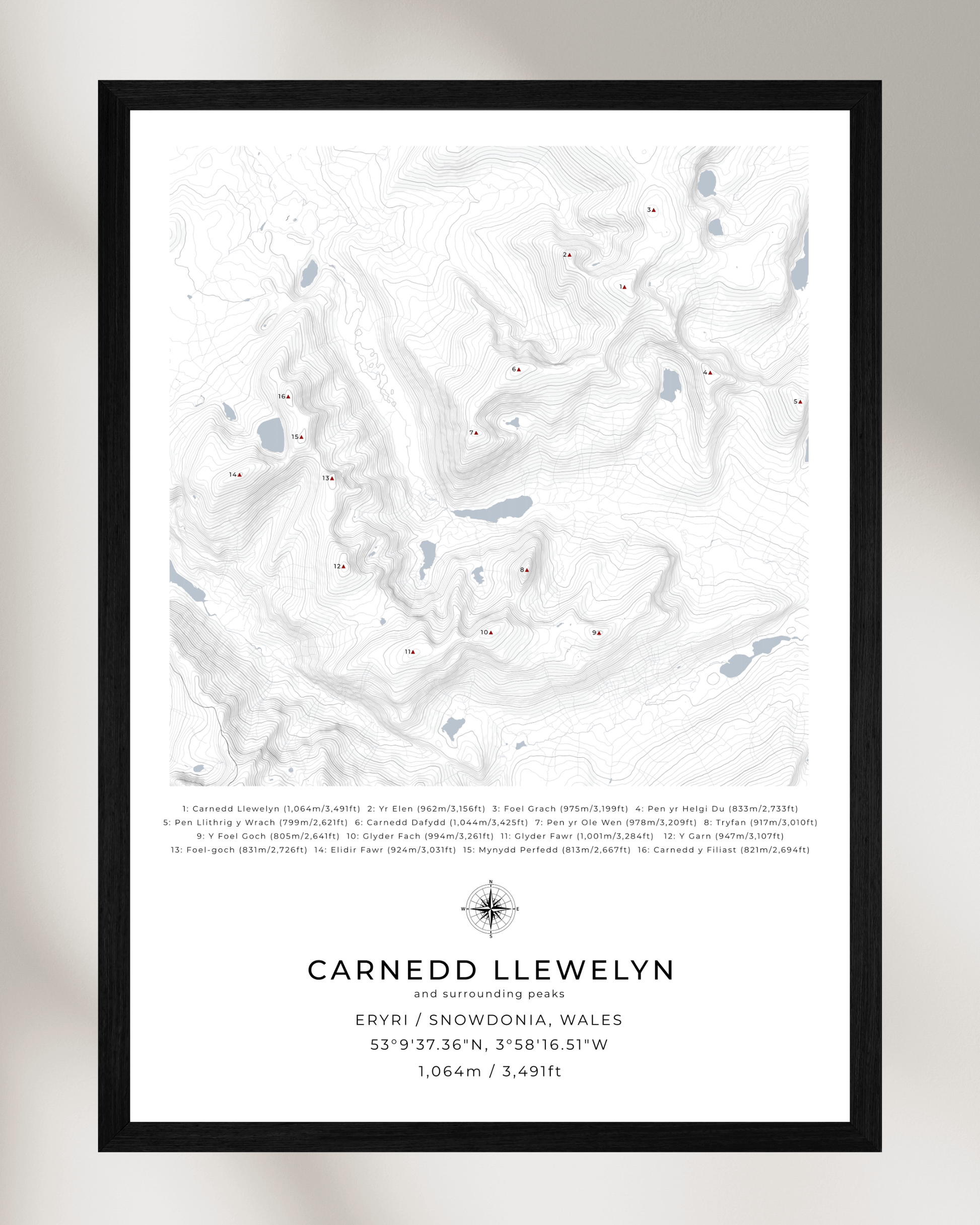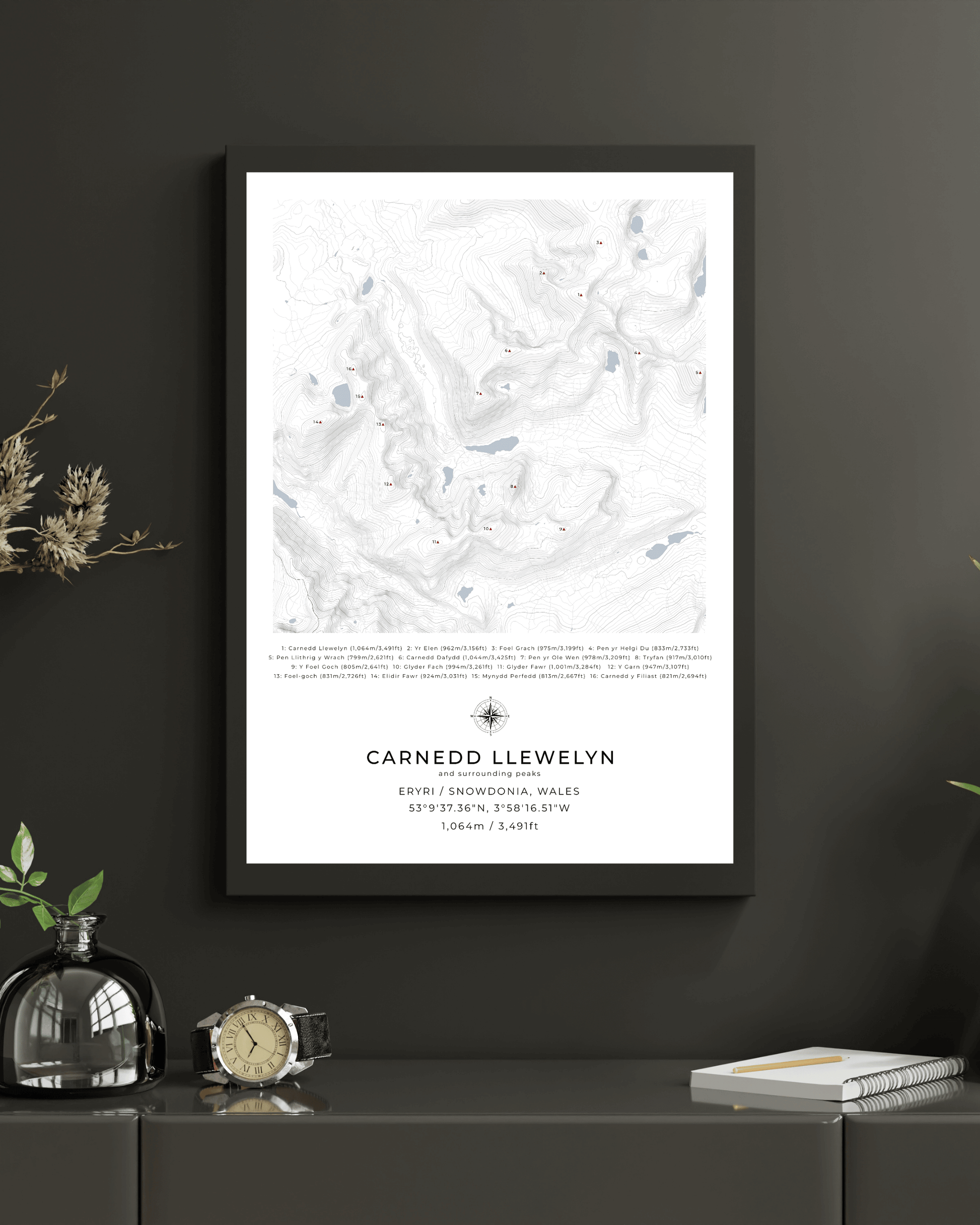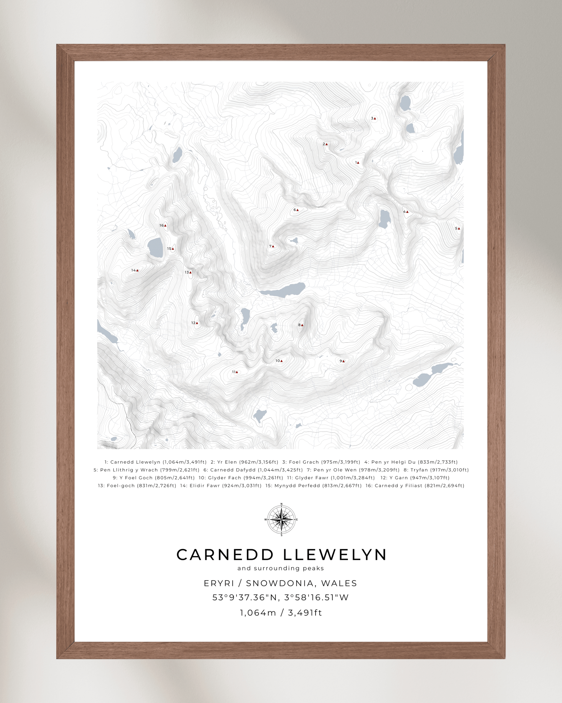 This minimalist, framed contour map of Carnedd Llewelyn and surrounding peaks beautifully captures the following mountains in Snowdonia National Park: