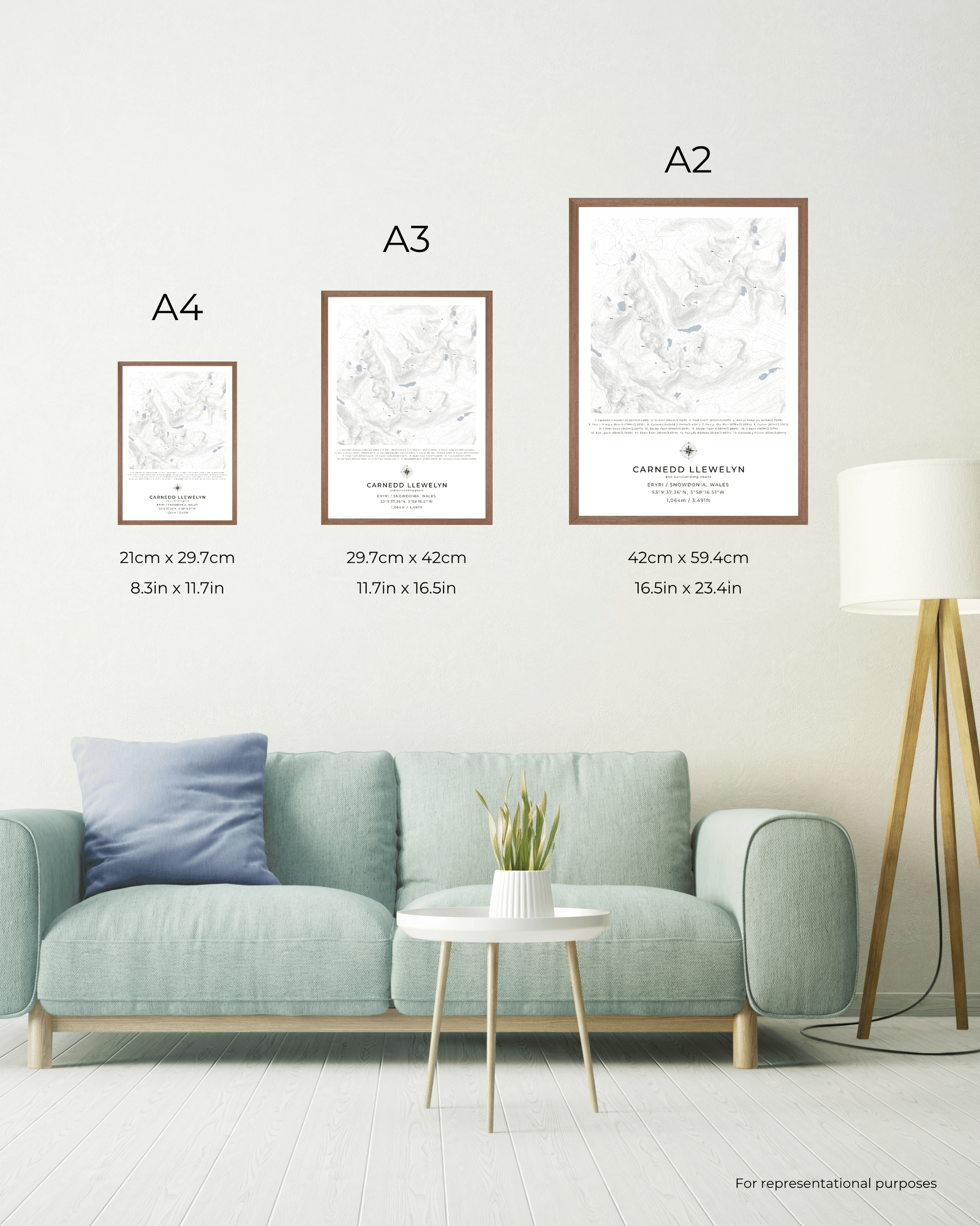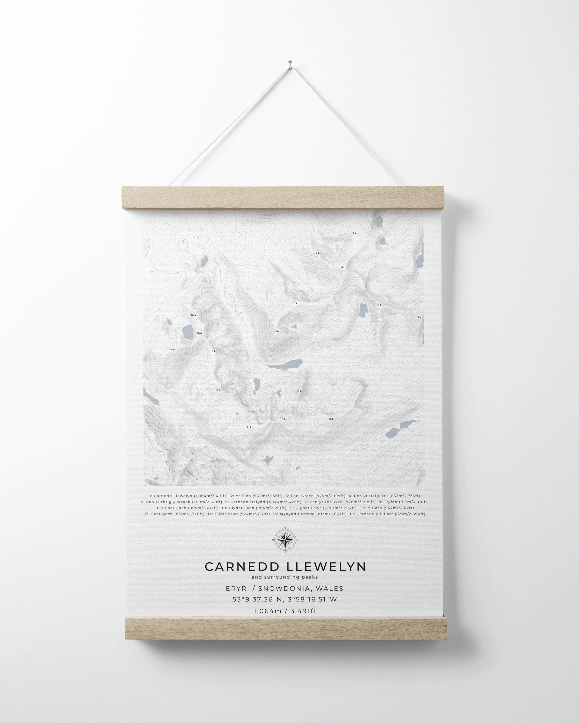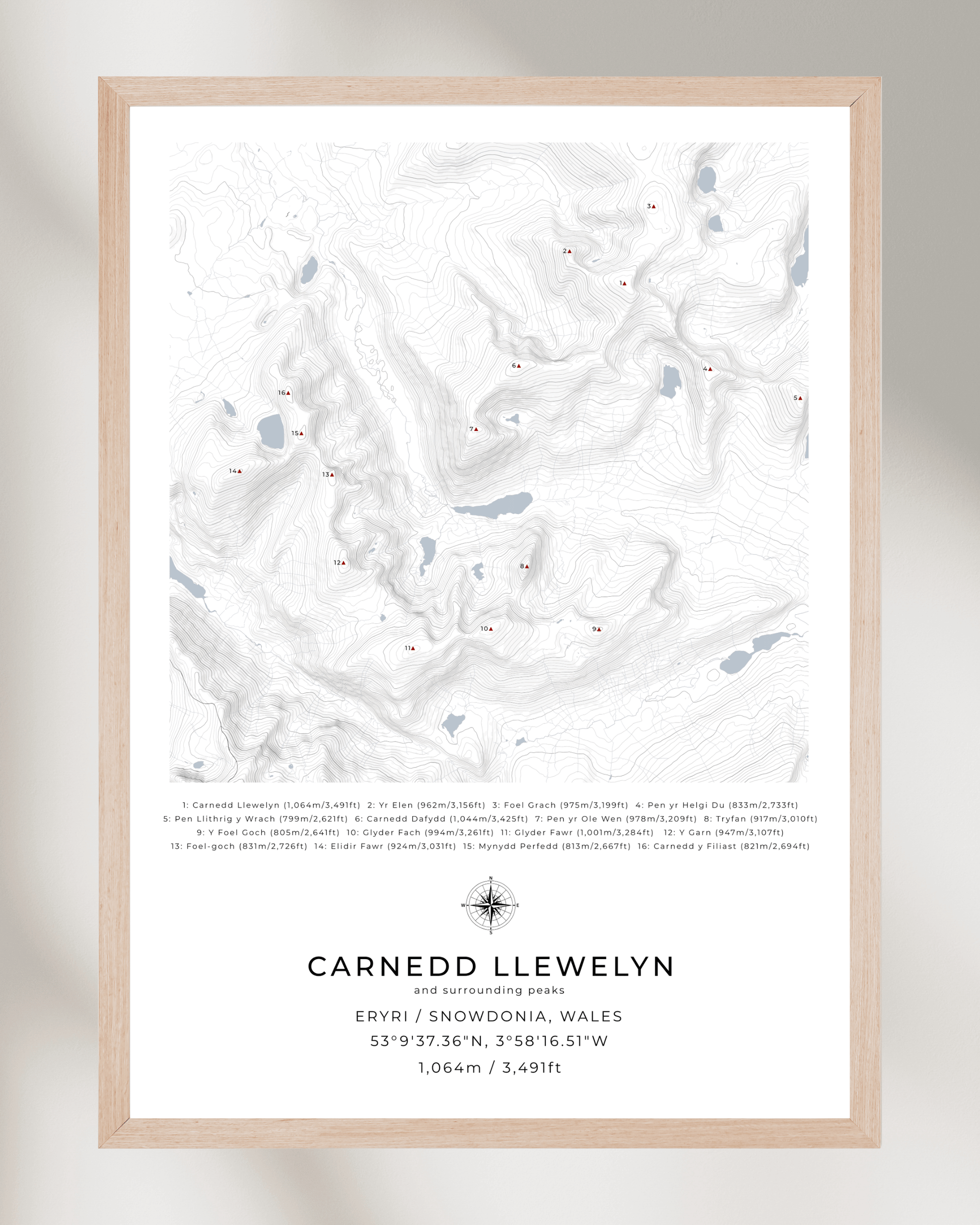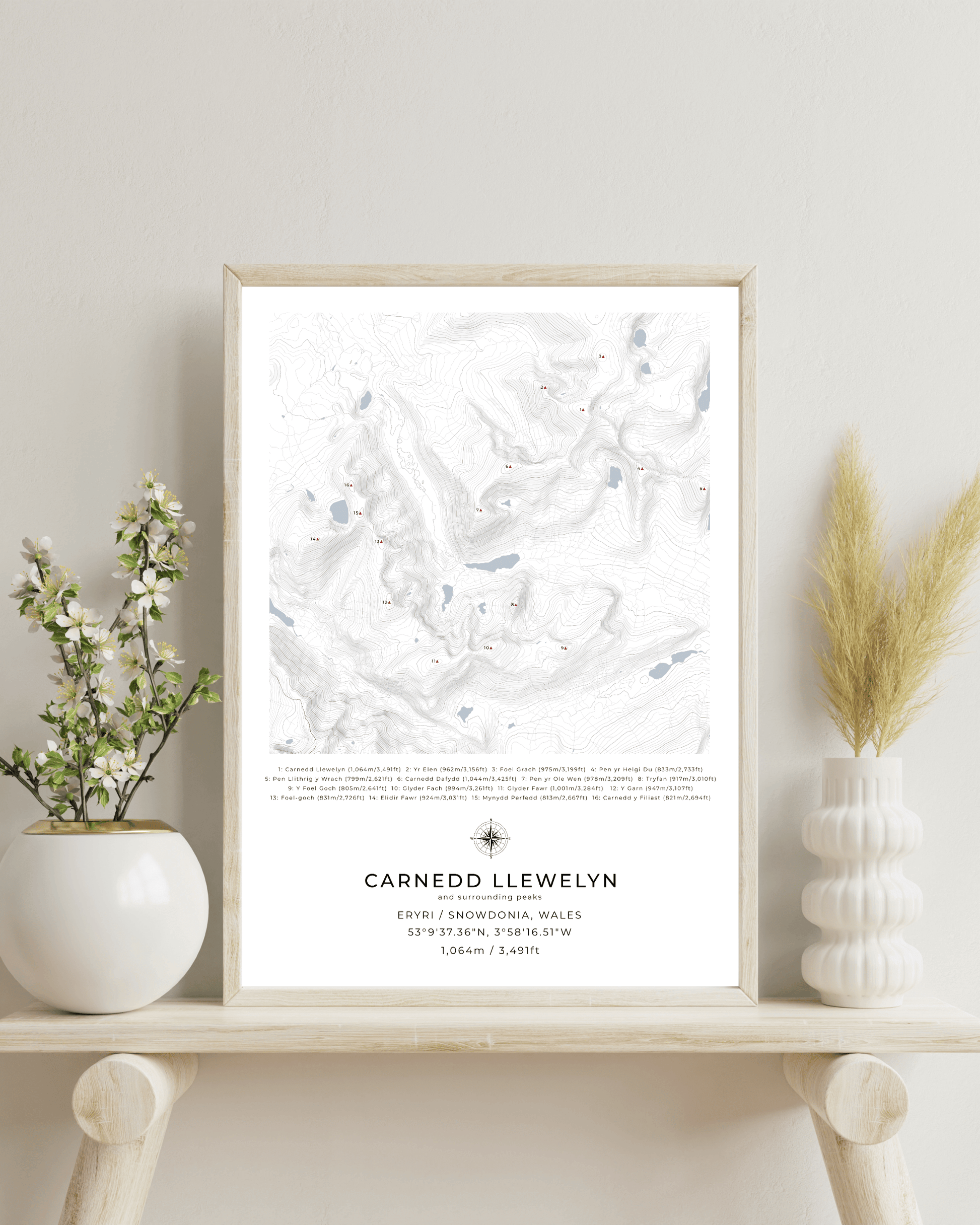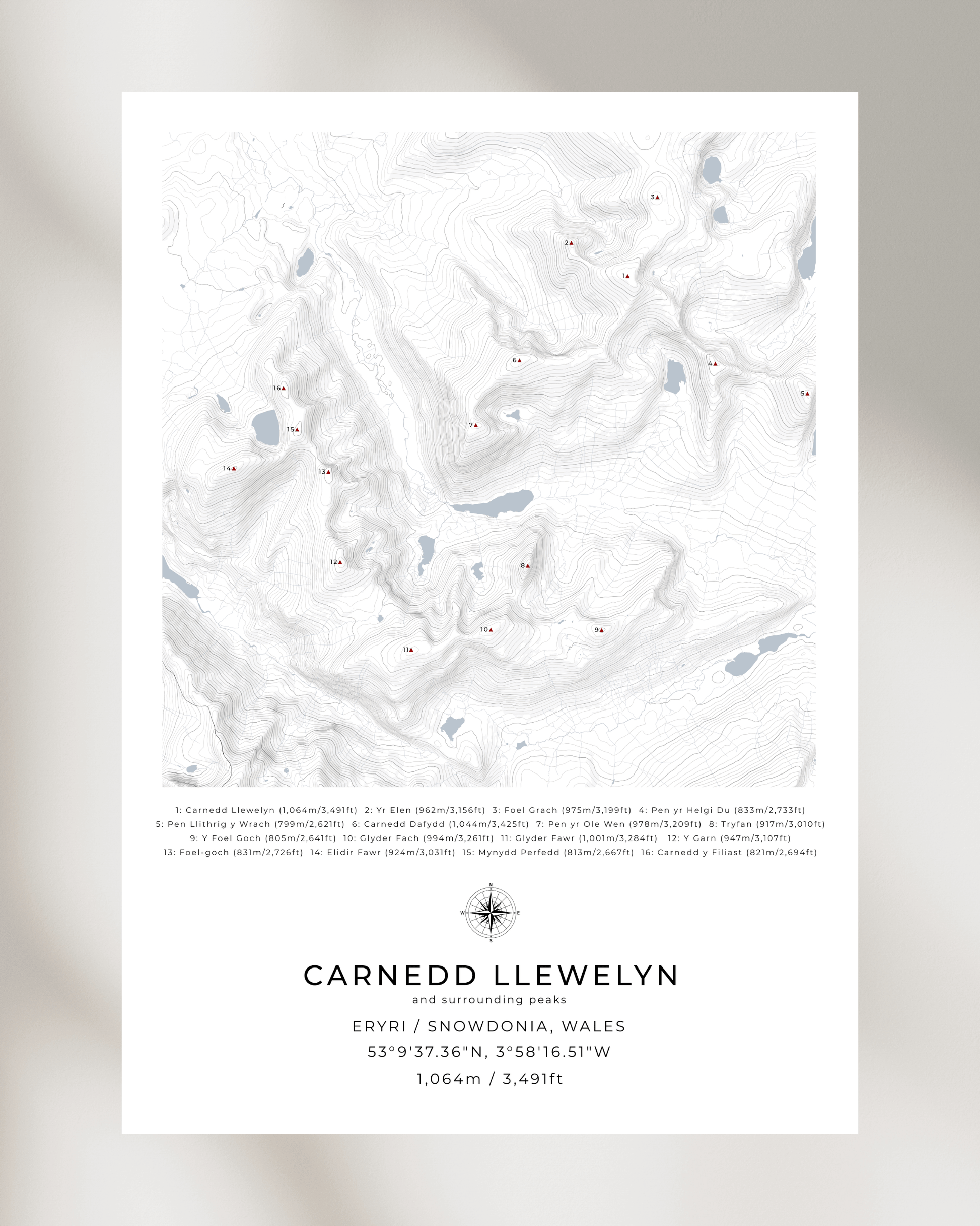 This minimalist, framed contour map of Carnedd Llewelyn and surrounding peaks beautifully captures the following mountains in Snowdonia National Park:
