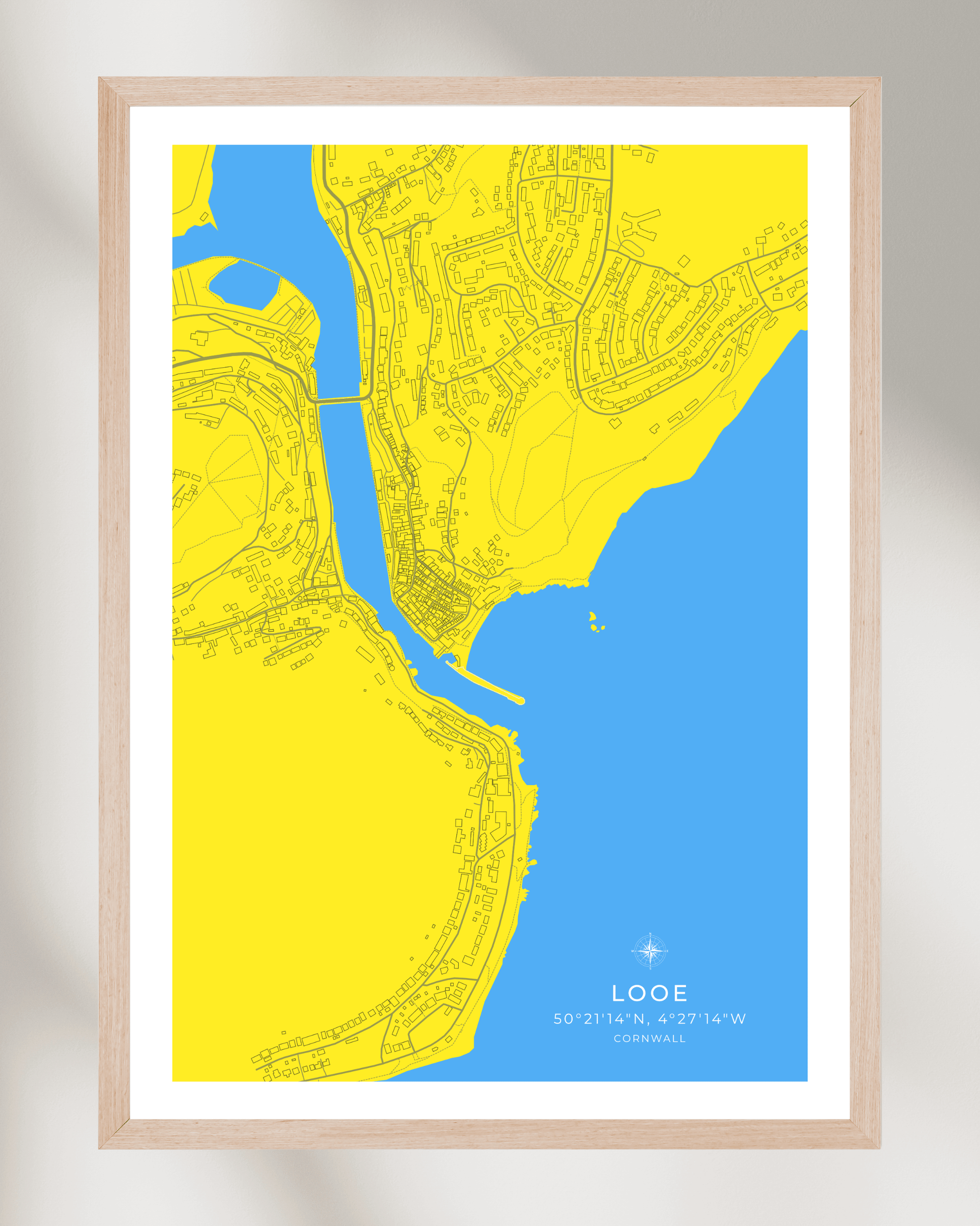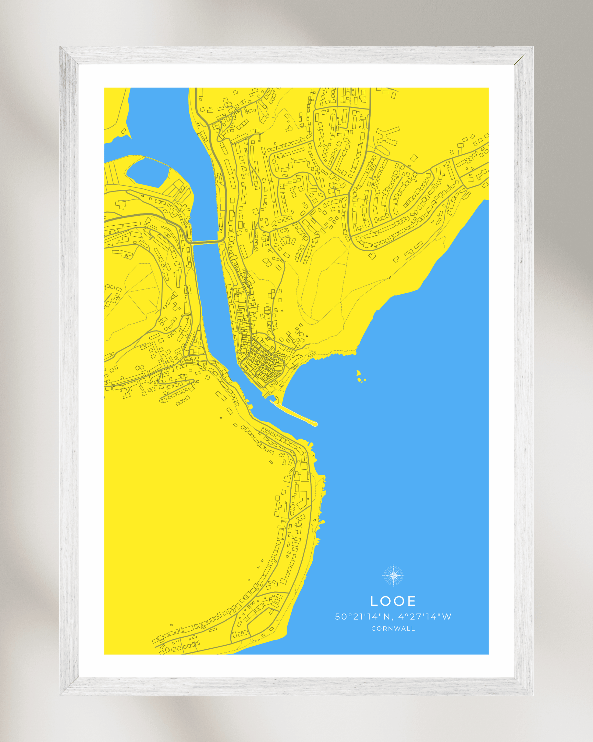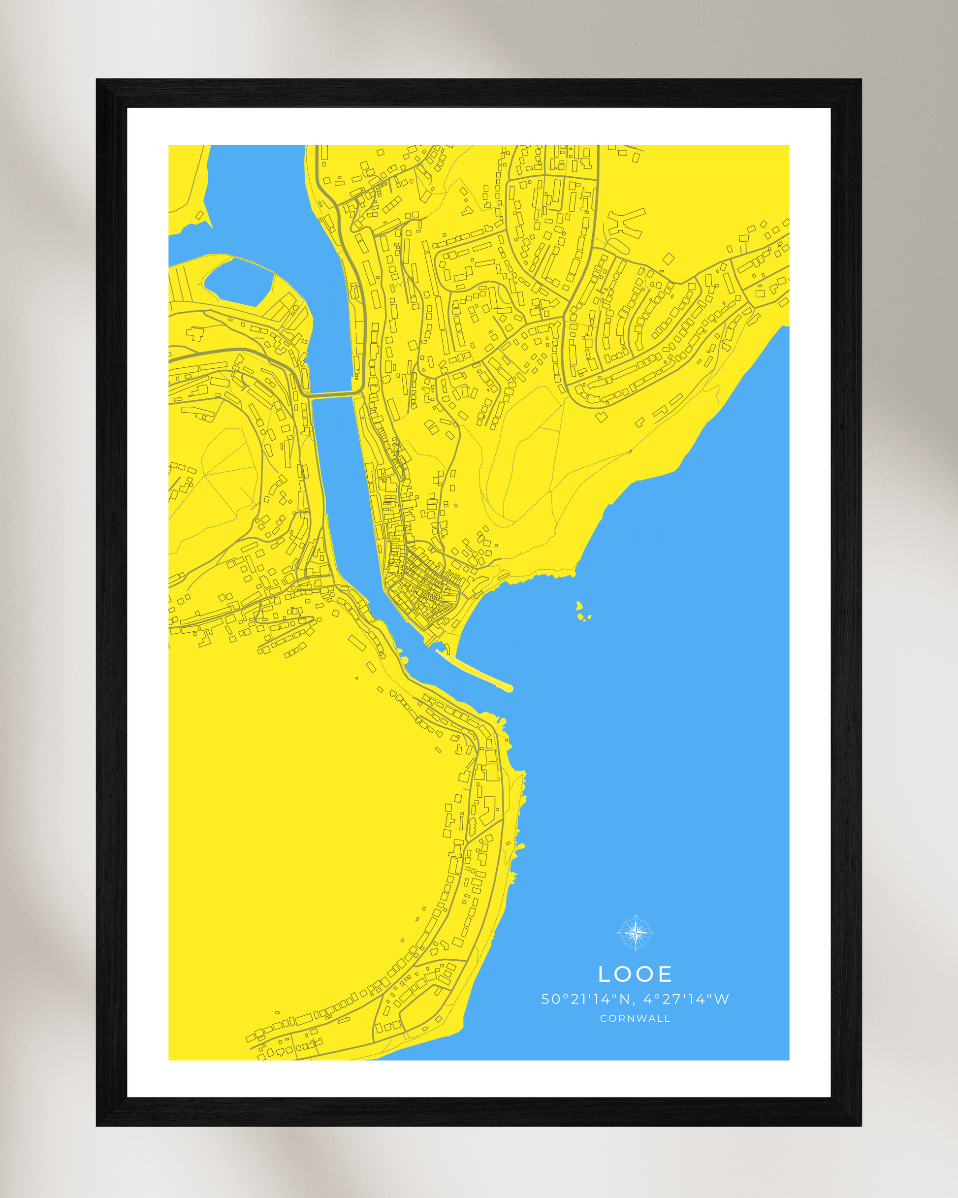 This fine art map offers a detailed depiction of Looe, a historic Cornish town divided by its tidal river and shaped by a long maritime tradition. The map traces the distinctive layout of East and West Looe, capturing the narrow streets, harbour walls, quaysides, and historic buildings that line the river as it meets the sea.