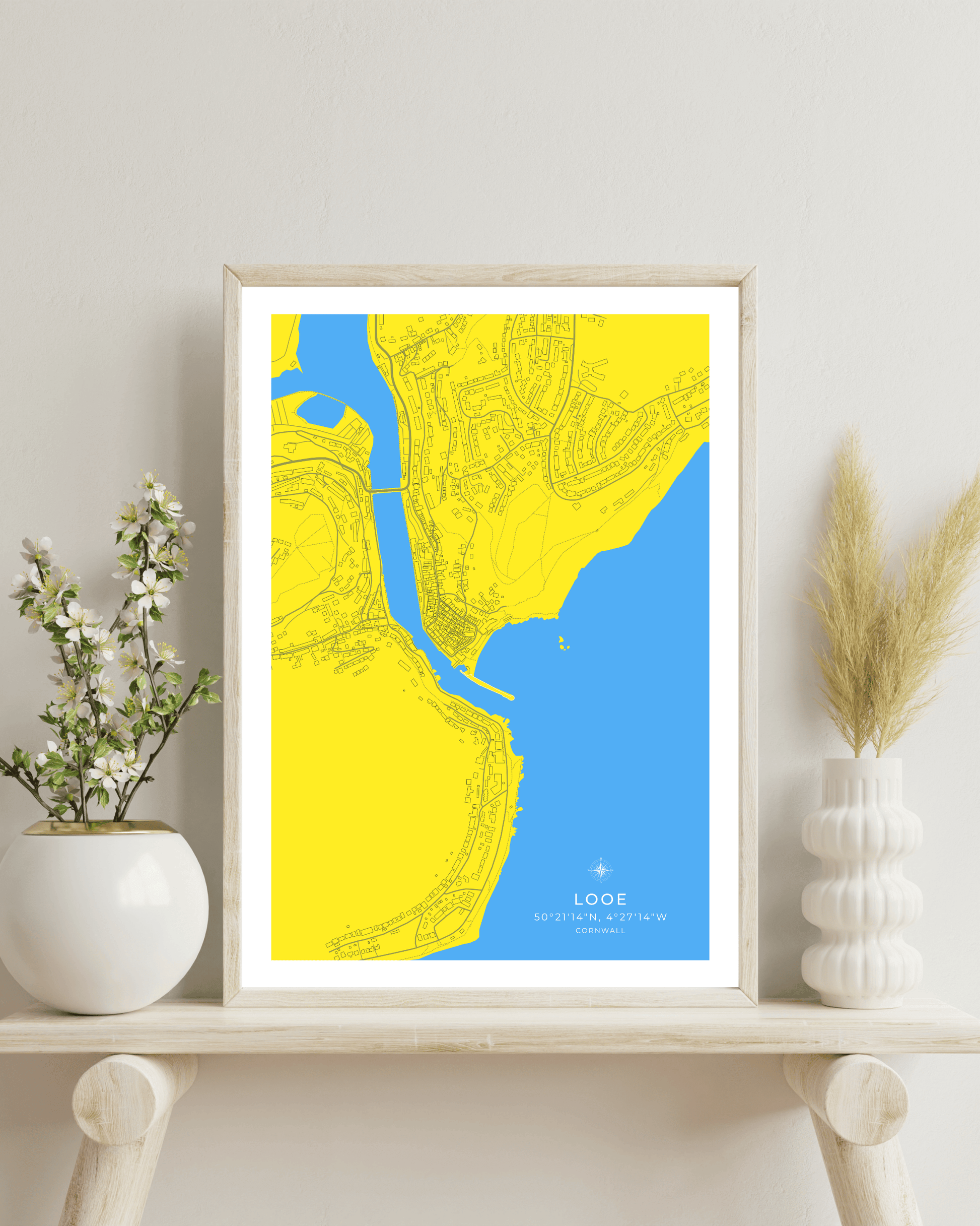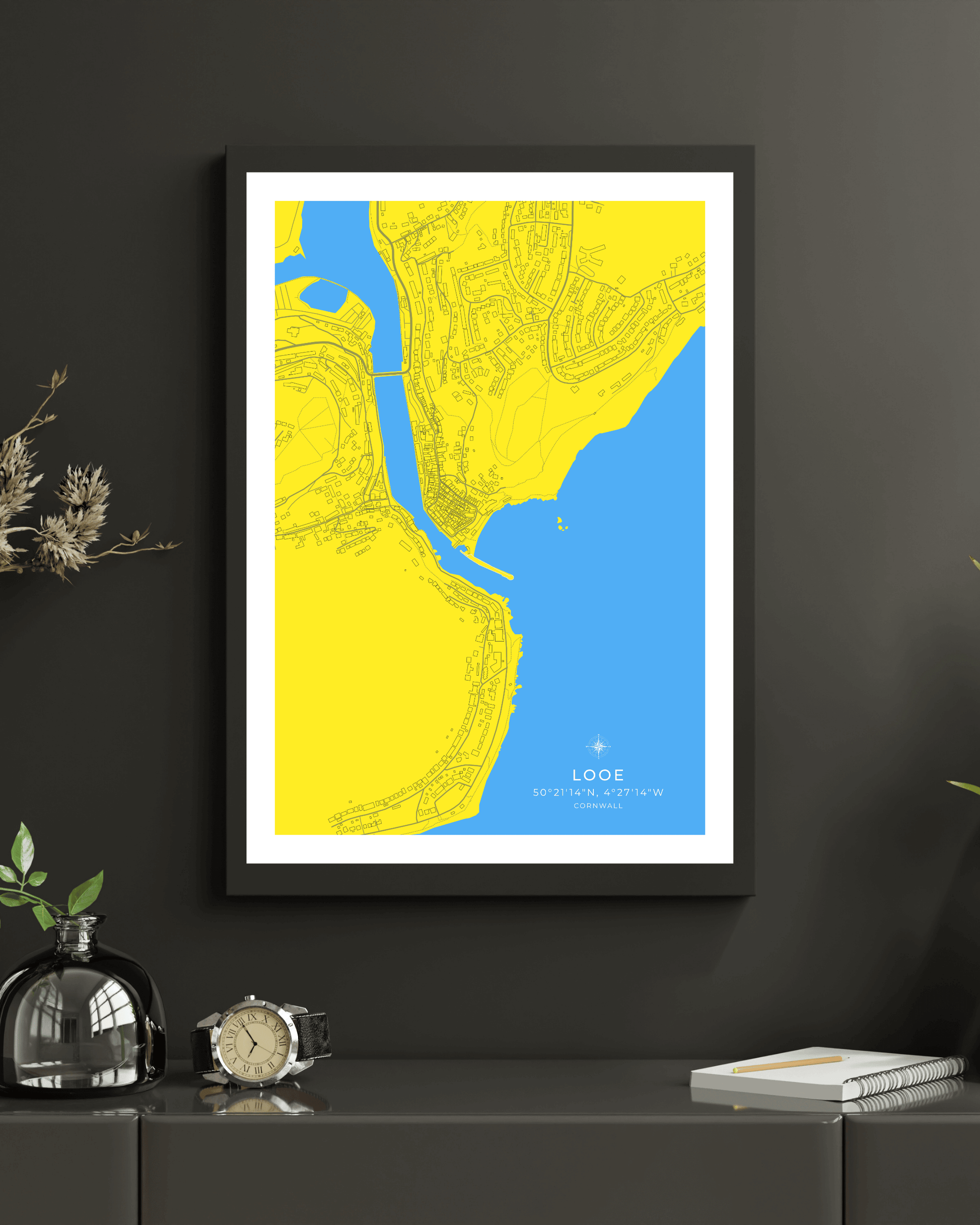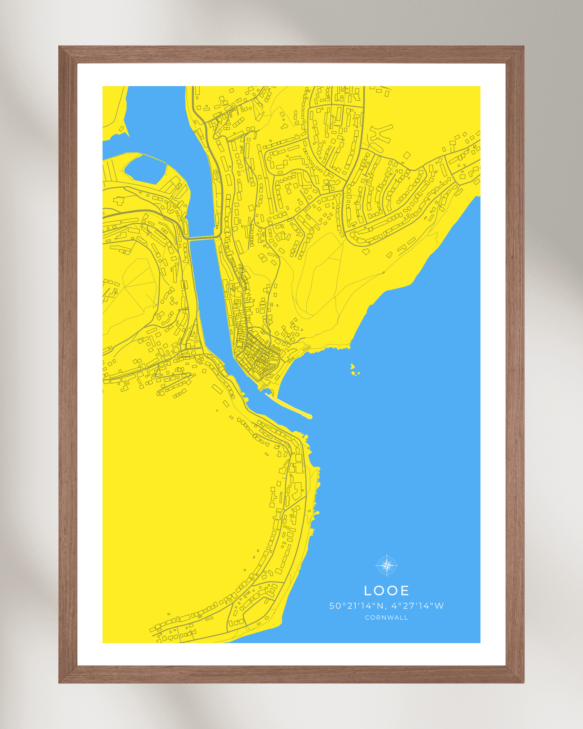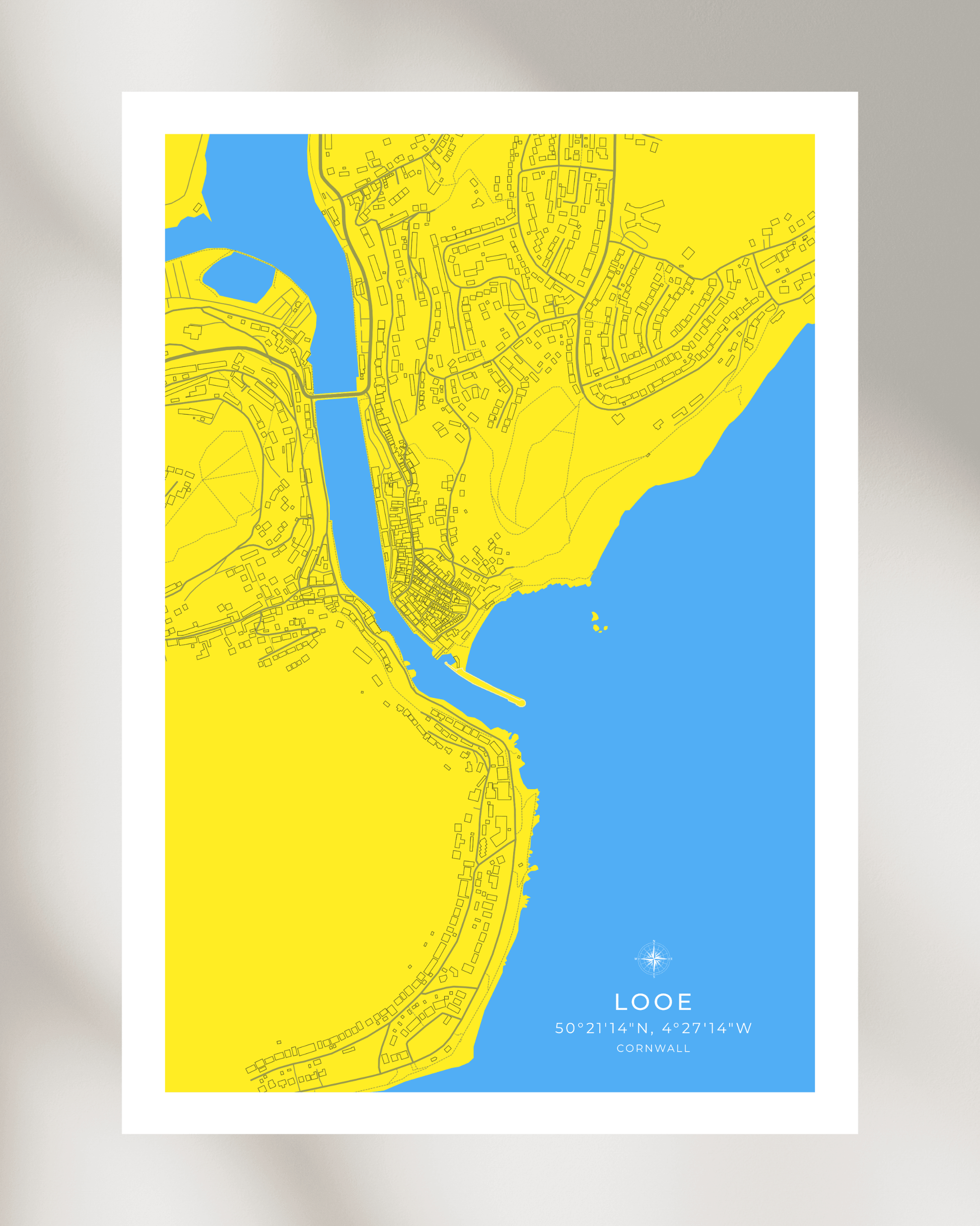 This fine art map offers a detailed depiction of Looe, a historic Cornish town divided by its tidal river and shaped by a long maritime tradition. The map traces the distinctive layout of East and West Looe, capturing the narrow streets, harbour walls, quaysides, and historic buildings that line the river as it meets the sea.