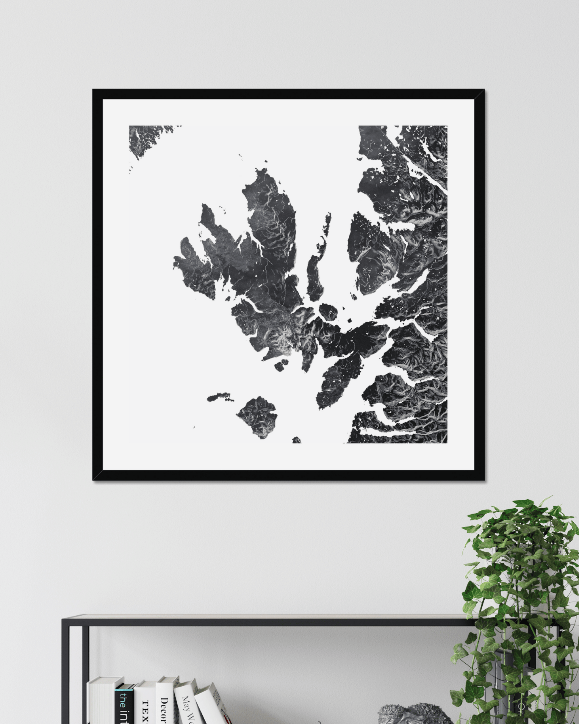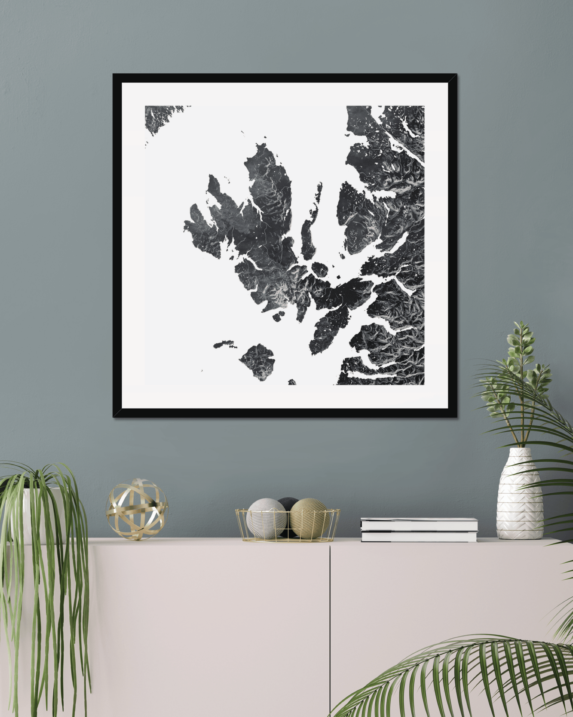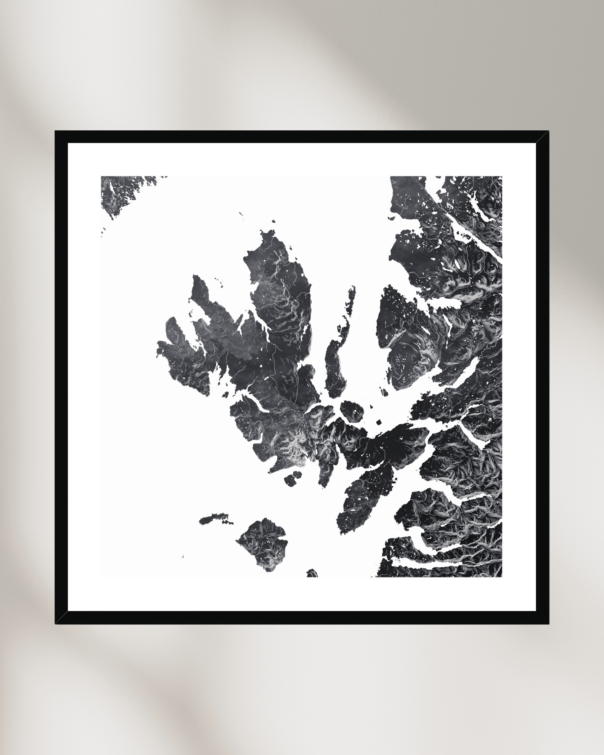 Every inlet, mountain ridge, and hidden valley is meticulously rendered in our signature minimalist style. Printed on premium museum-quality paper and housed in a contemporary square 'box' frame to give additional depth, this piece brings the wild beauty of the Hebrides into your home.
