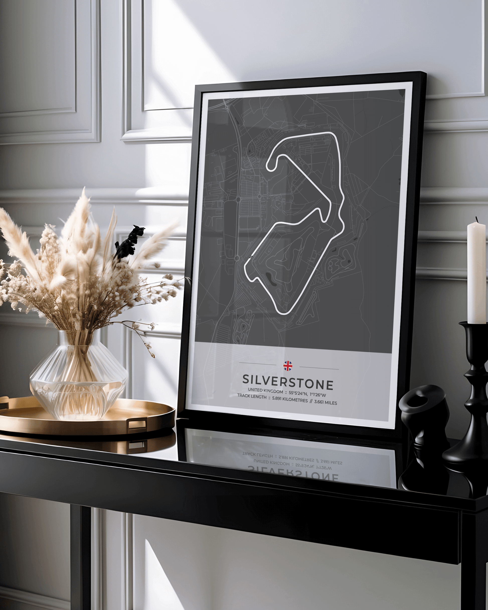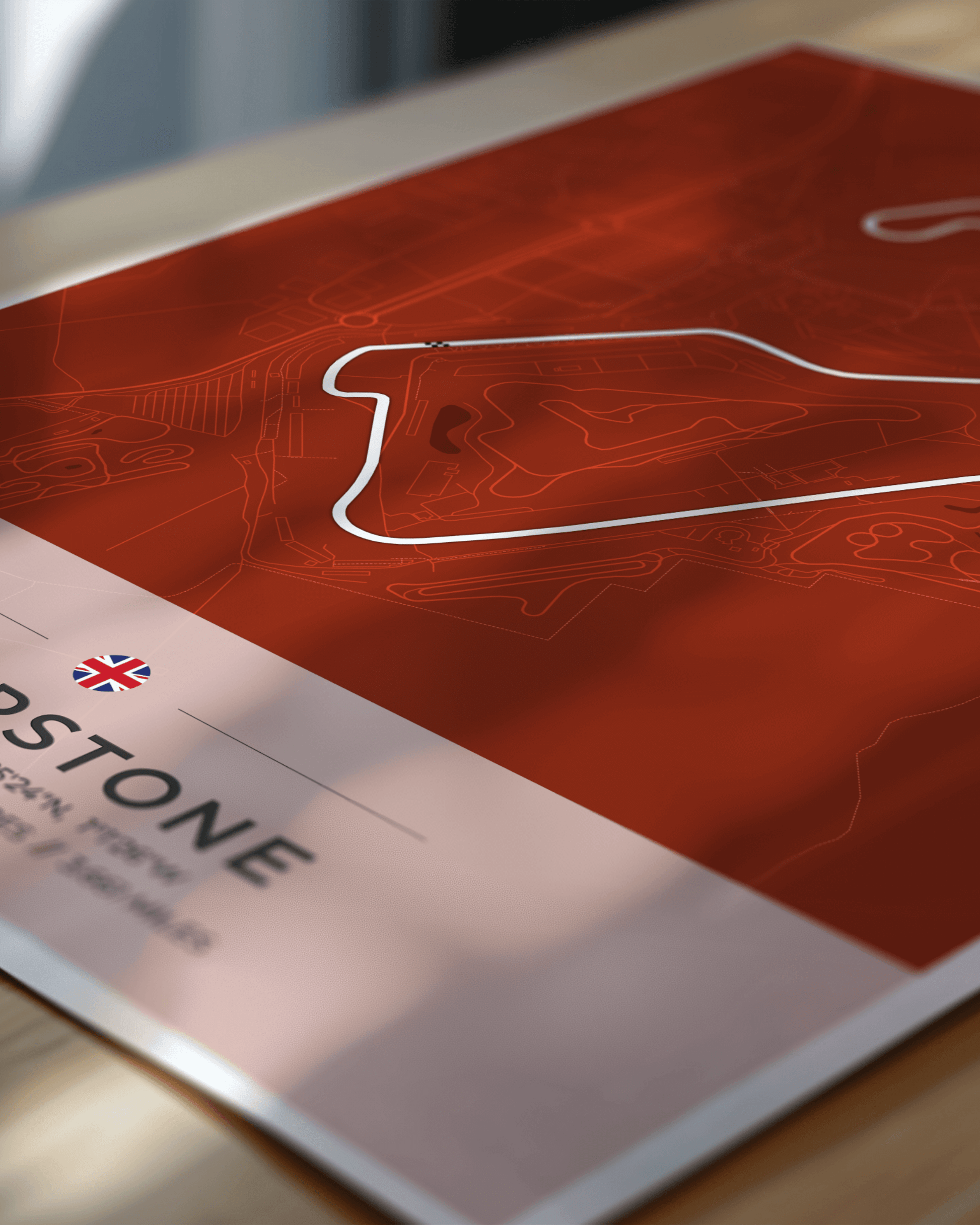 A stunning, highly accurate map of the Silverstone Circuit, together with location coordinates, country flag and track length in both kilometres and miles.