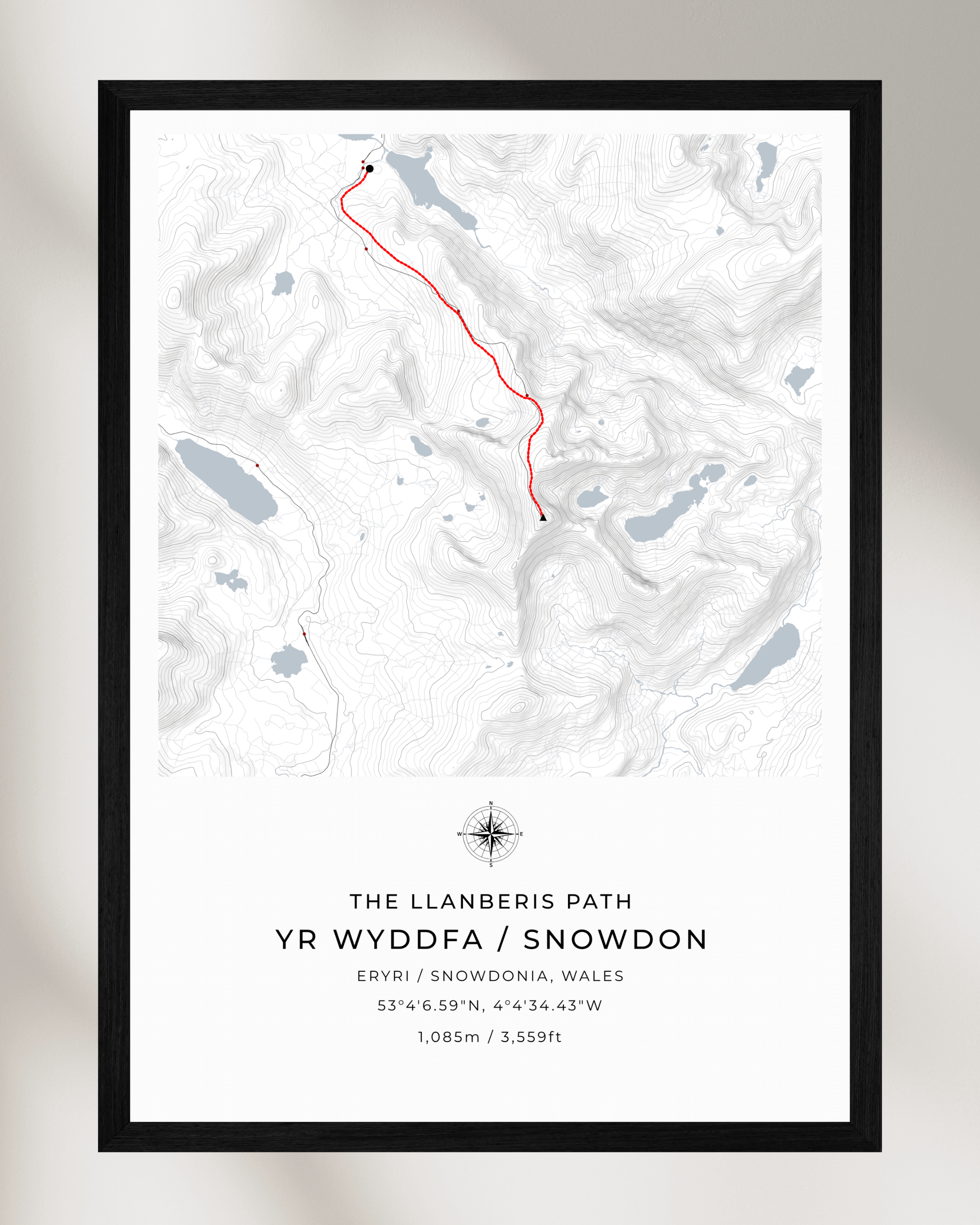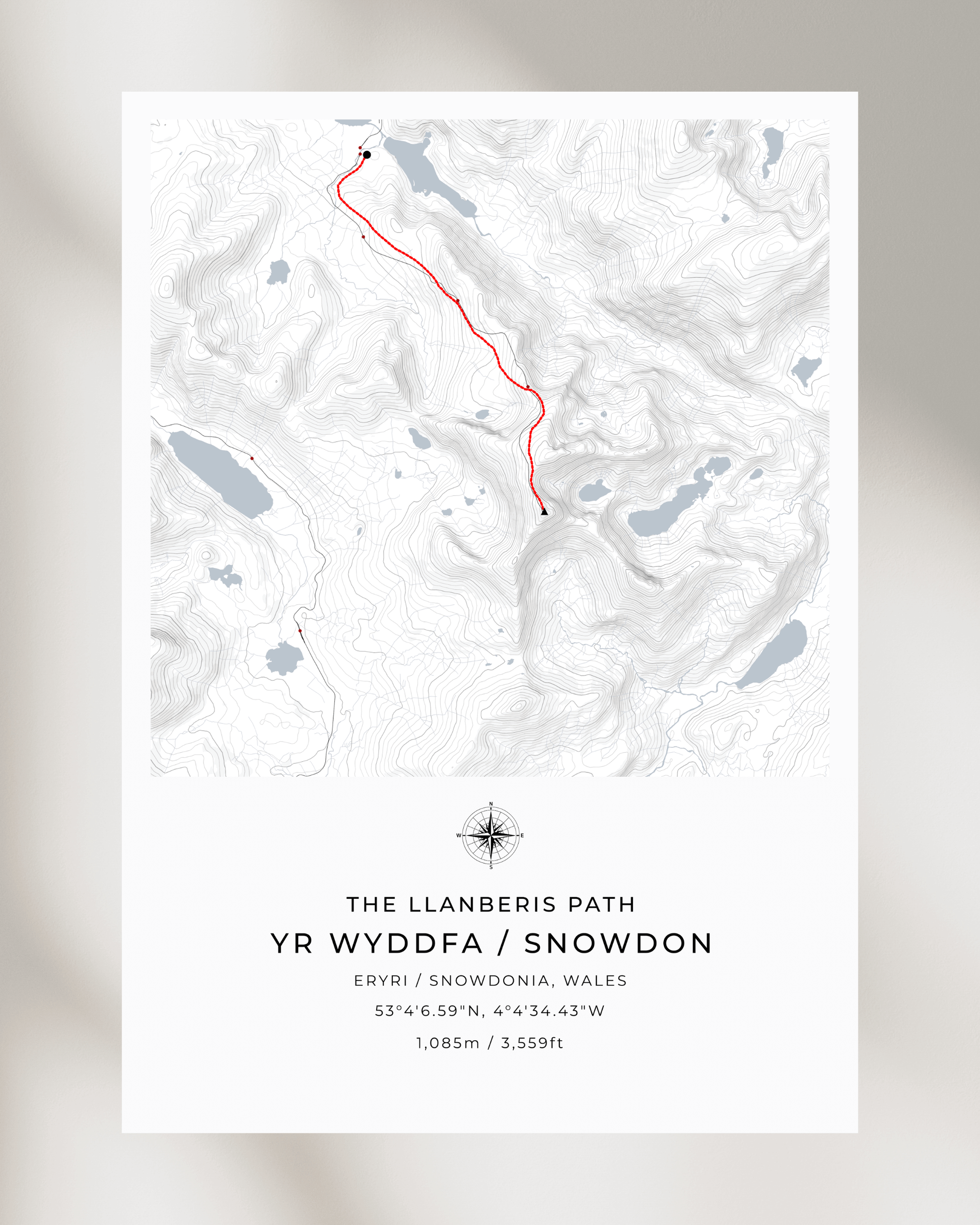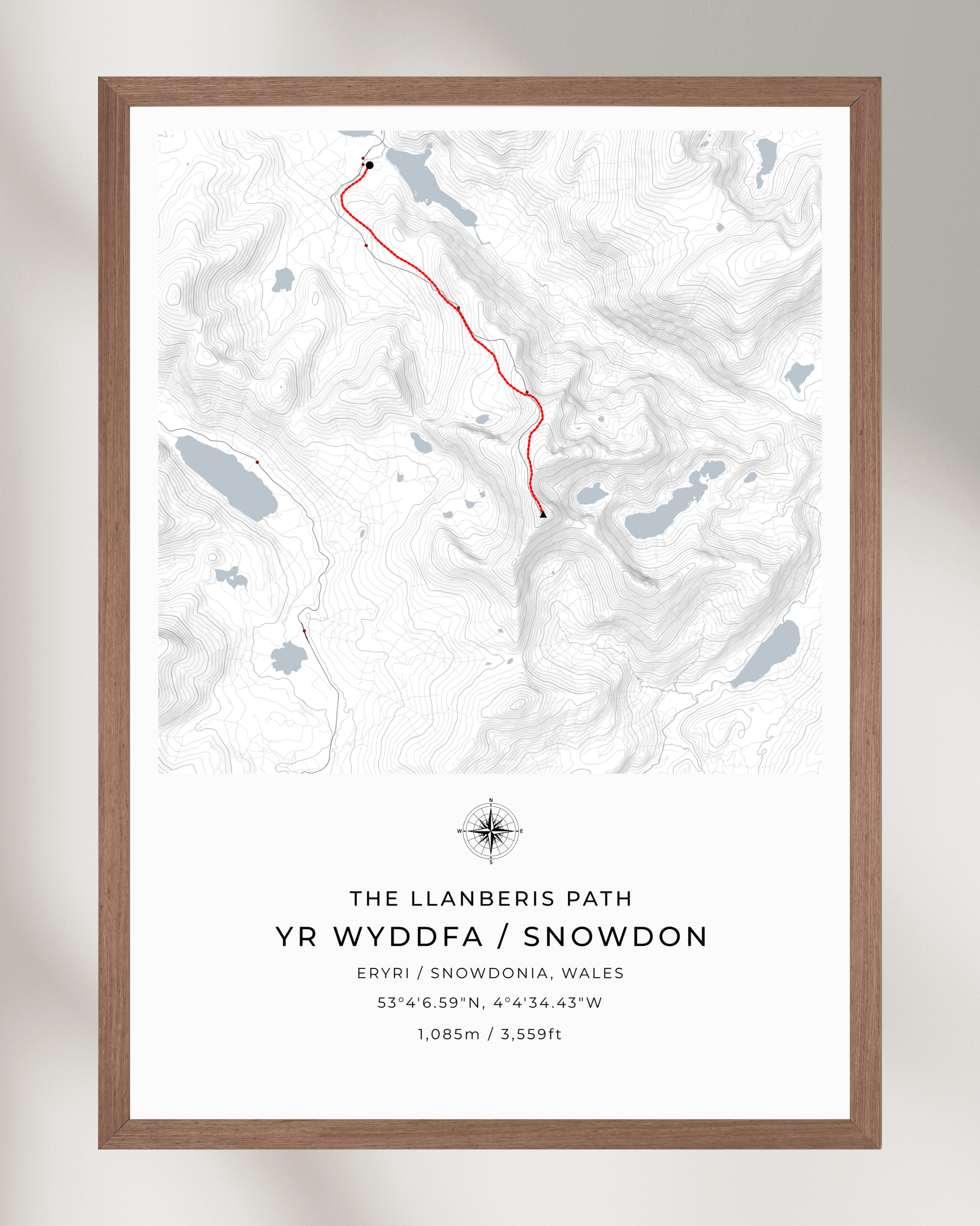 Designed with crisp, clean lines, this map beautifully captures the gentle ascent through Snowdon’s breathtaking landscape, perfect for those who have experienced its serene beauty or are inspired by the challenge.