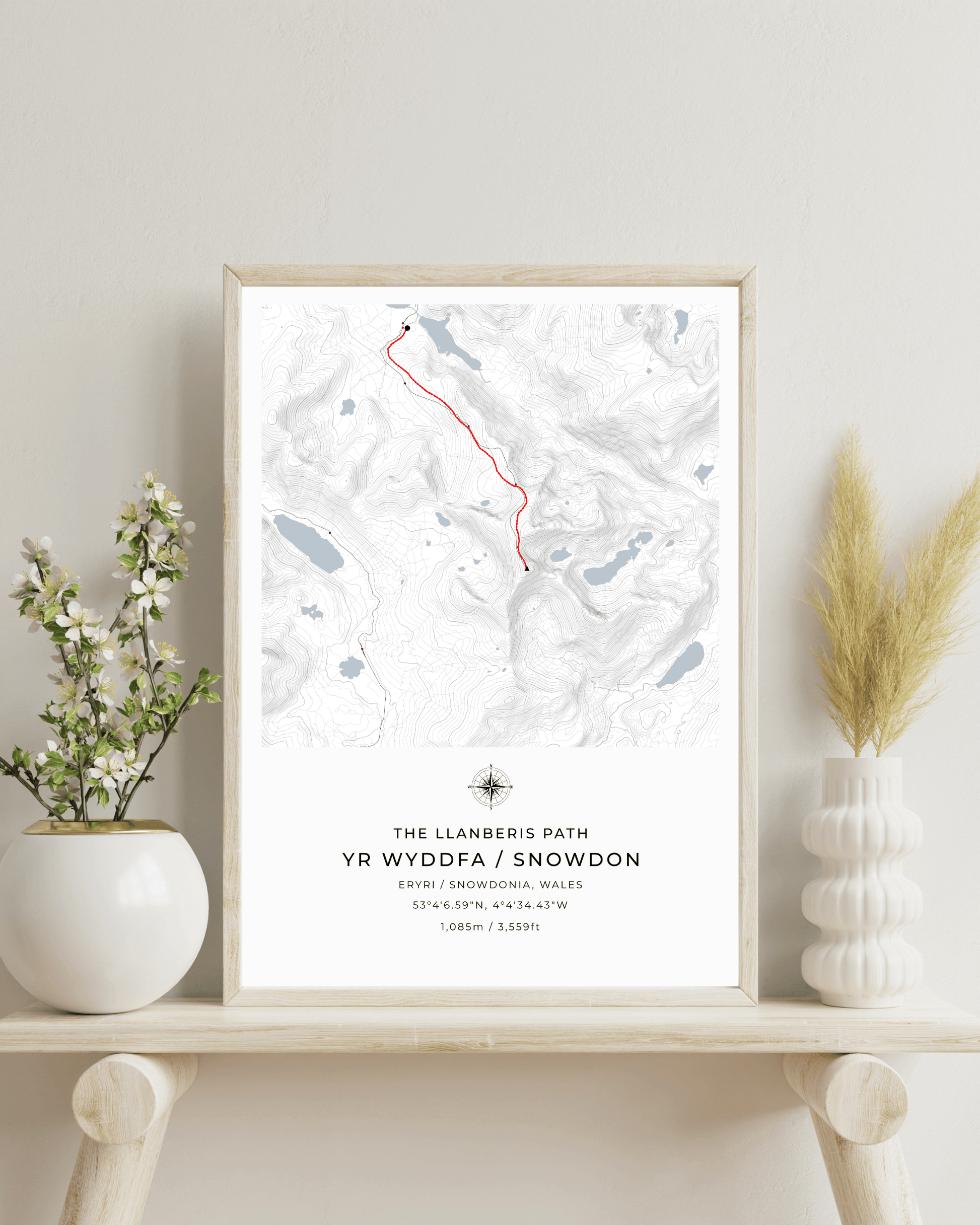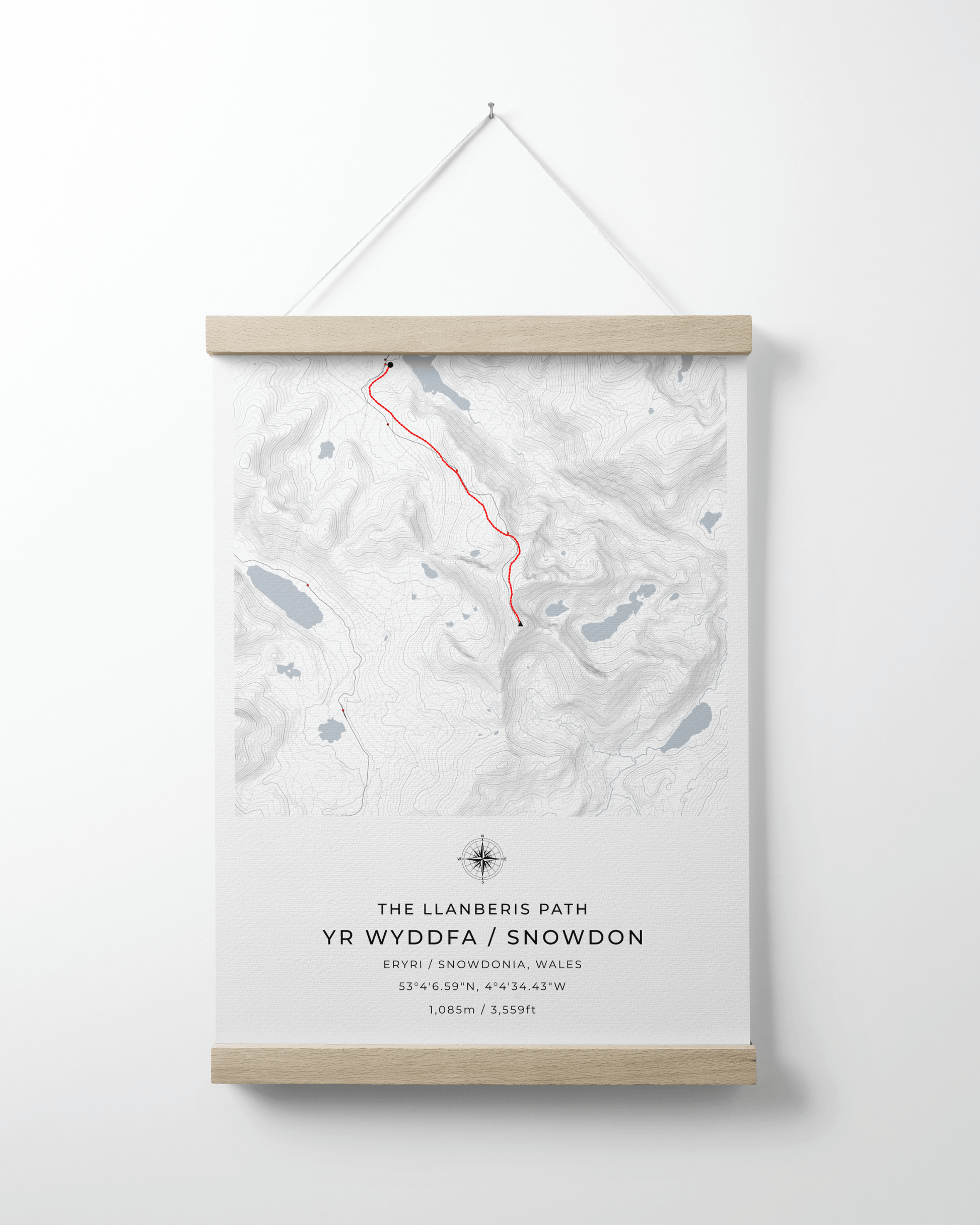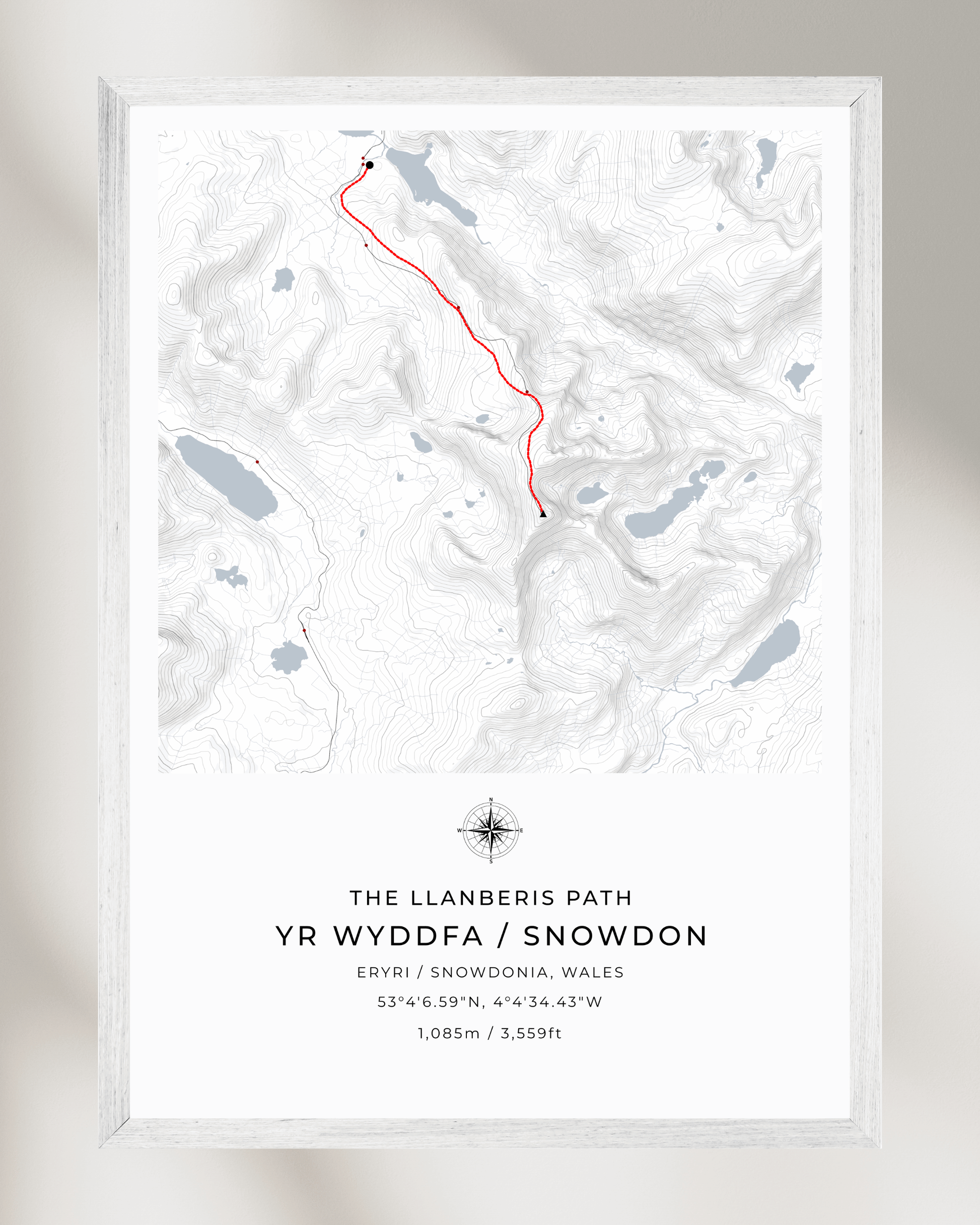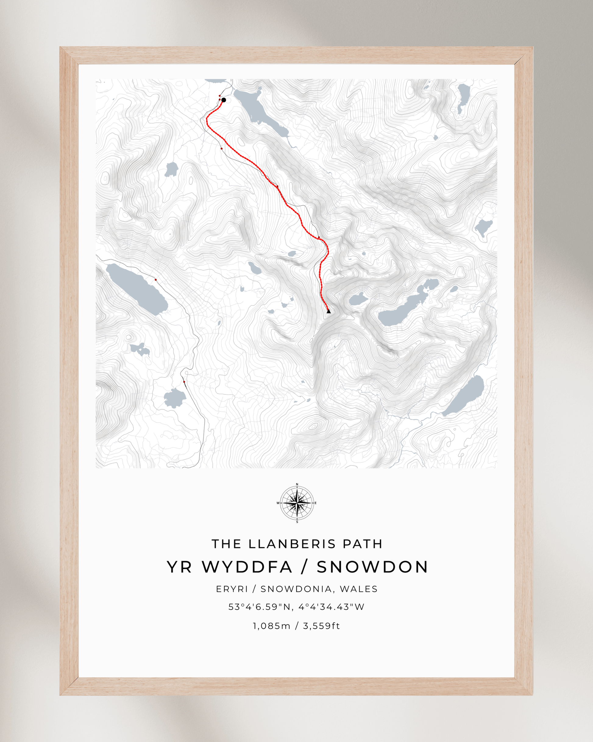 Designed with crisp, clean lines, this map beautifully captures the gentle ascent through Snowdon’s breathtaking landscape, perfect for those who have experienced its serene beauty or are inspired by the challenge.