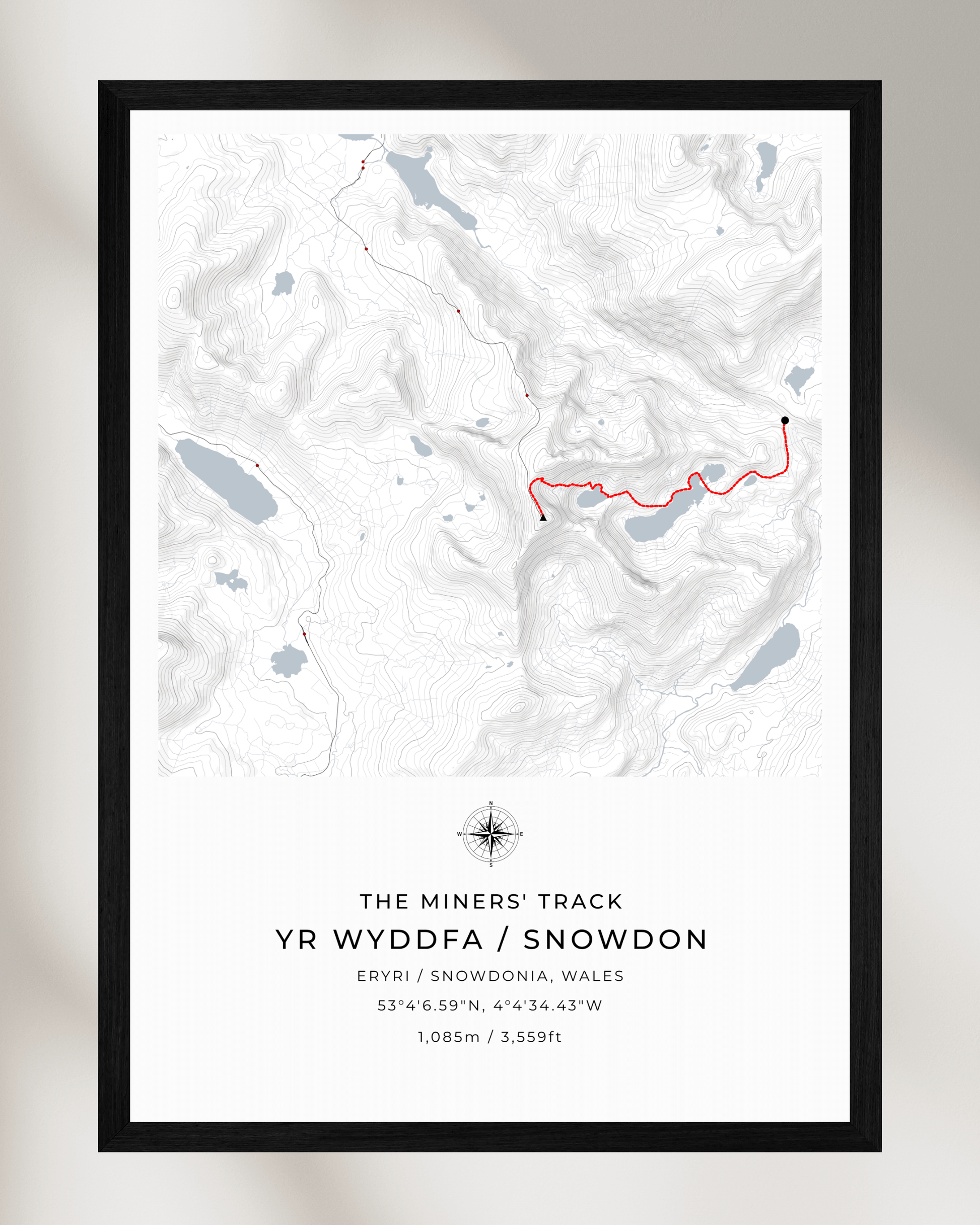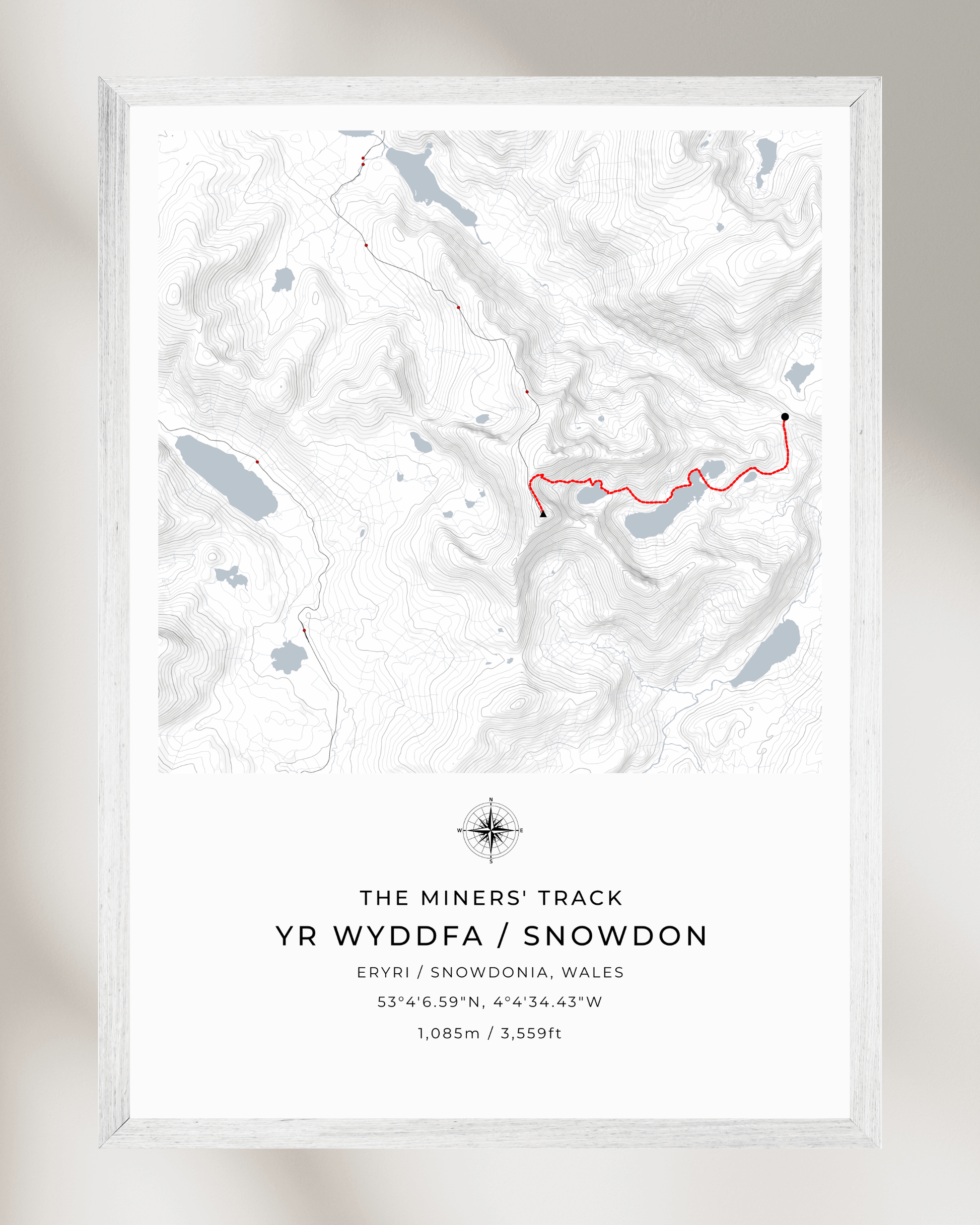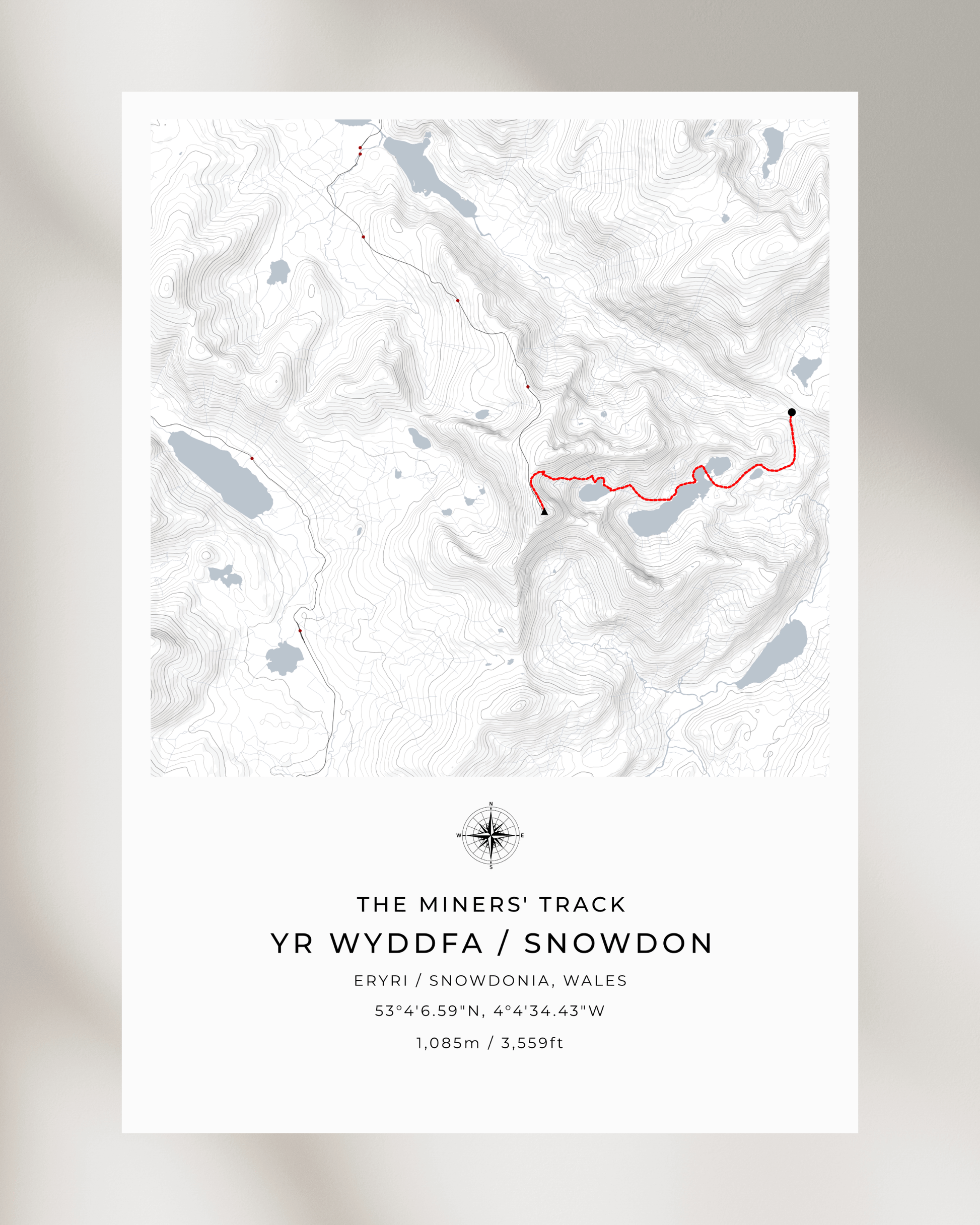 This minimalist contour map of Snowdon beautifully depicts the Miners' Track, a route steeped in history and offering some of the most stunning views of the mountain.