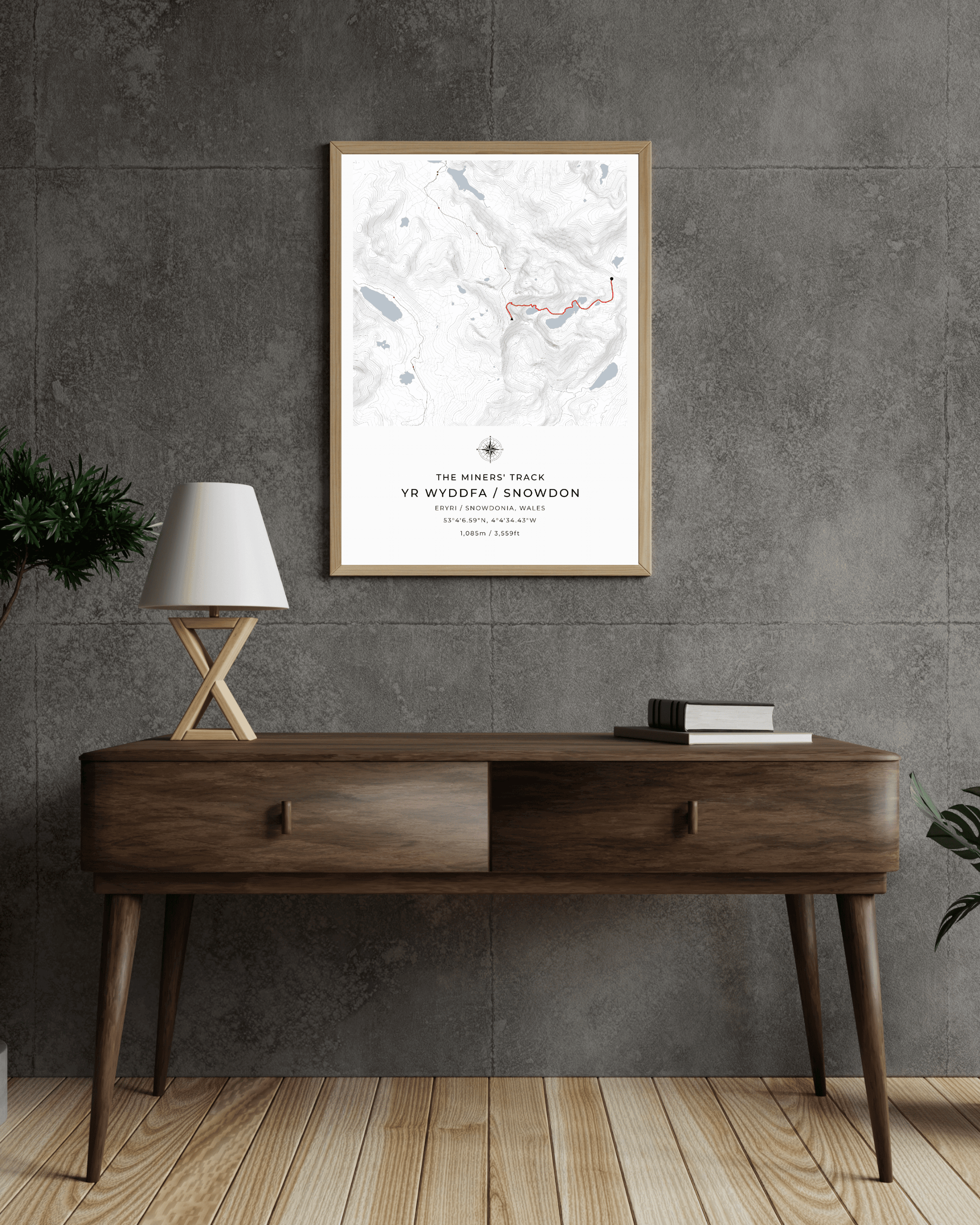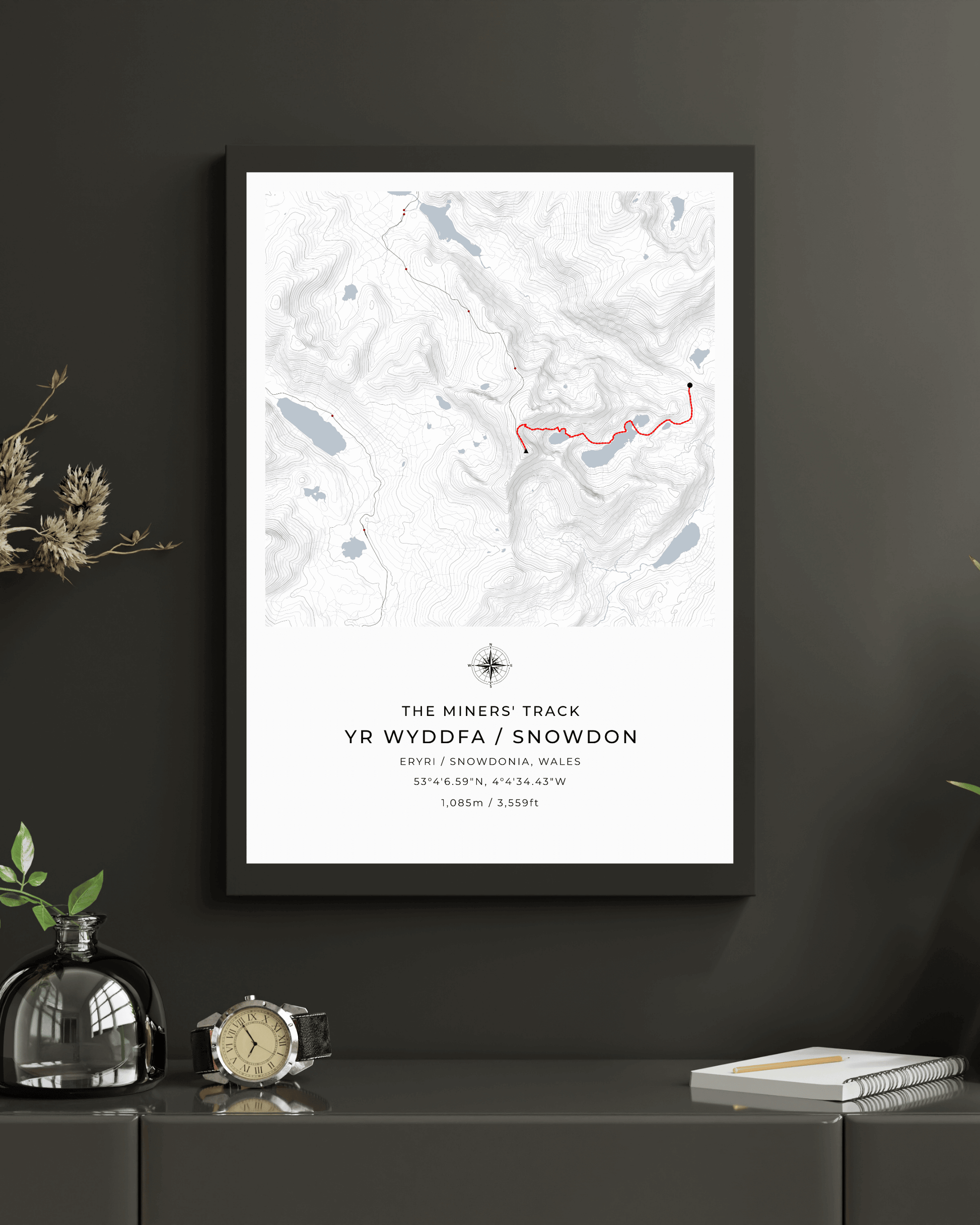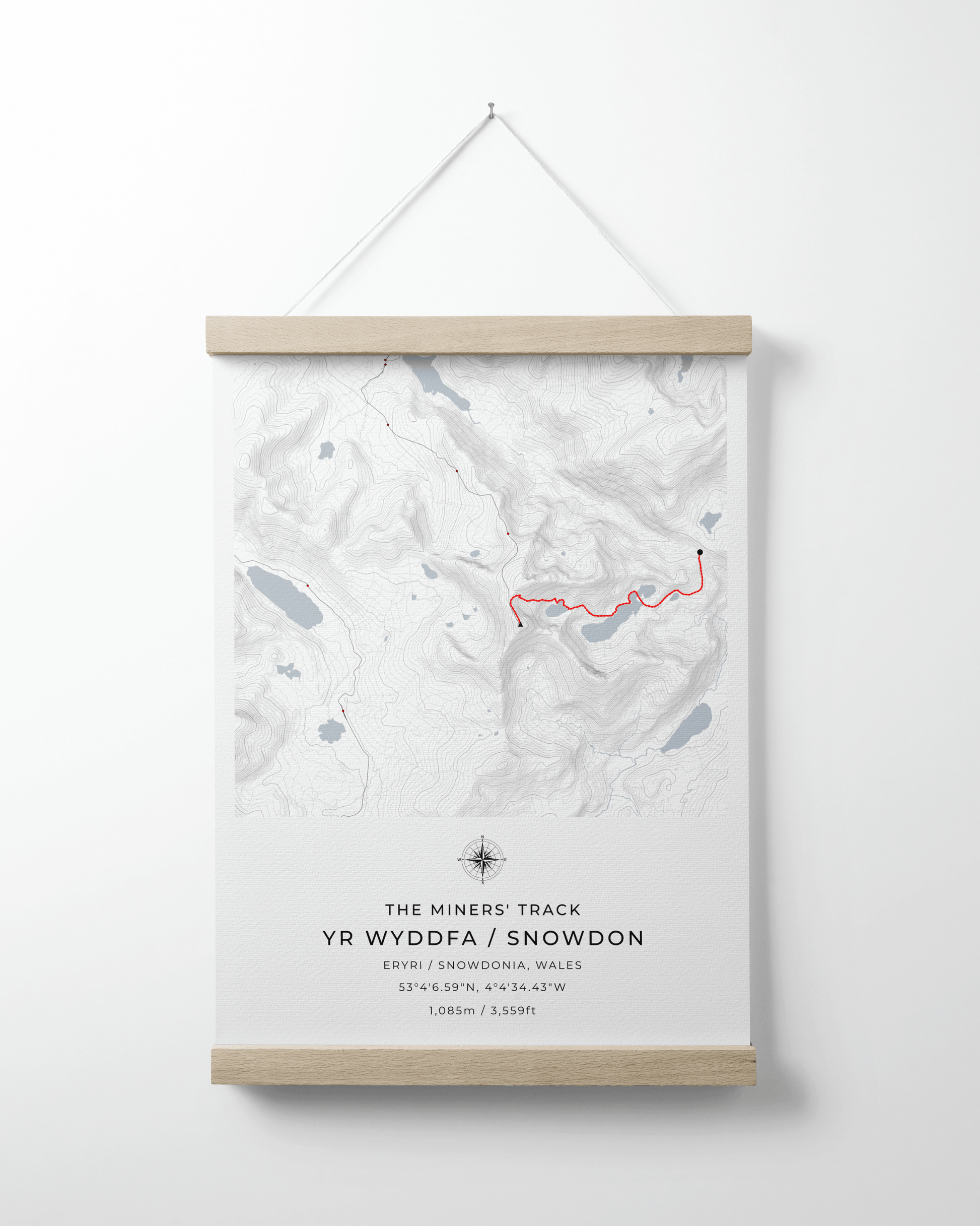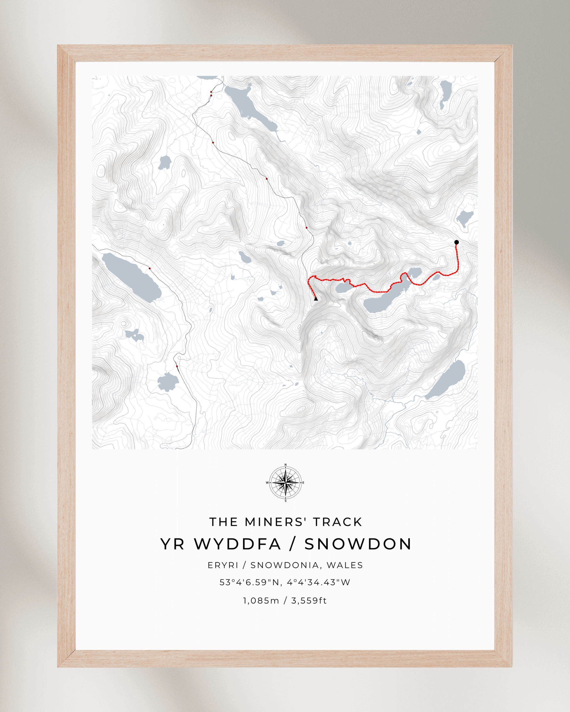 This minimalist contour map of Snowdon beautifully depicts the Miners' Track, a route steeped in history and offering some of the most stunning views of the mountain.