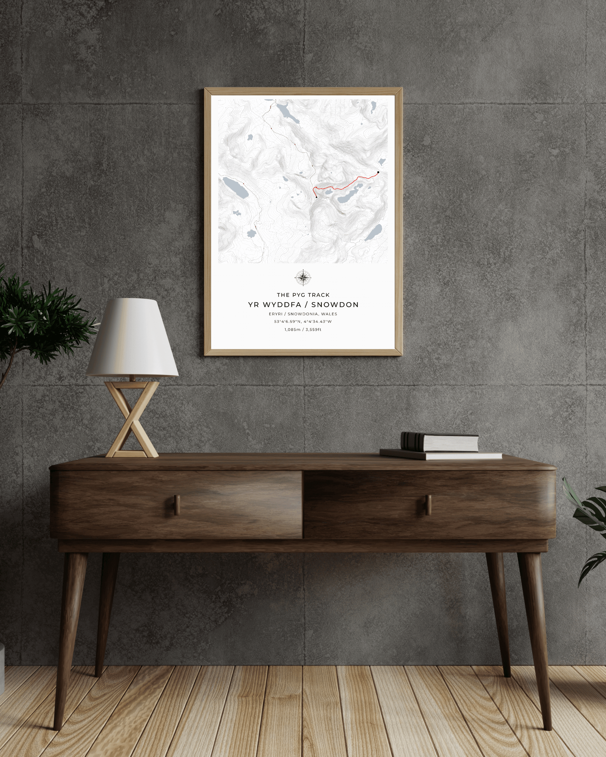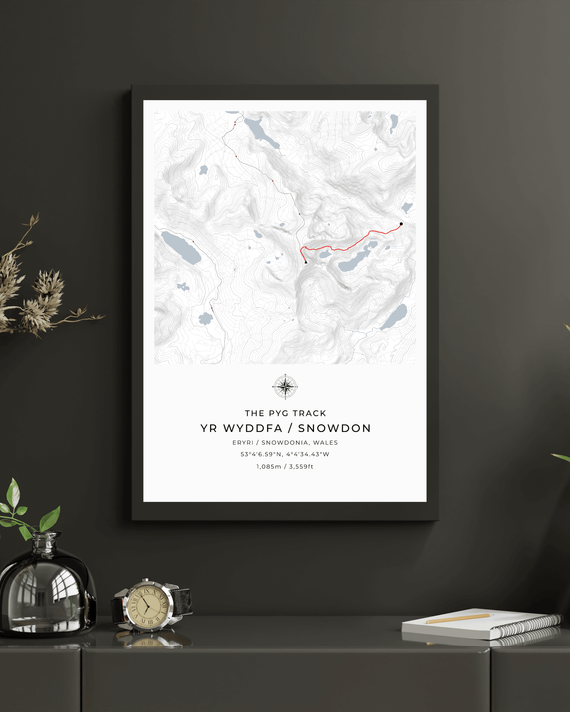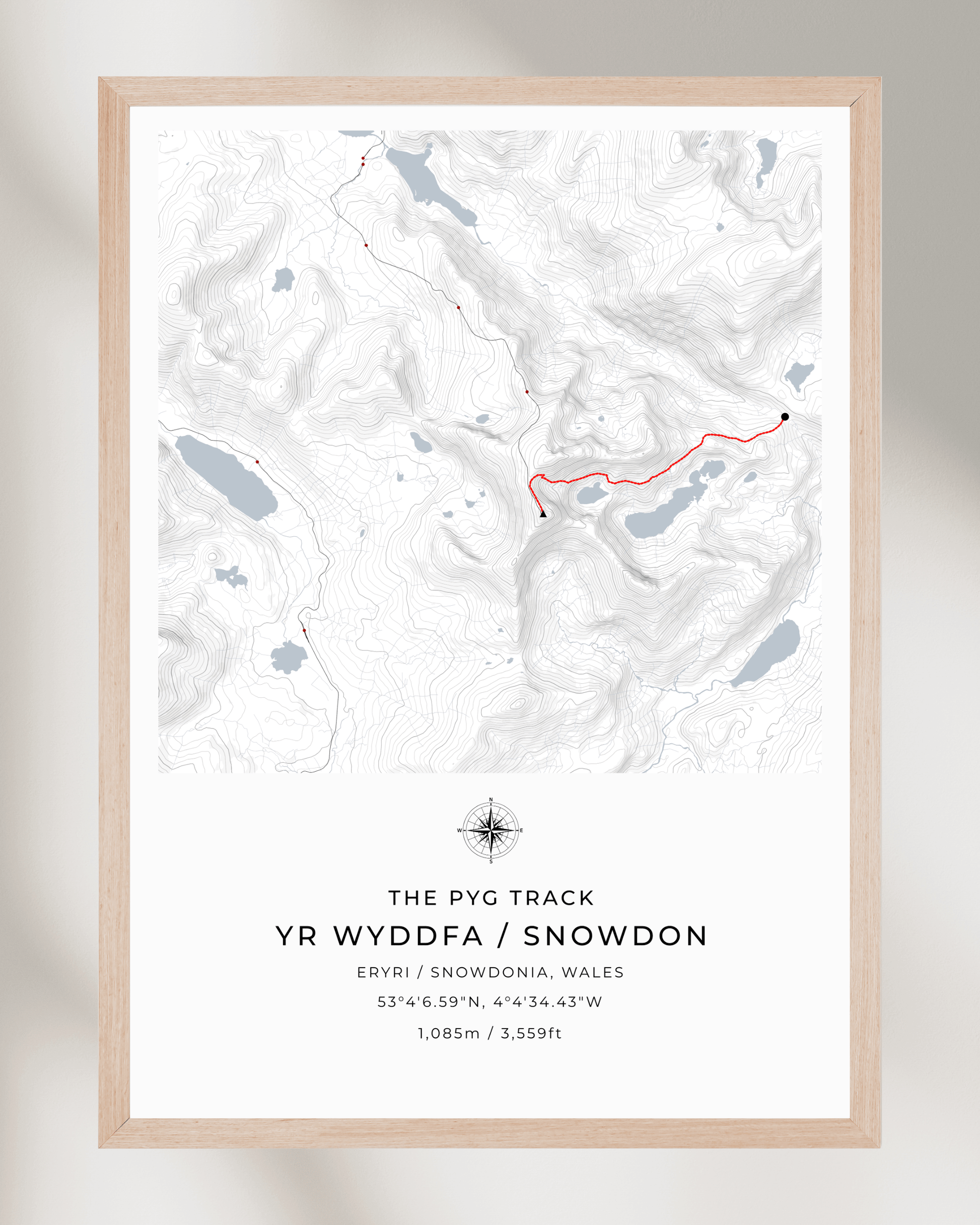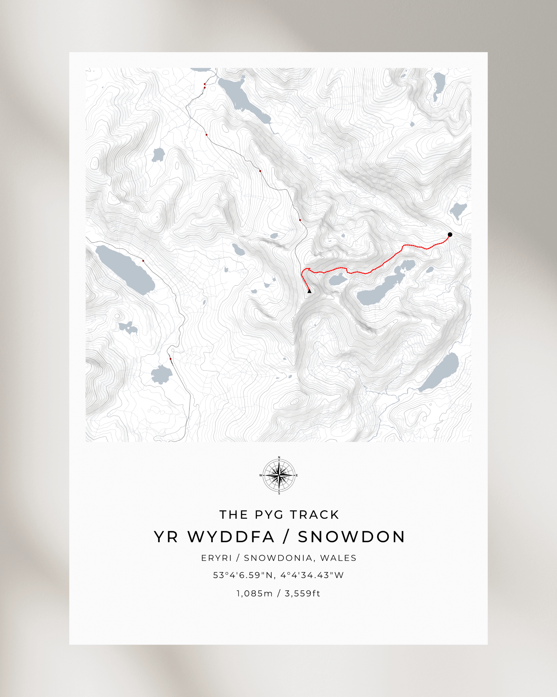 This minimalist contour map of Snowdon showcases the iconic Pyg Track, one of the most popular routes to the summit of Wales’ highest peak. Designed with clean lines and precision, this elegant map captures the rugged beauty and challenging terrain of Snowdon’s landscape, allowing you to bring a piece of this unforgettable journey into your home.