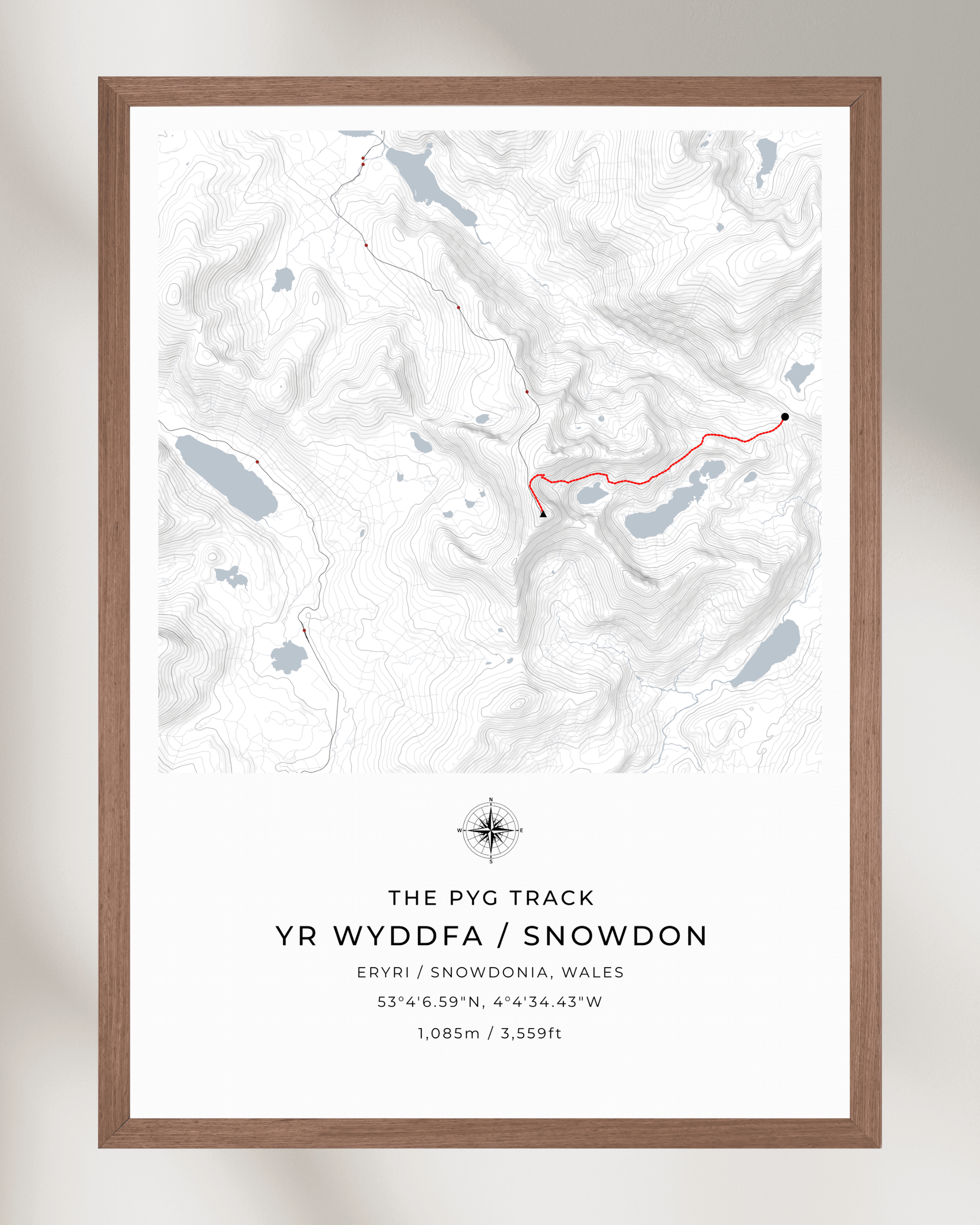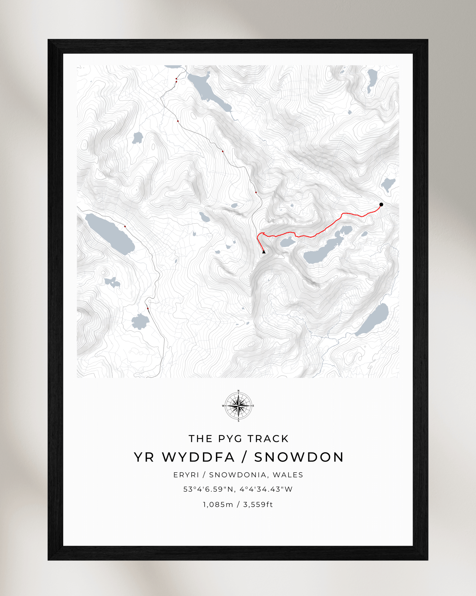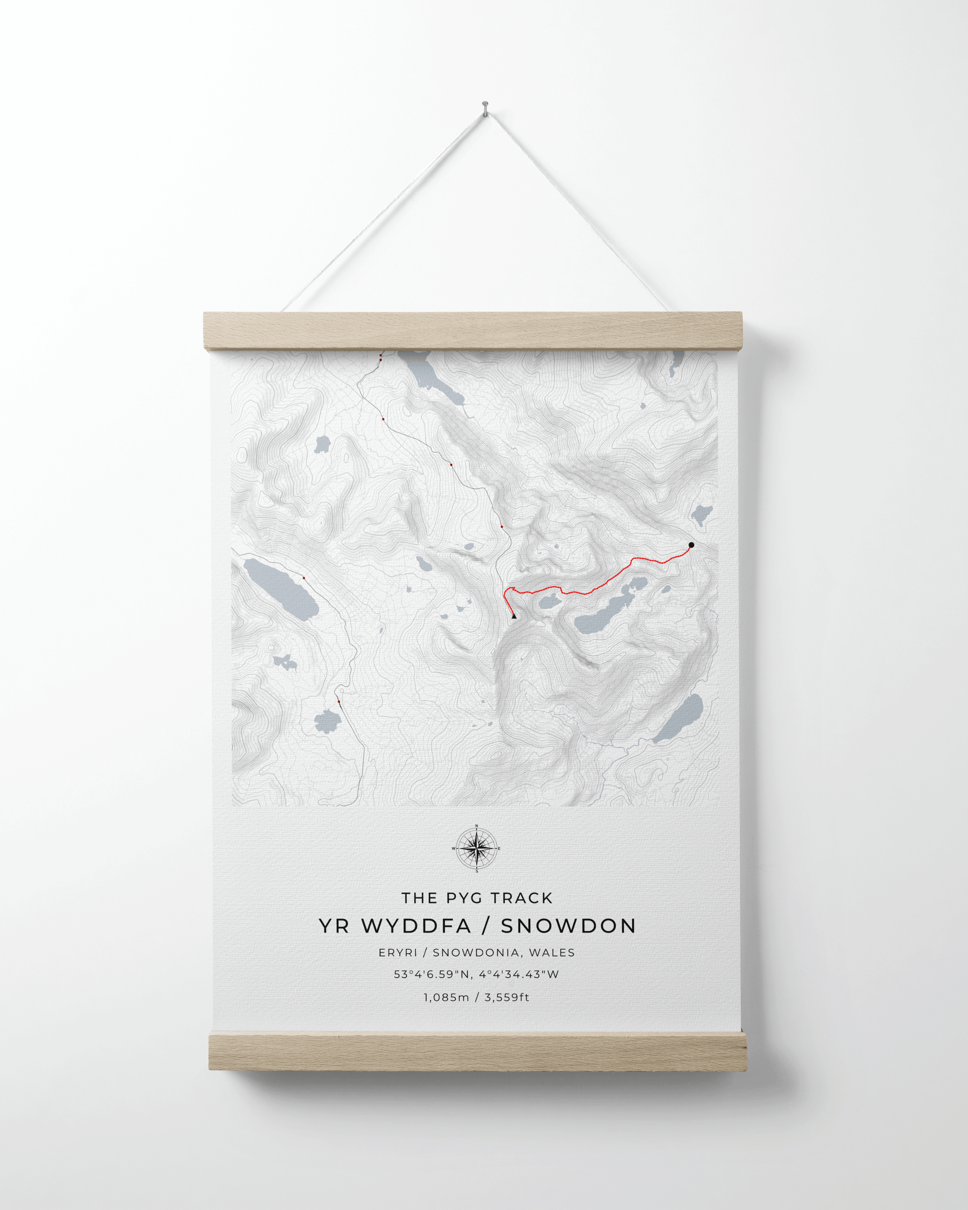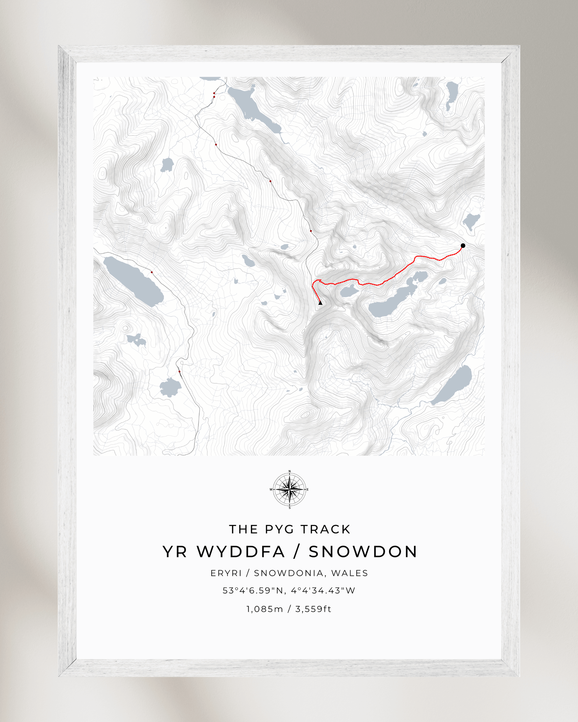 This minimalist contour map of Snowdon showcases the iconic Pyg Track, one of the most popular routes to the summit of Wales’ highest peak. Designed with clean lines and precision, this elegant map captures the rugged beauty and challenging terrain of Snowdon’s landscape, allowing you to bring a piece of this unforgettable journey into your home.