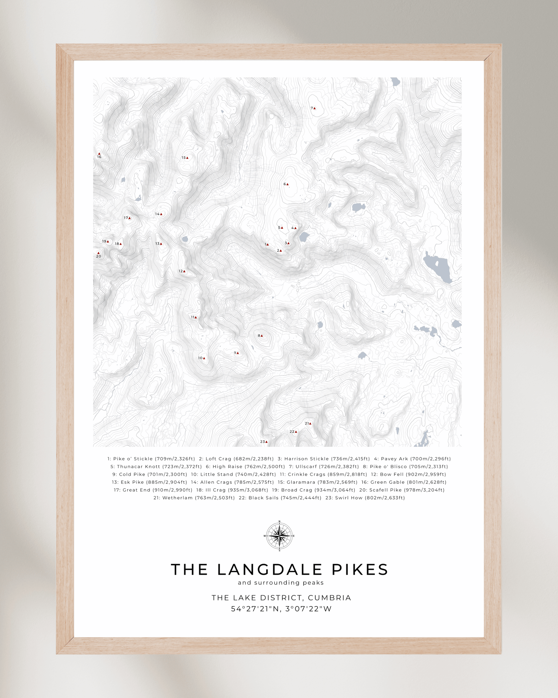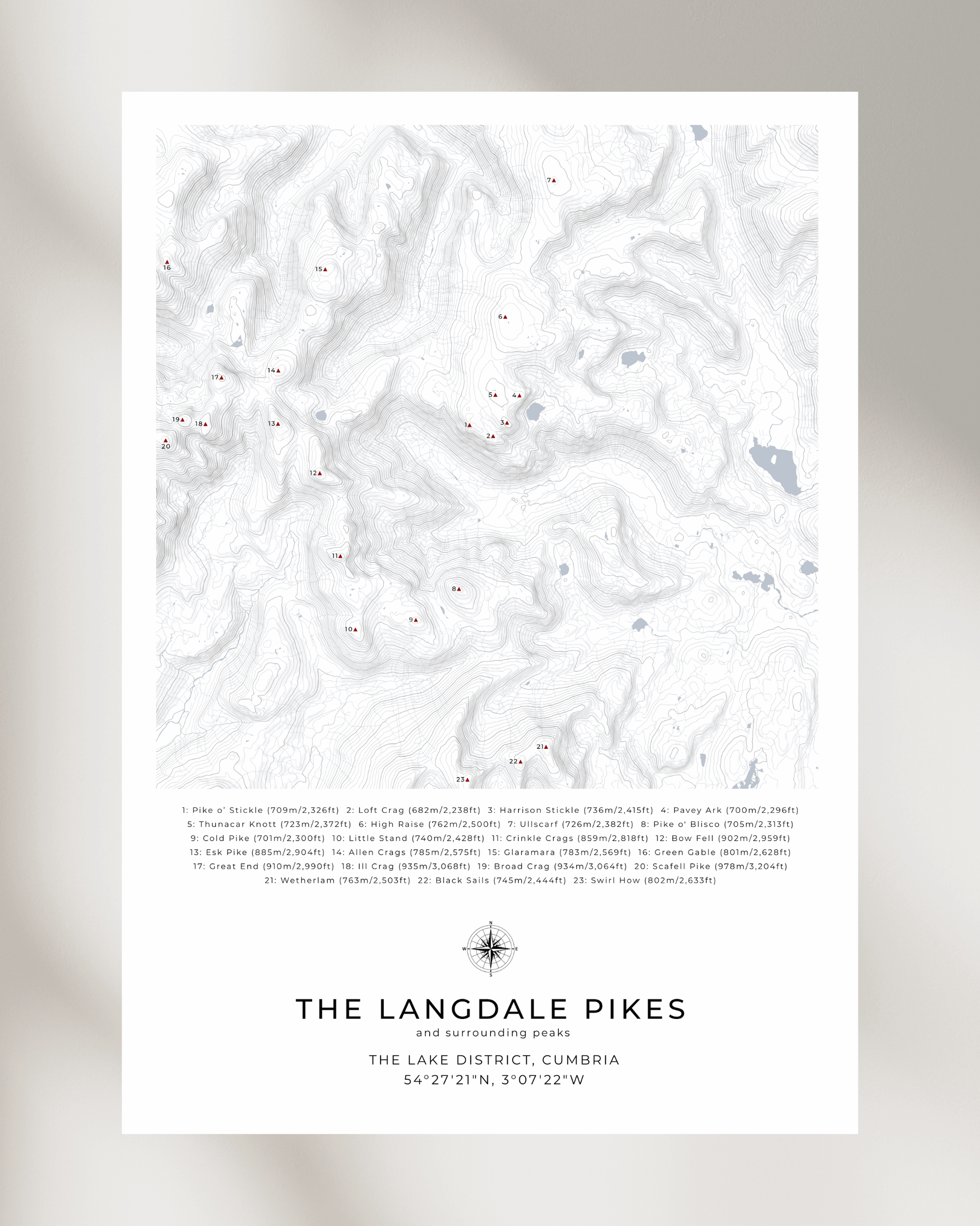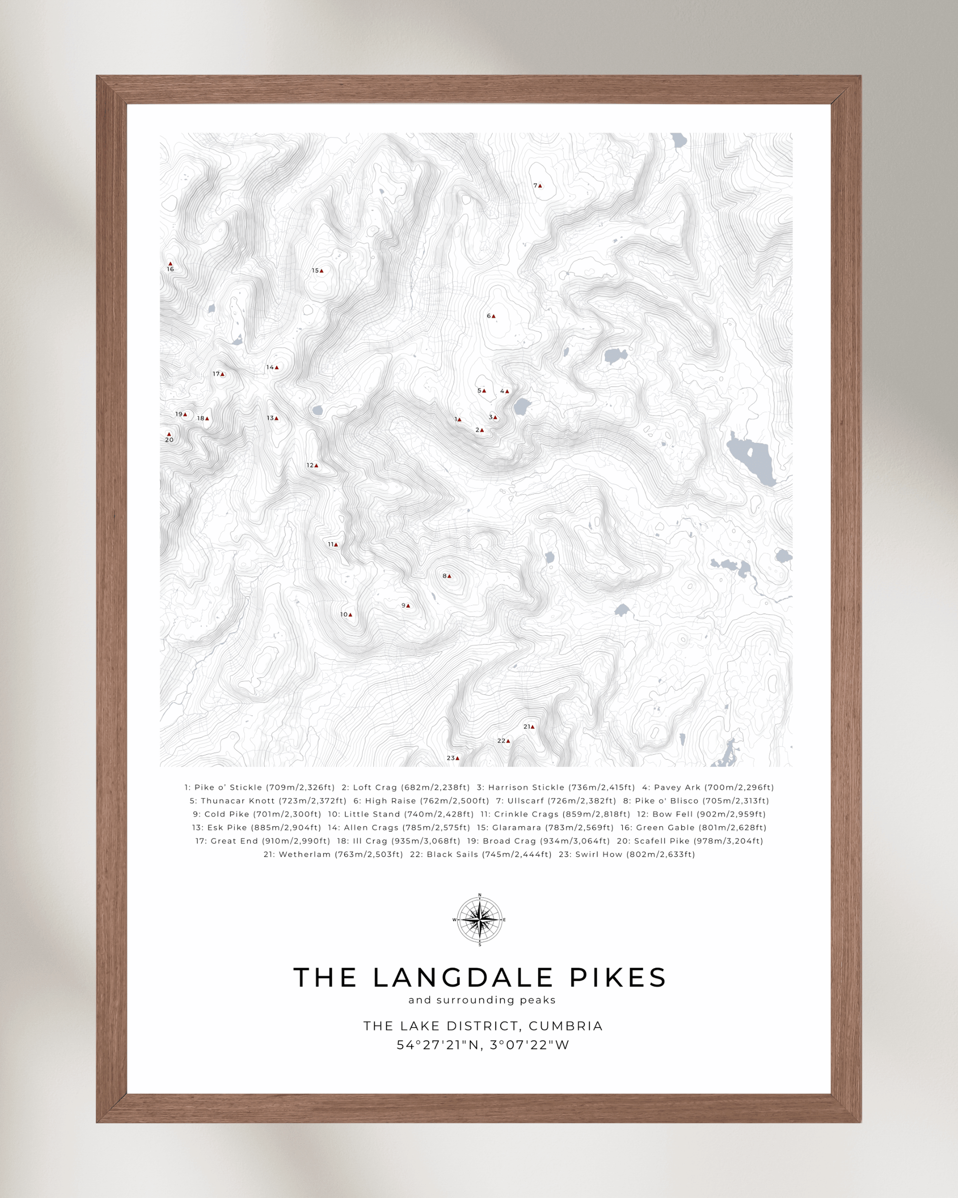 A beautiful contour map of The Langdale Pikes and surrounding peaks, including: