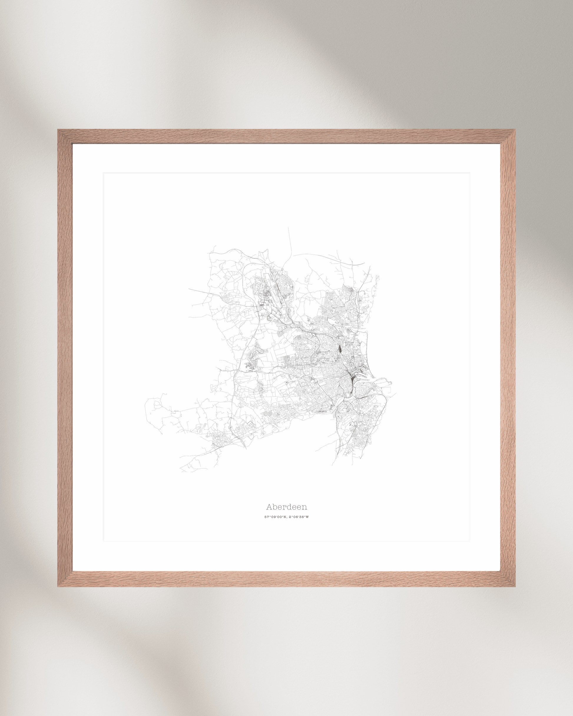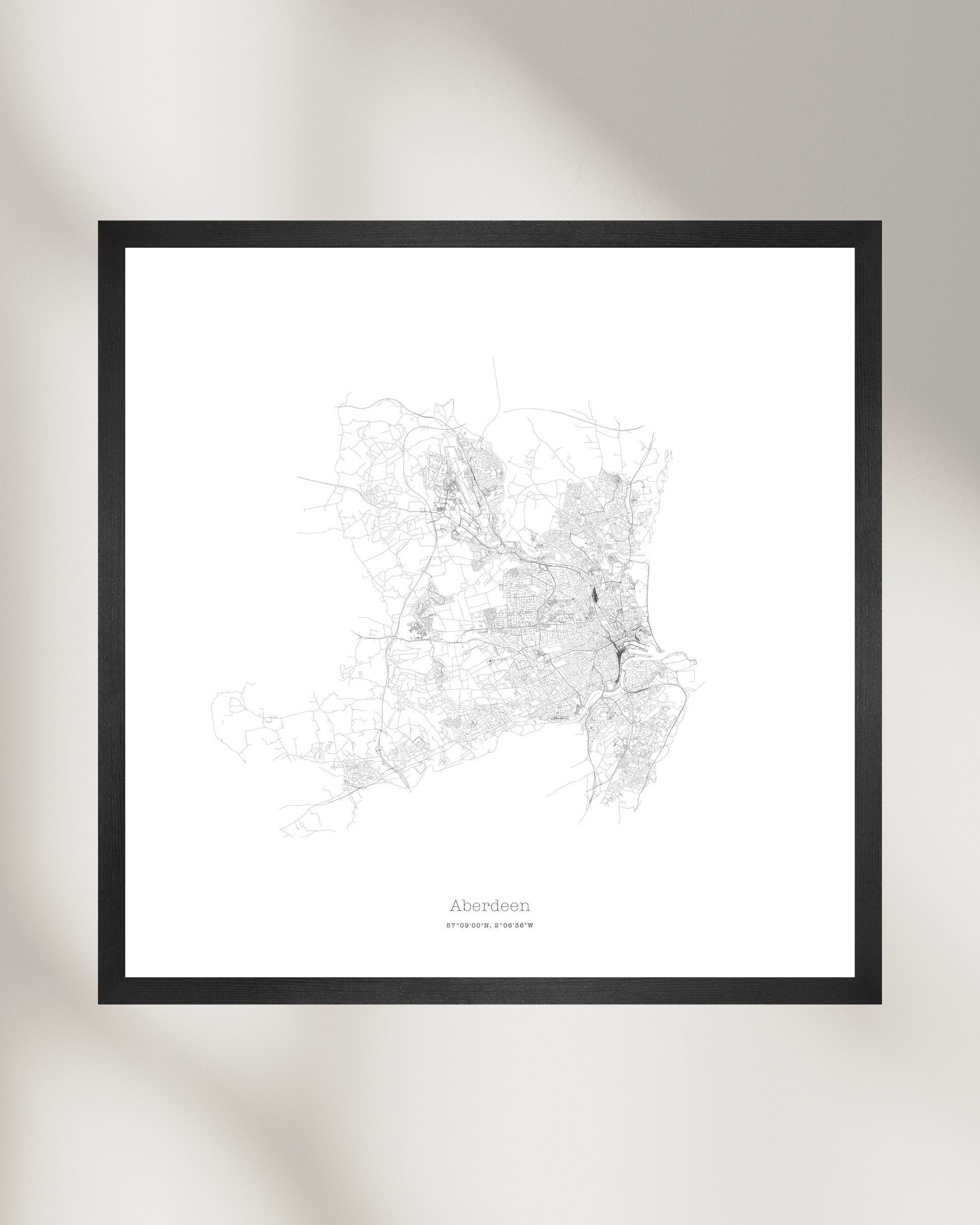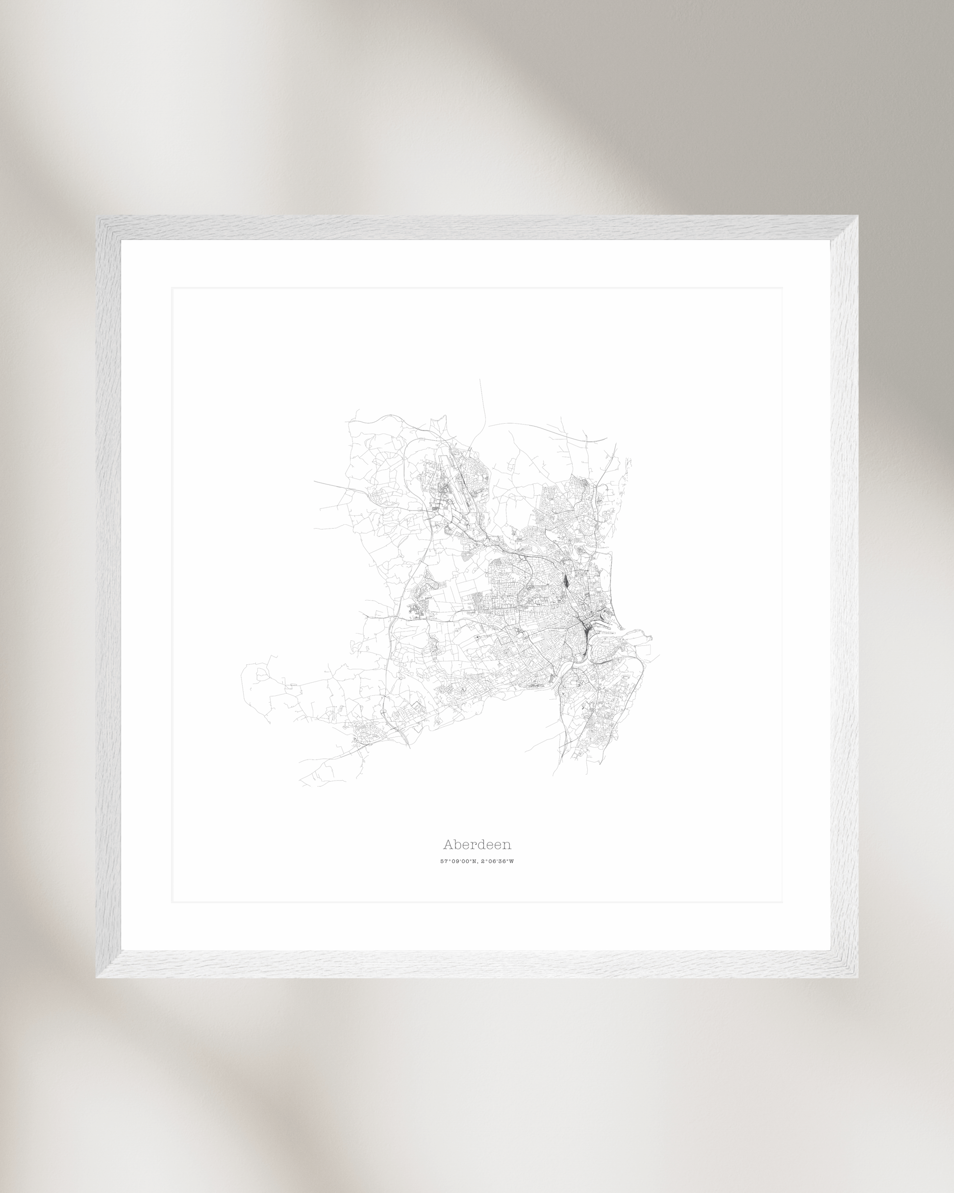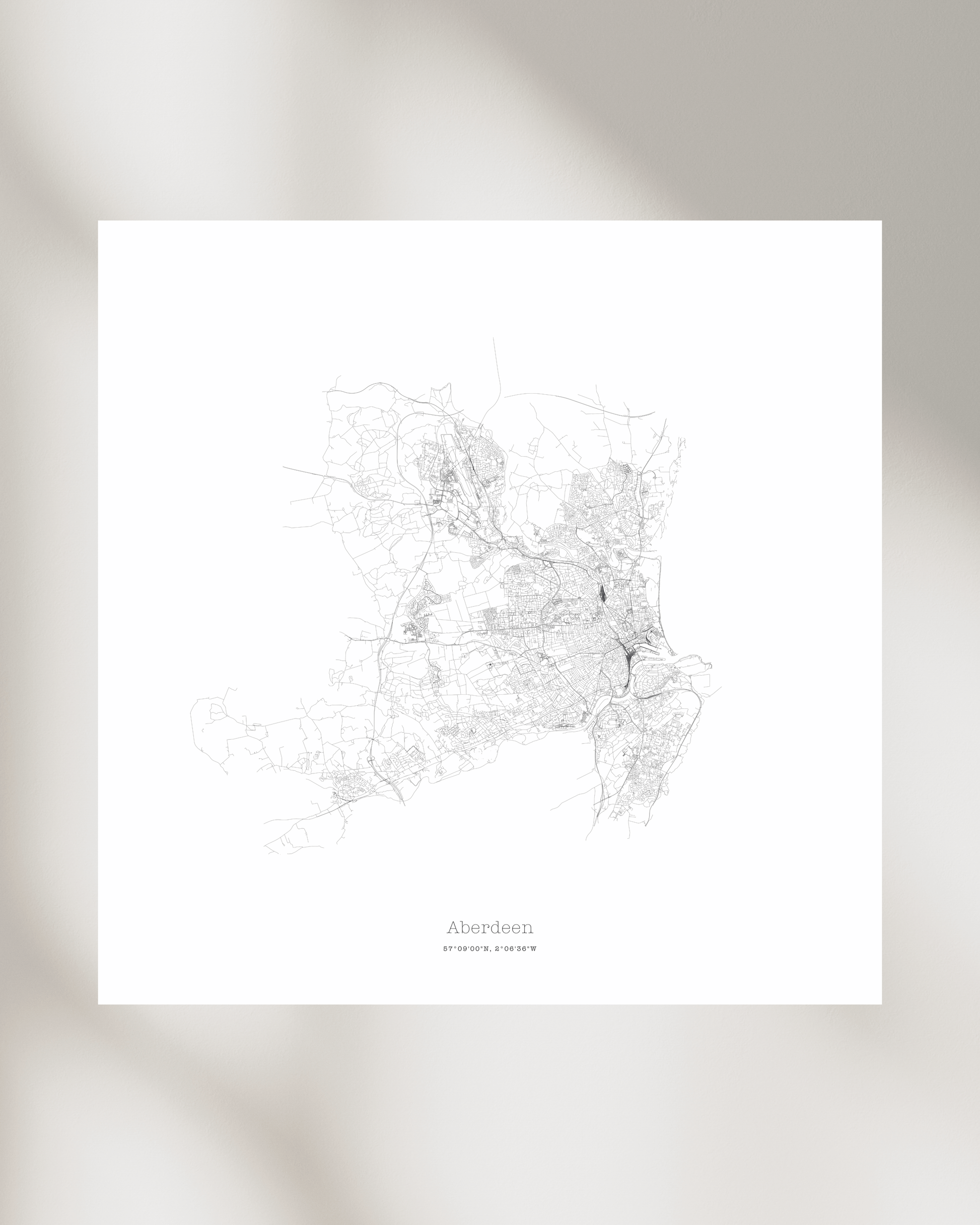 A highly detailed line map of Aberdeen in stunning minimalist detail.