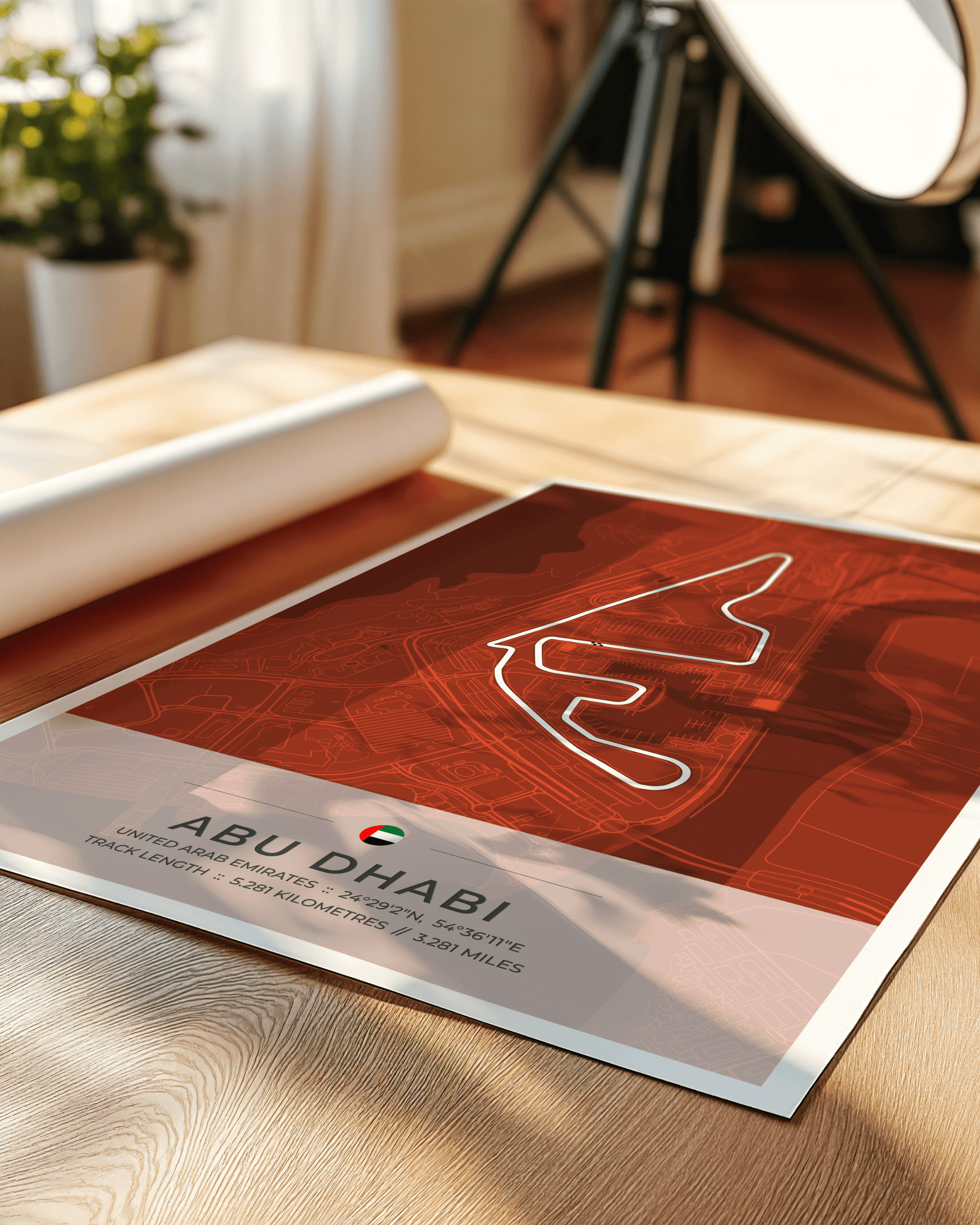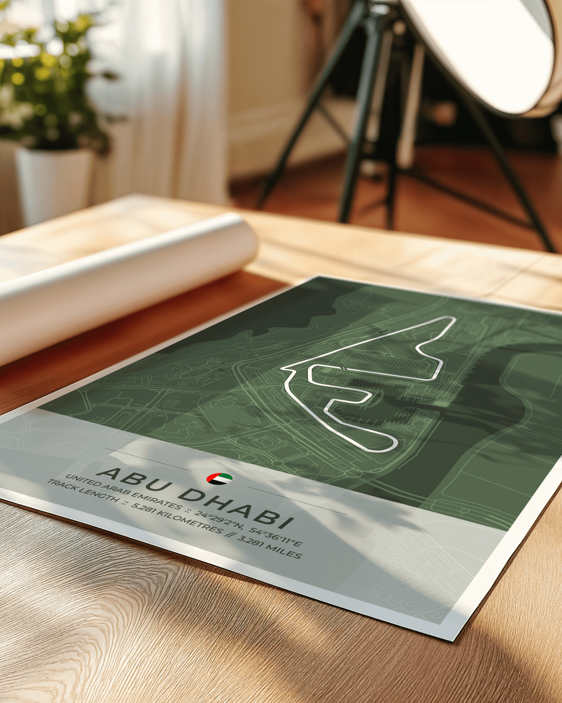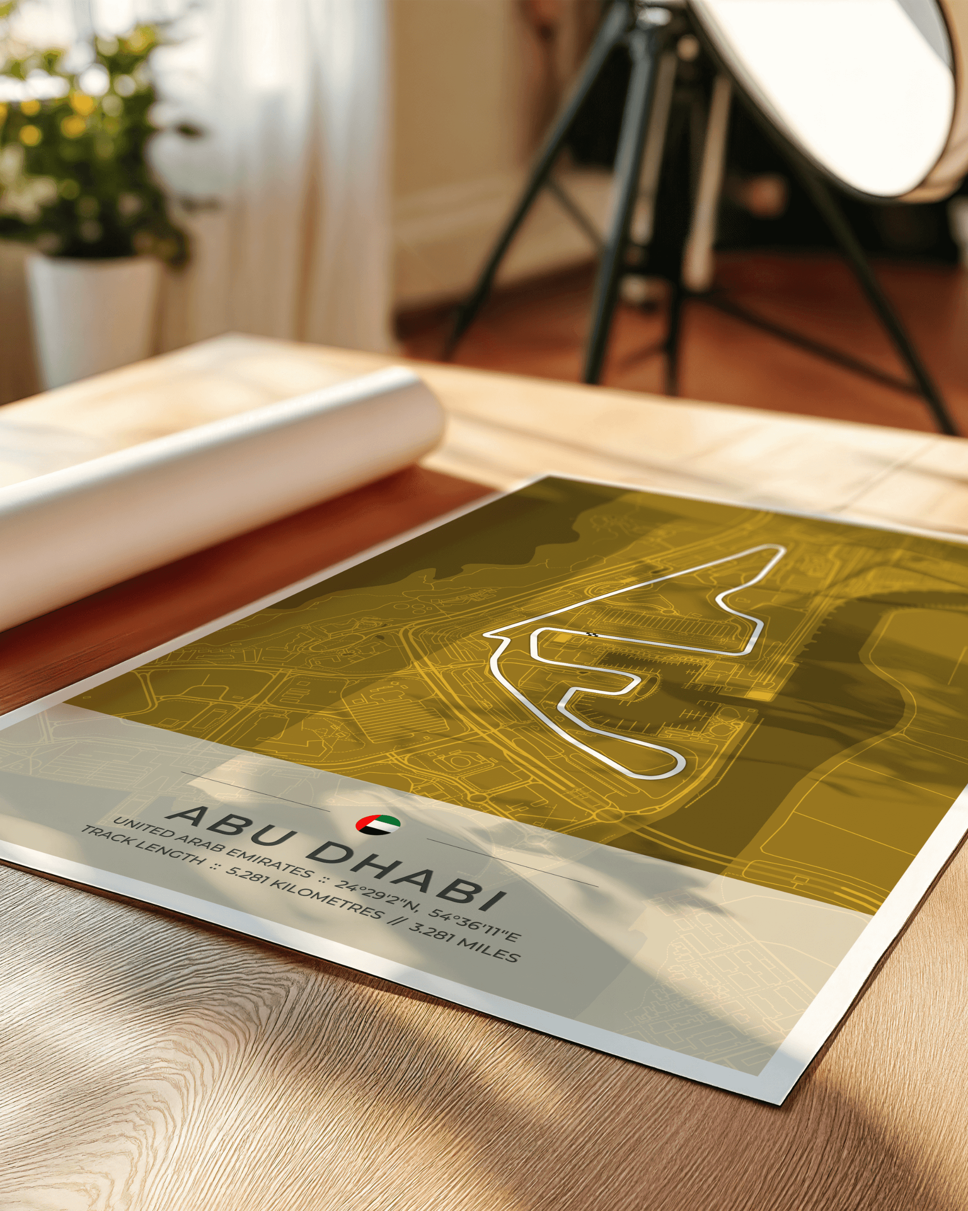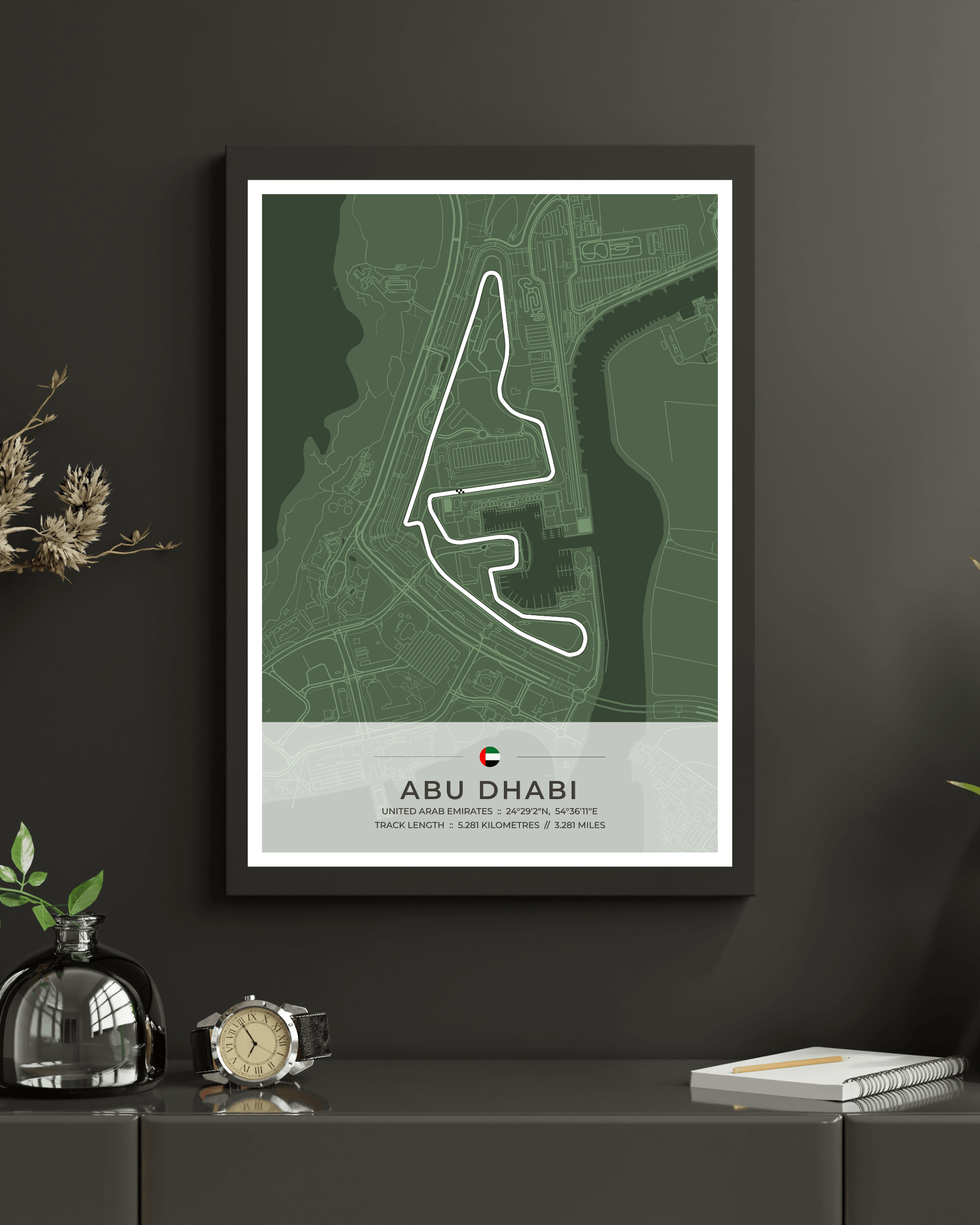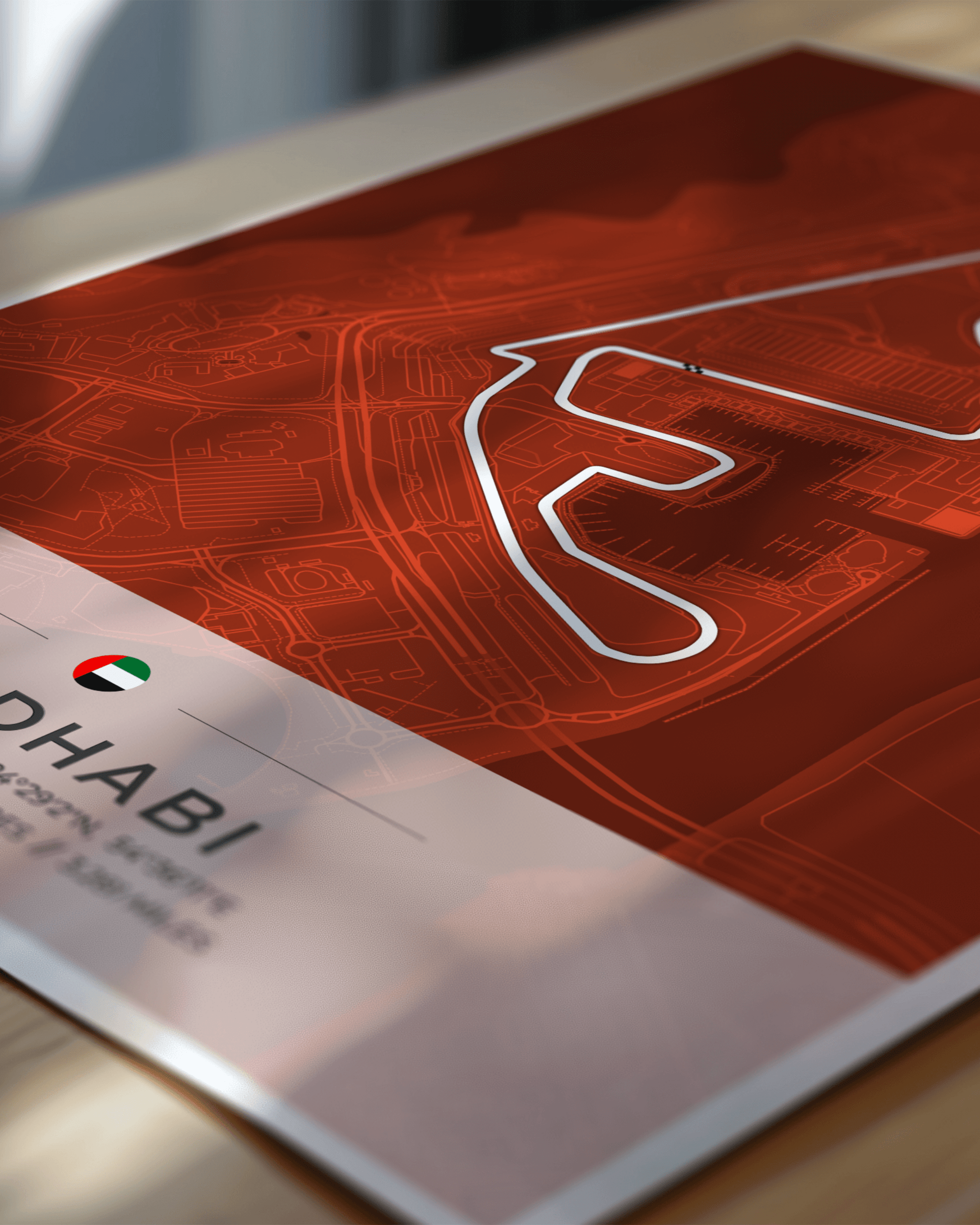 A stunning, highly accurate map of the Abu Dhabi Yas Marina Circuit, together with location coordinates, country flag and track length in both kilometres and miles.