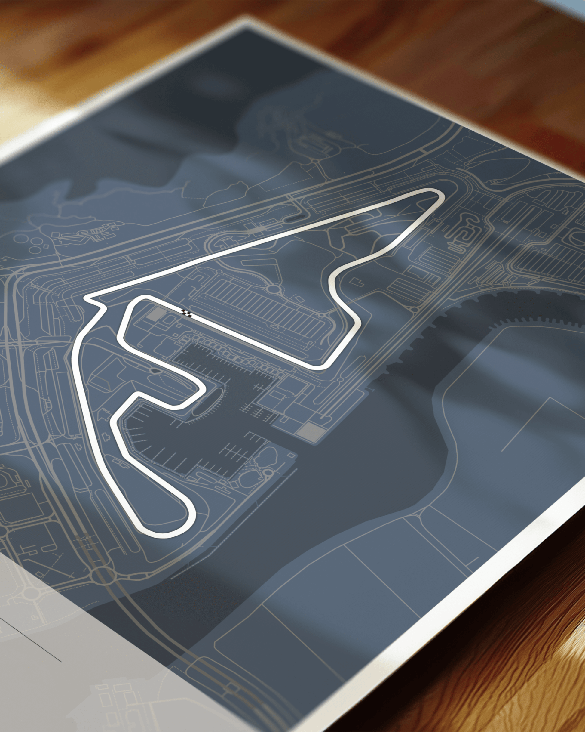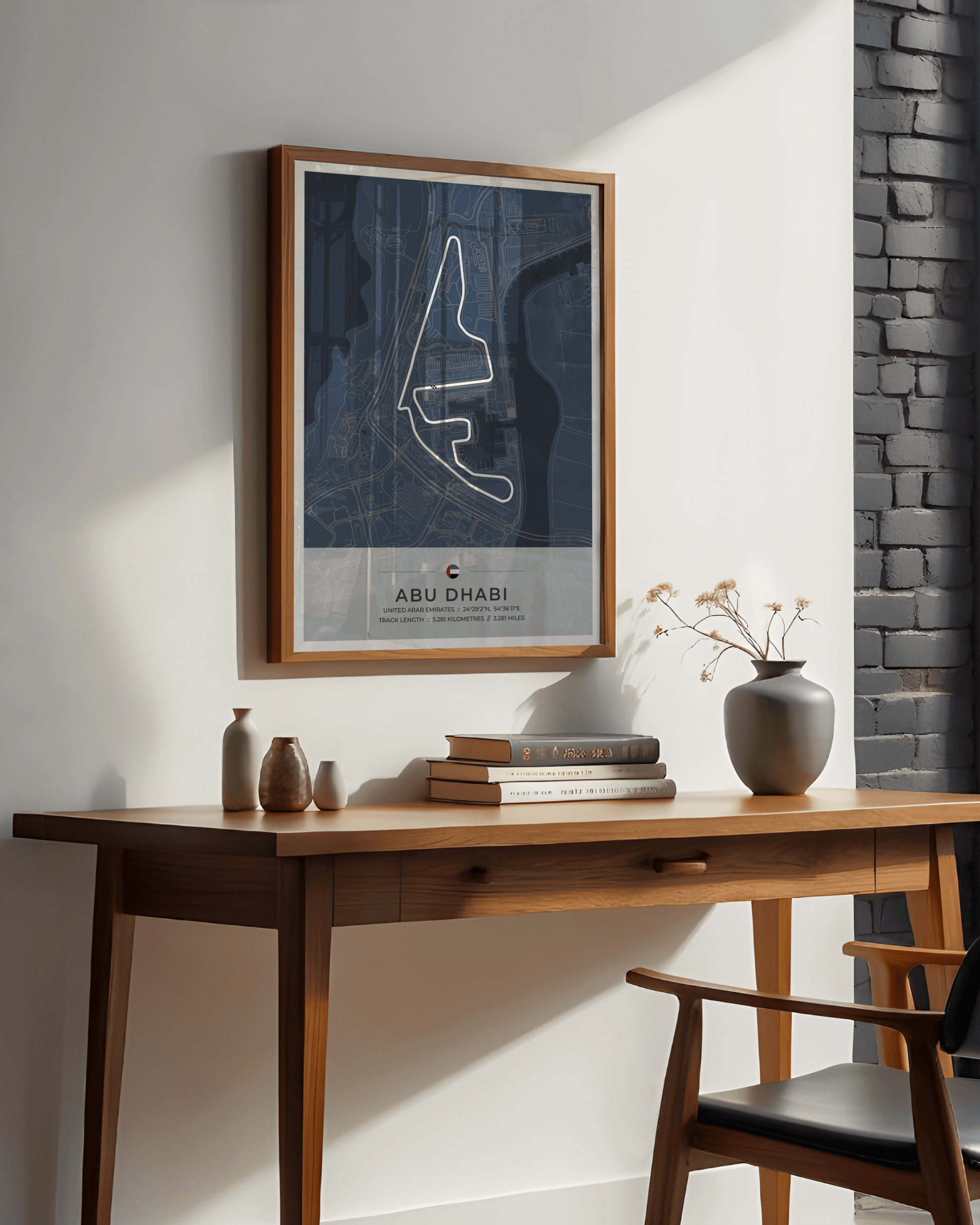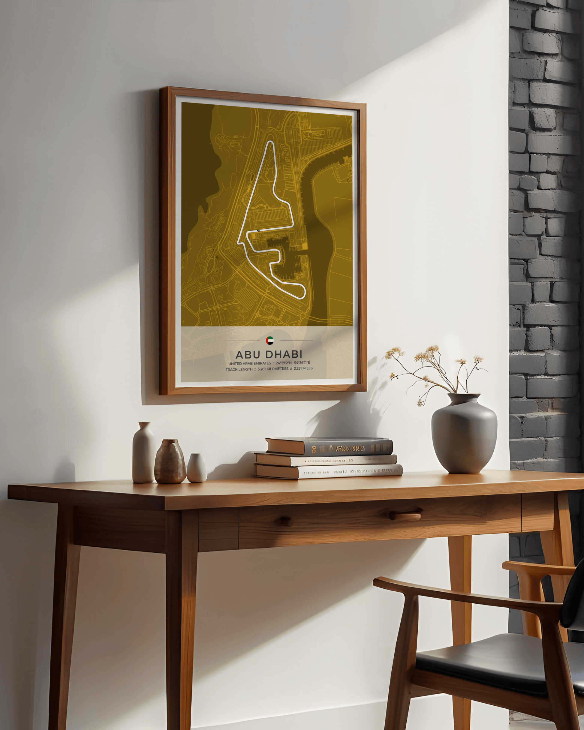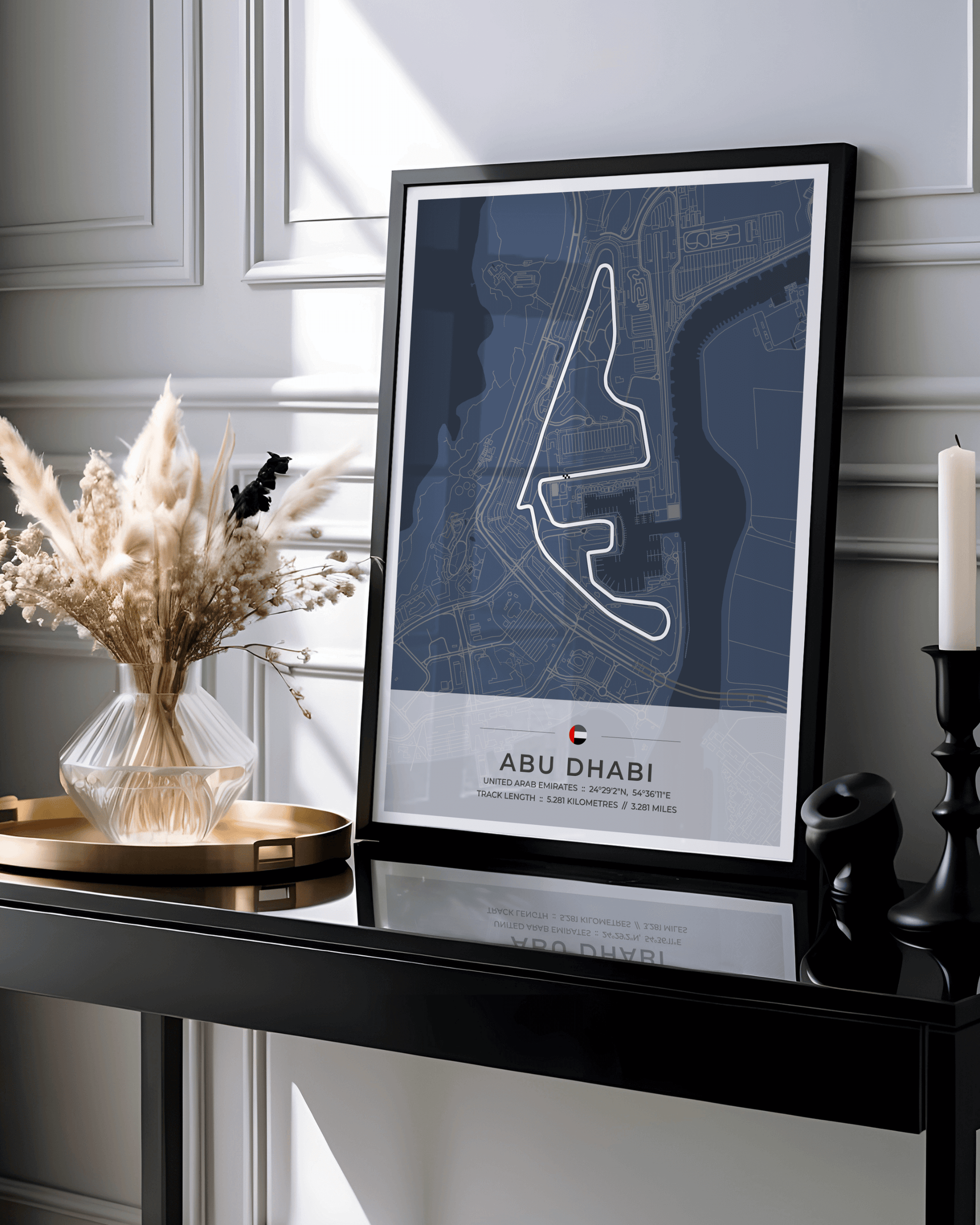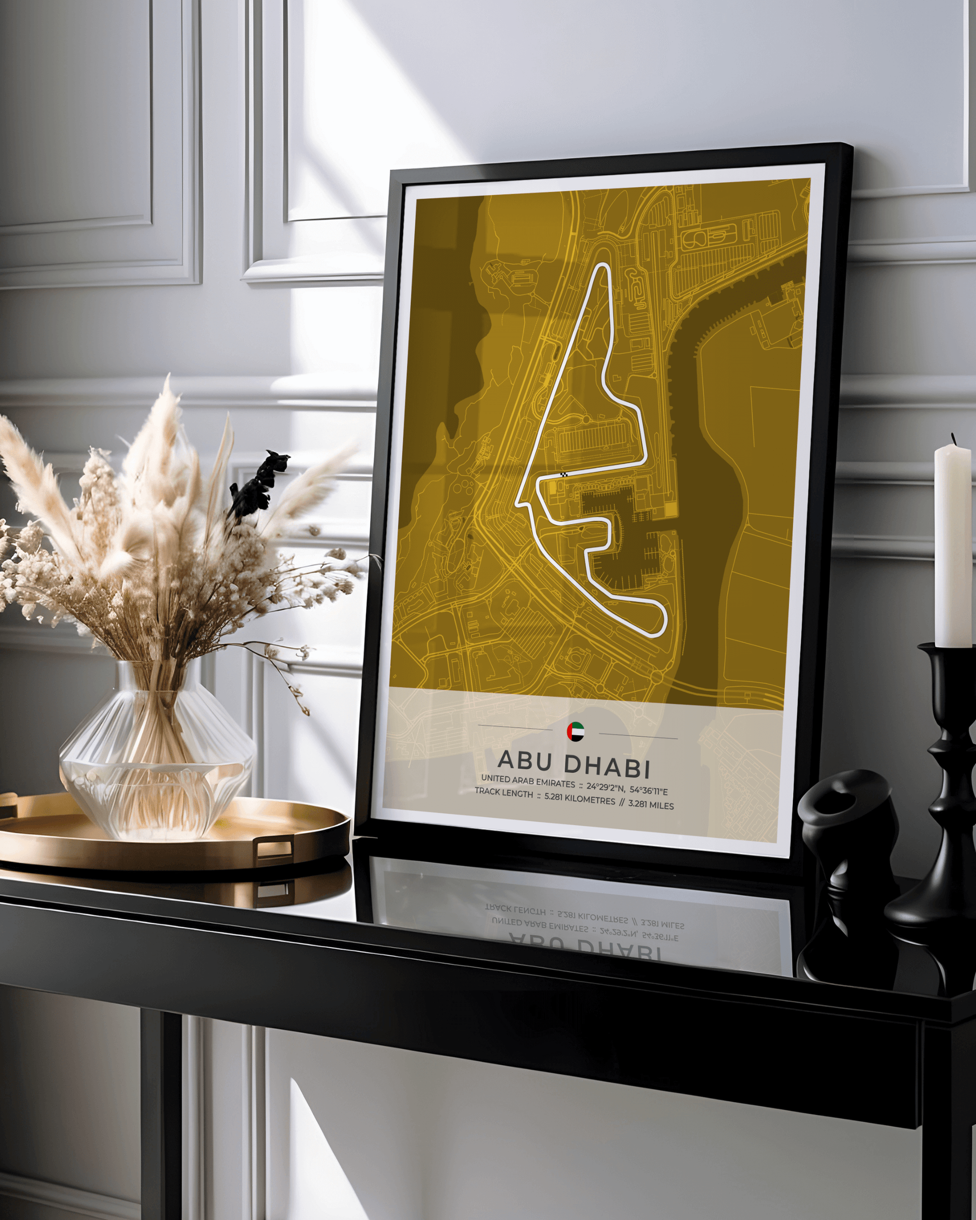 A stunning, highly accurate map of the Abu Dhabi Yas Marina Circuit, together with location coordinates, country flag and track length in both kilometres and miles.