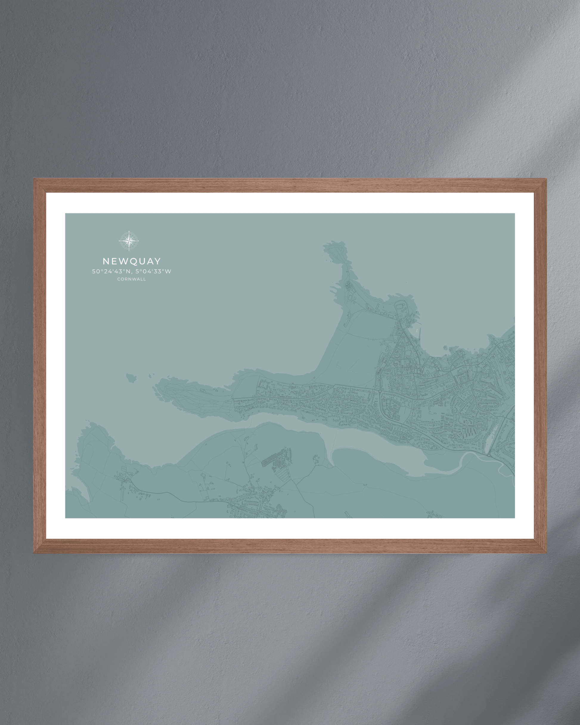 This fine art coastal map offers a detailed portrayal of Newquay, a prominent coastal town on Cornwall’s north shore known for its sweeping beaches, surf culture, and dramatic Atlantic views.
