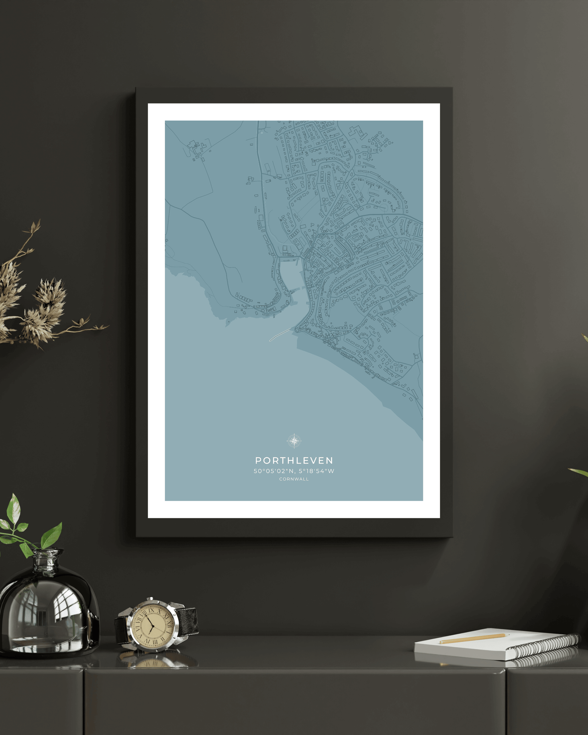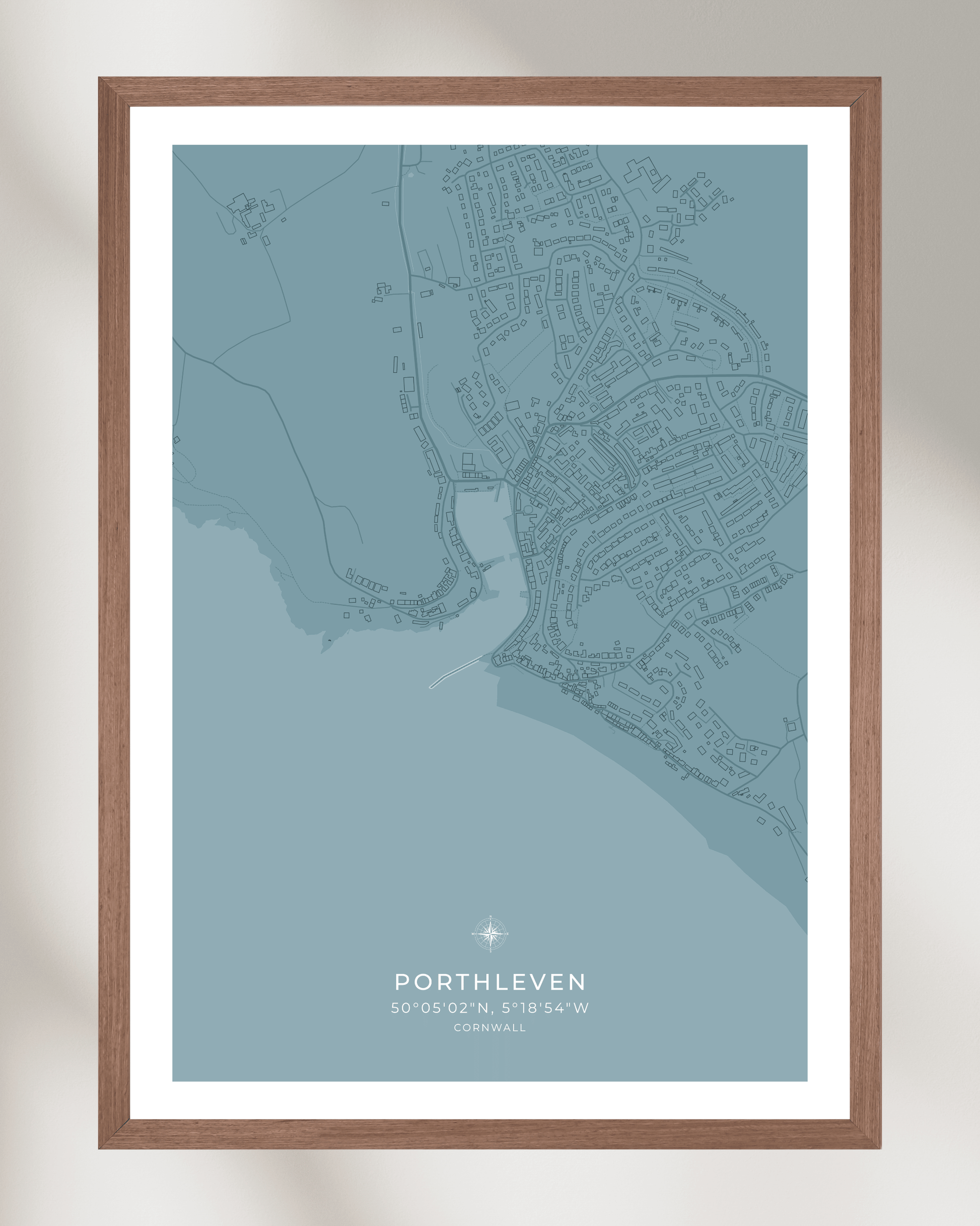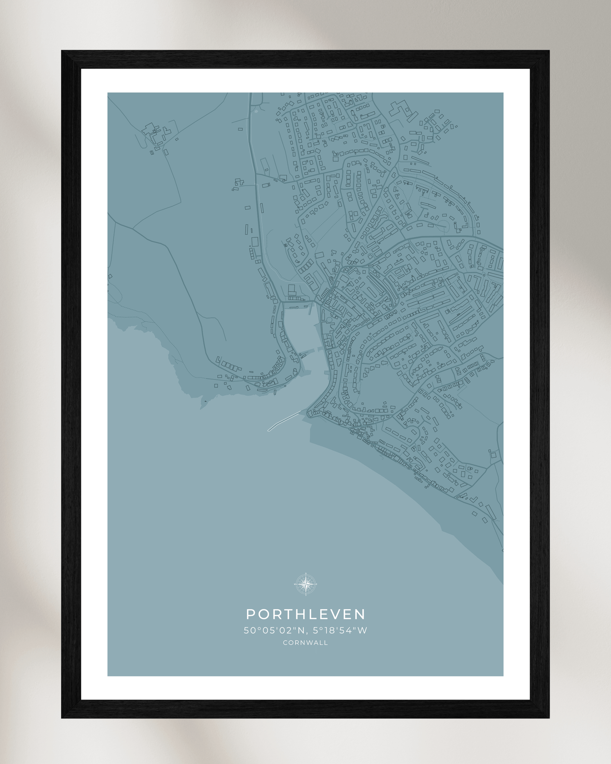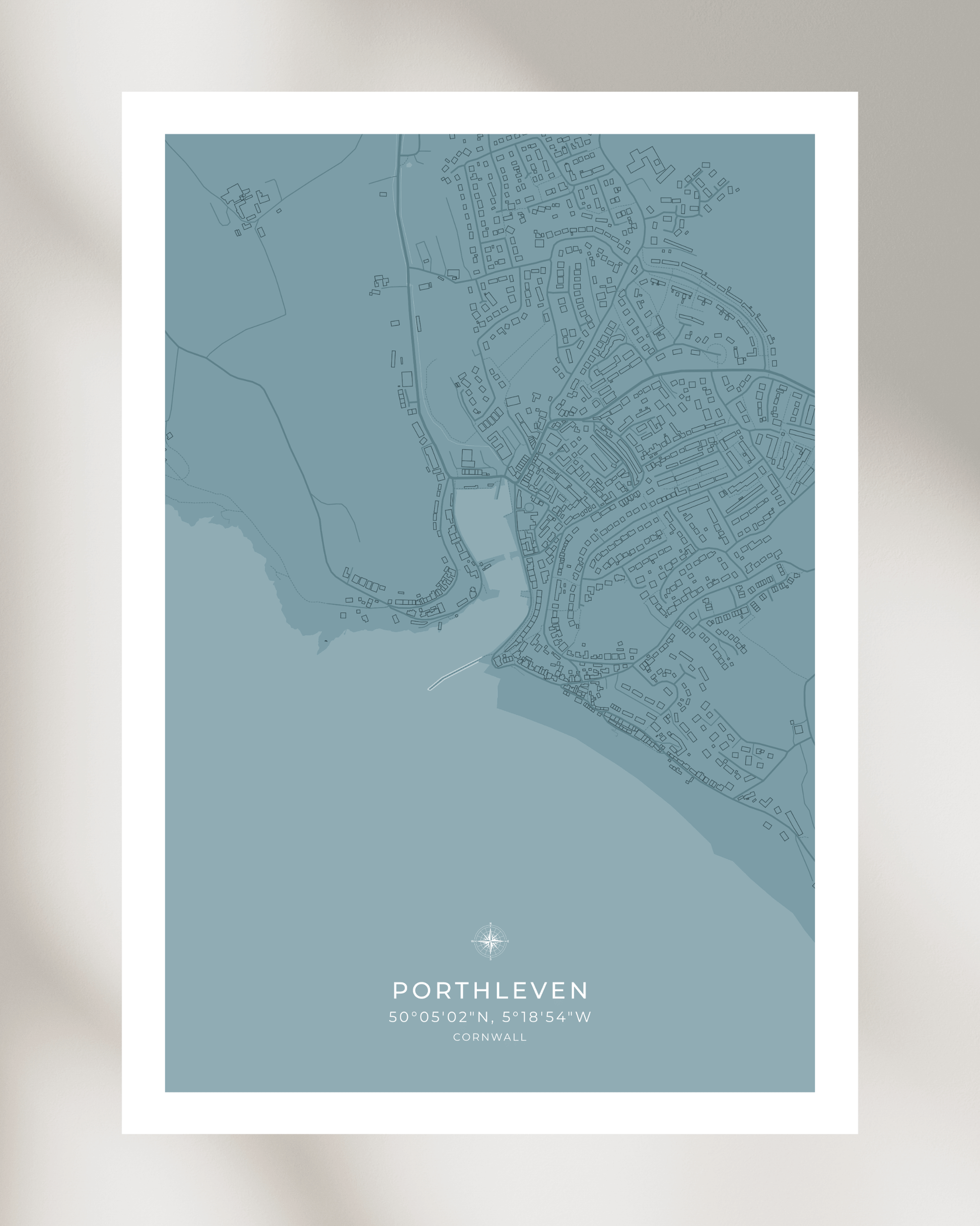 This fine art coastal map offers a detailed representation of Porthleven, a historic fishing port on Cornwall’s rugged south coast.