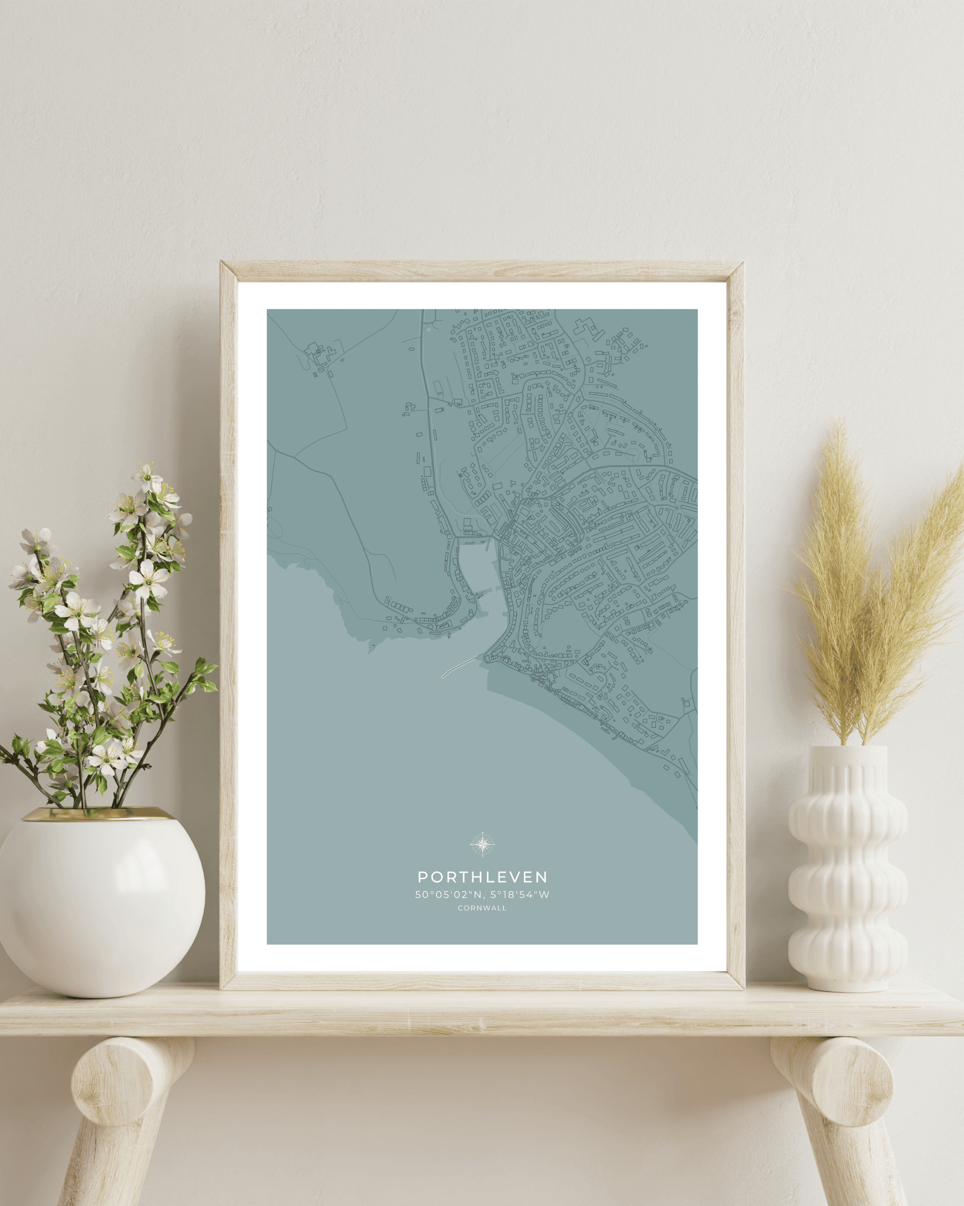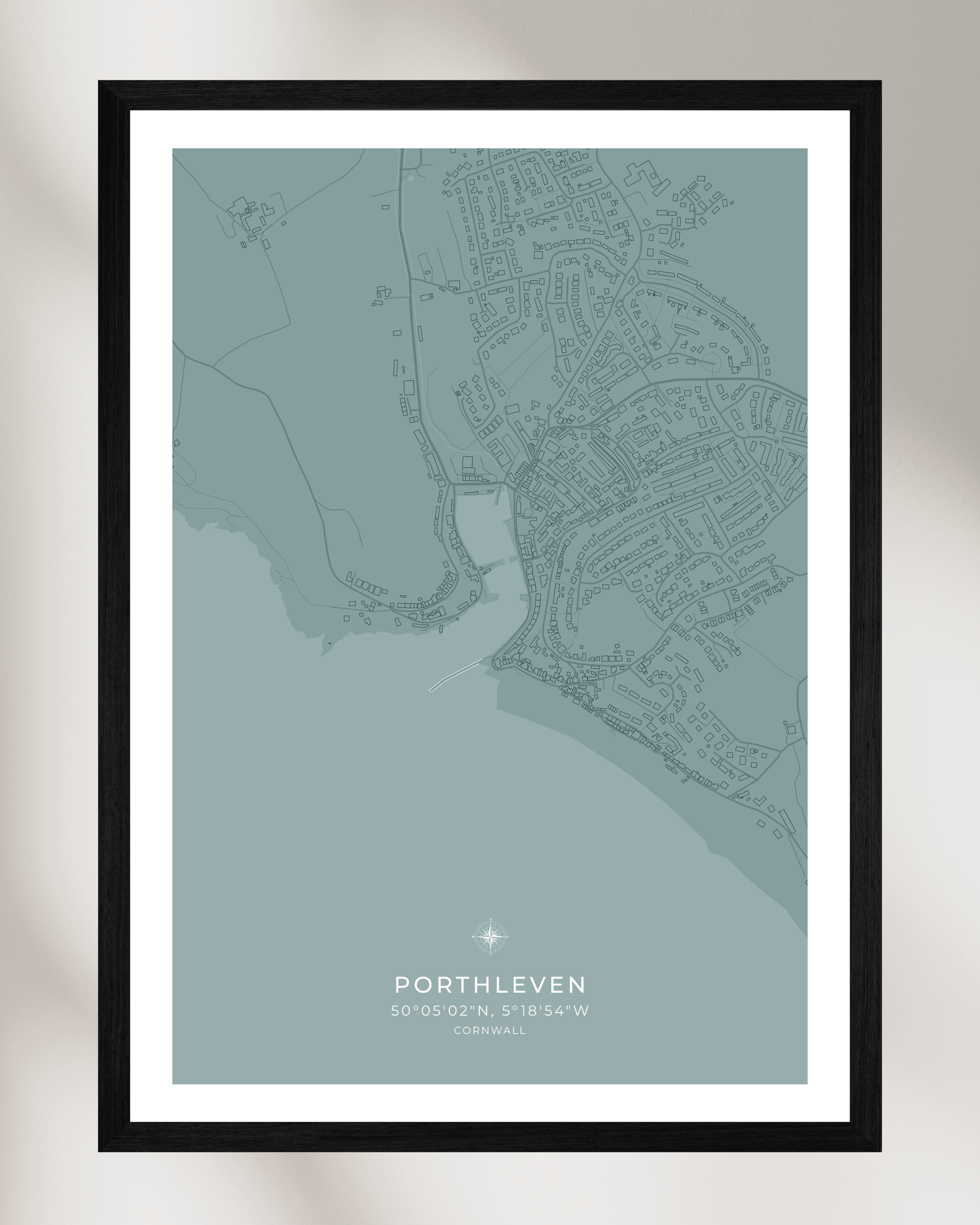 This fine art coastal map offers a detailed representation of Porthleven, a historic fishing port on Cornwall’s rugged south coast.
