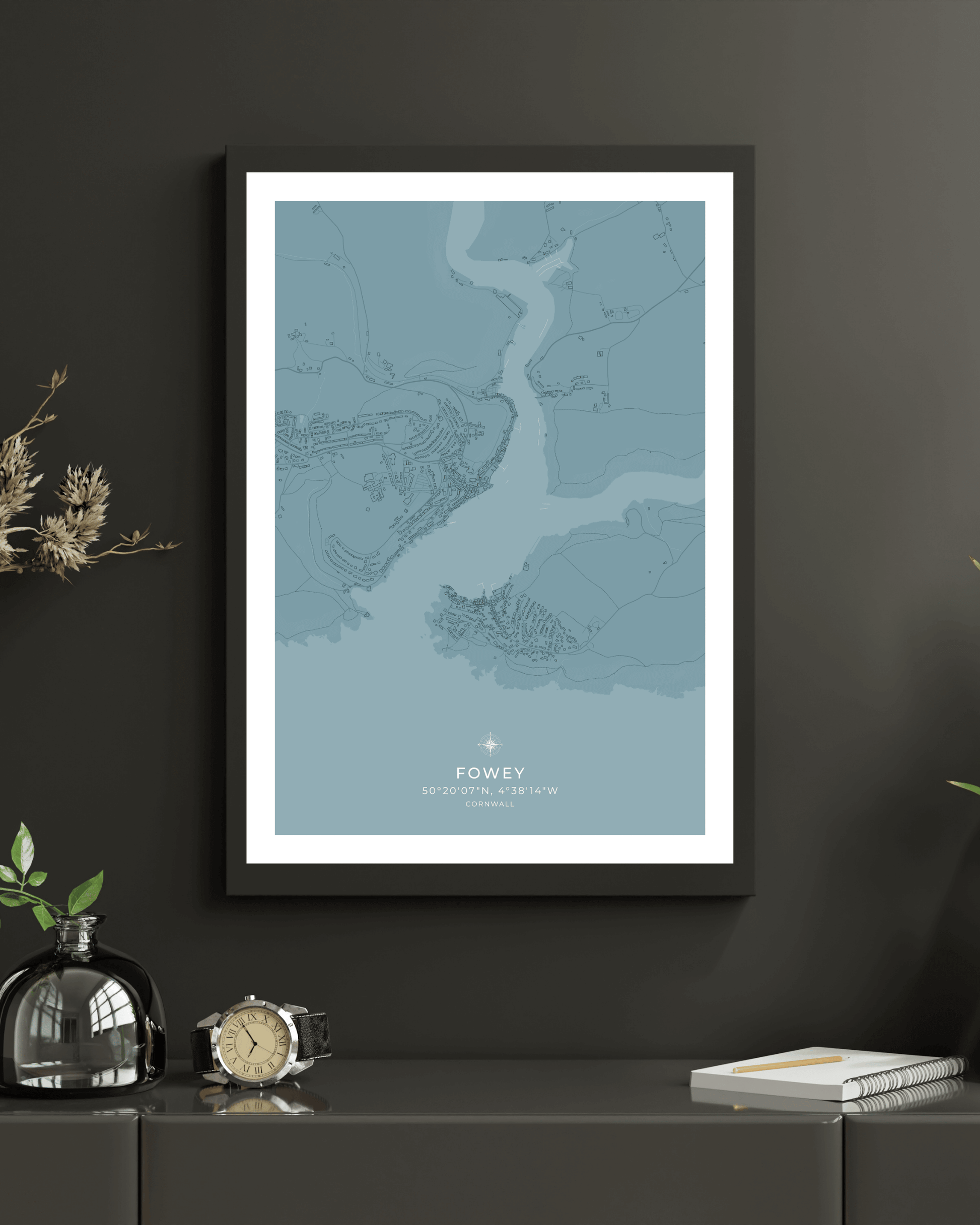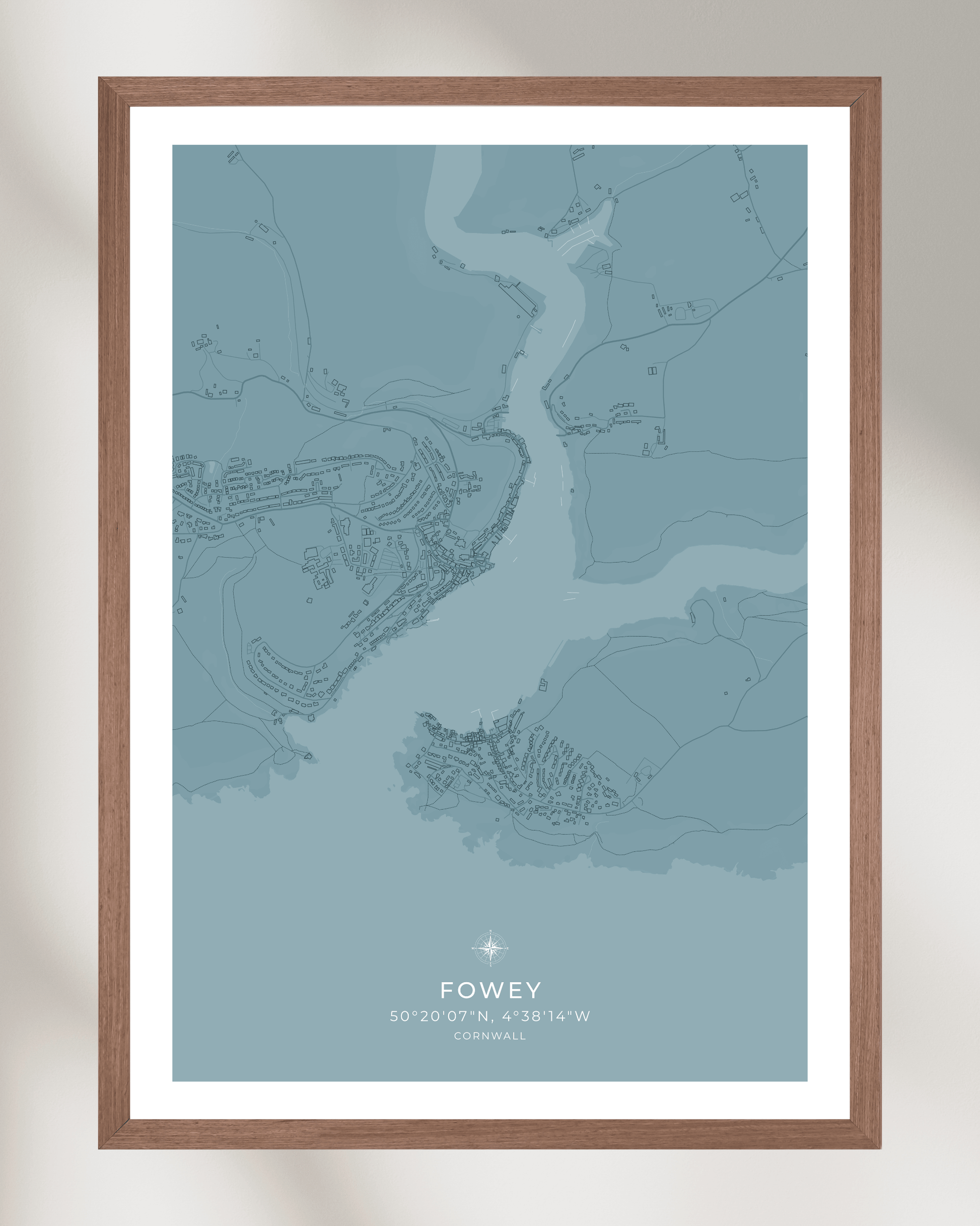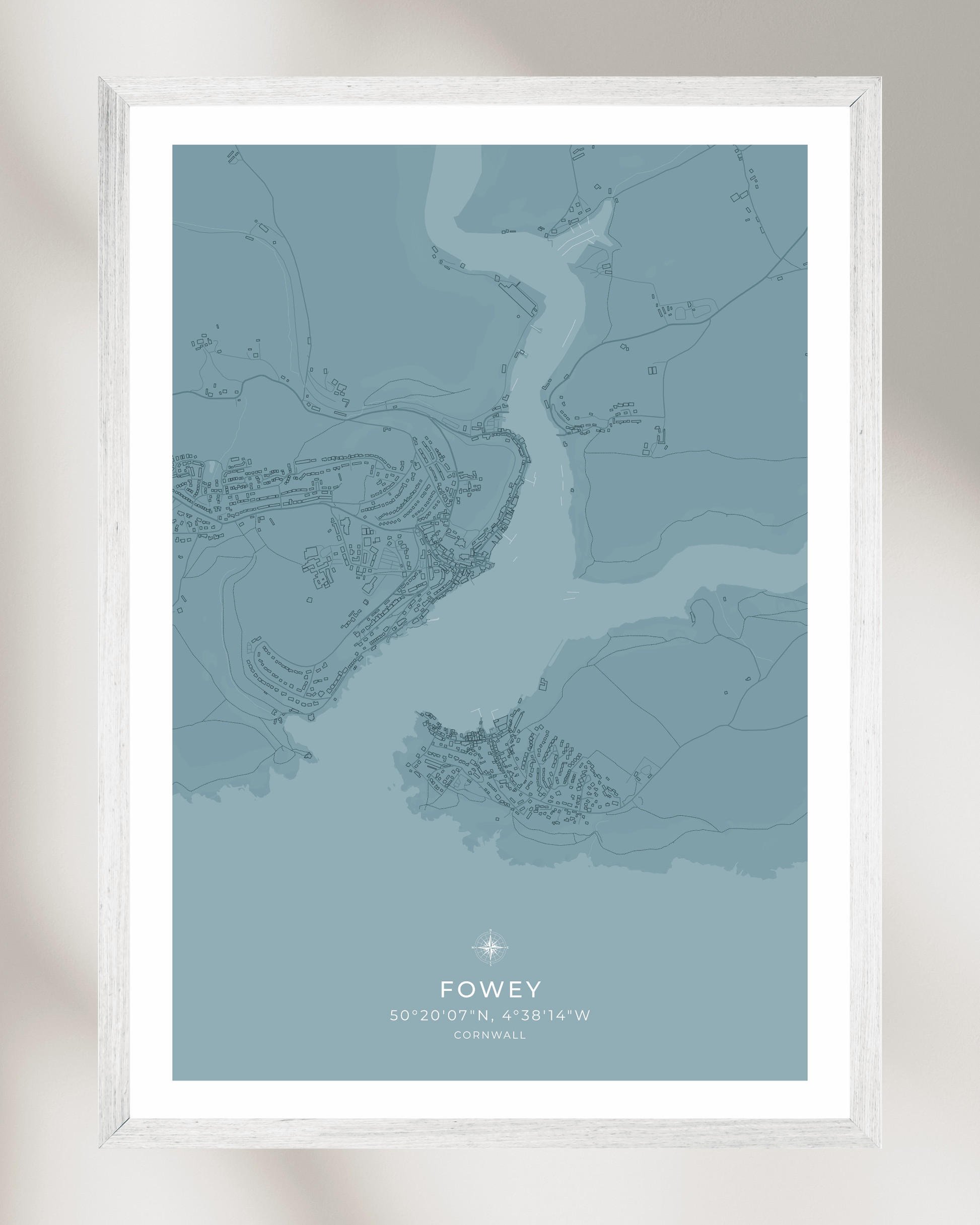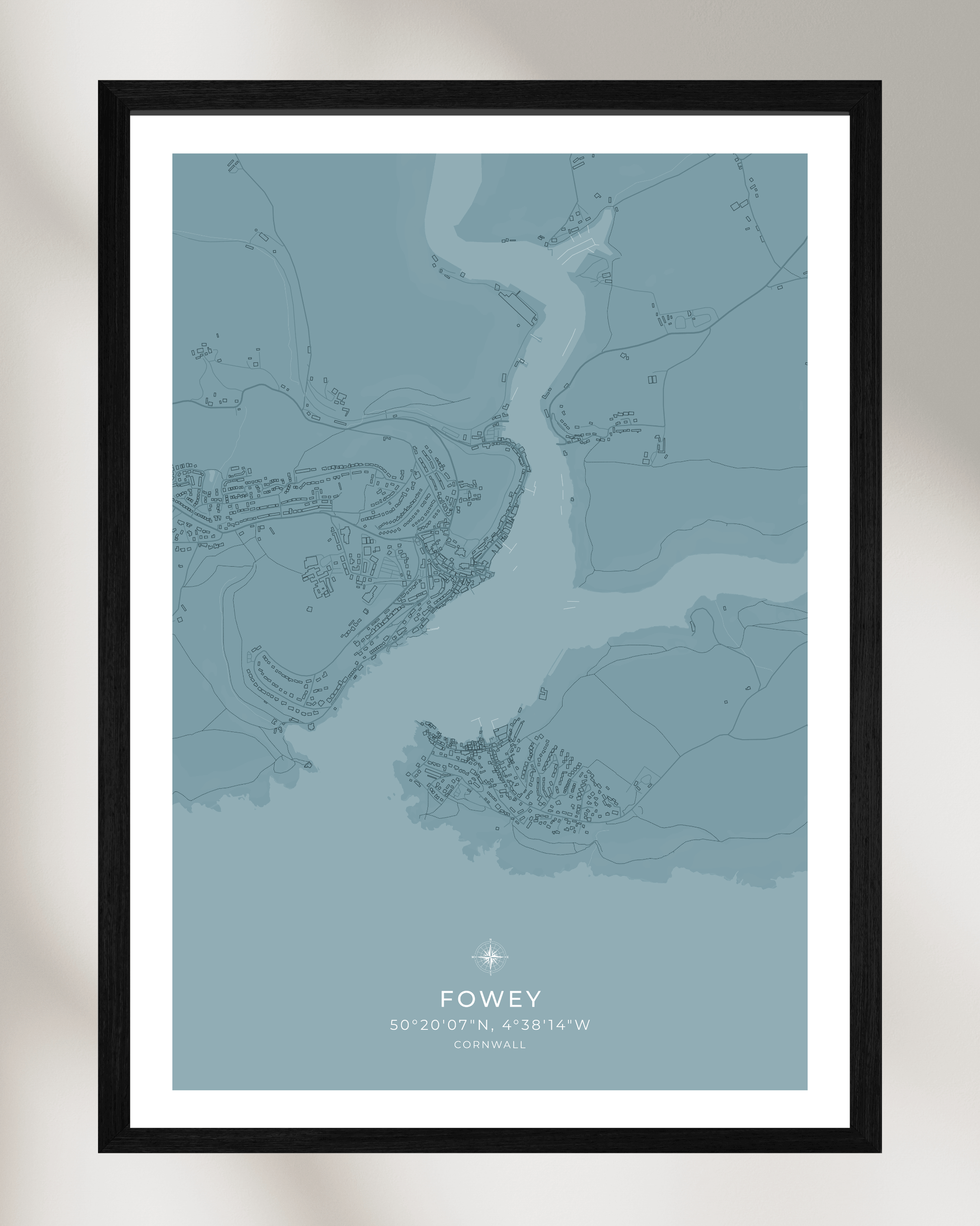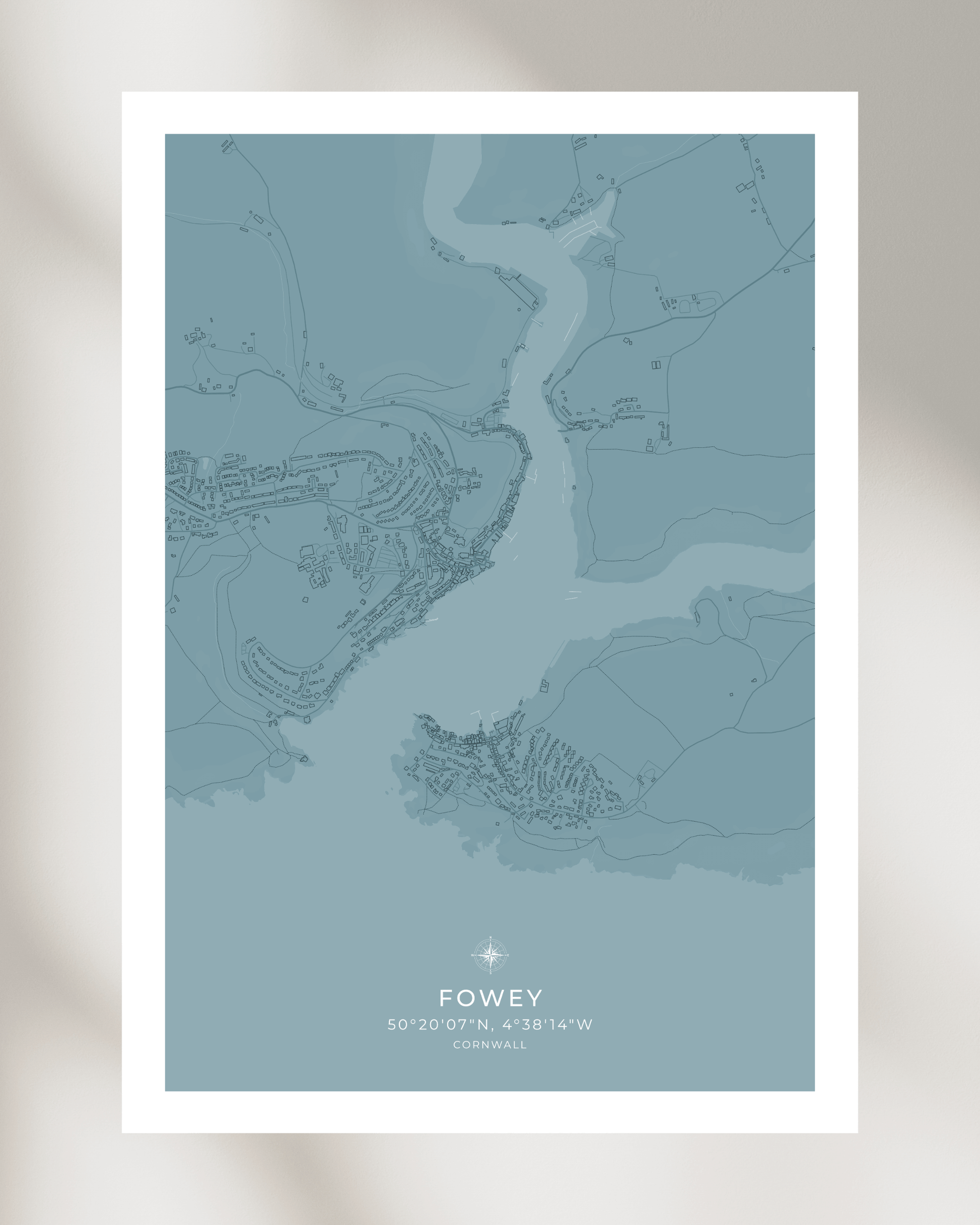 Featuring an elegant depiction of the town’s winding streets, historic buildings, and picturesque waterfront, this piece captures the essence of Fowey’s unique coastal character. Crafted with precision and care, the map highlights the town’s most recognisable features, from the bustling harbour and narrow alleyways to the charming cottages that line the hillside.