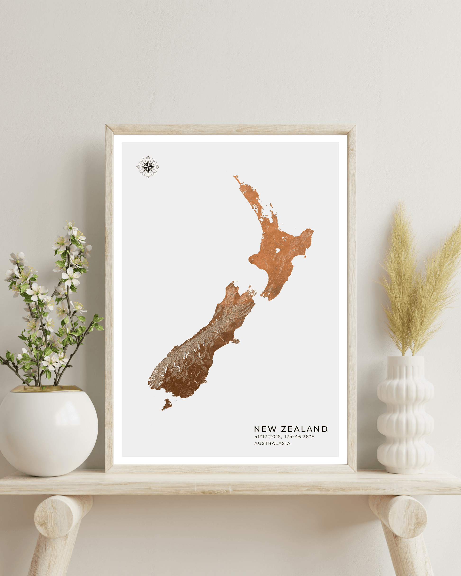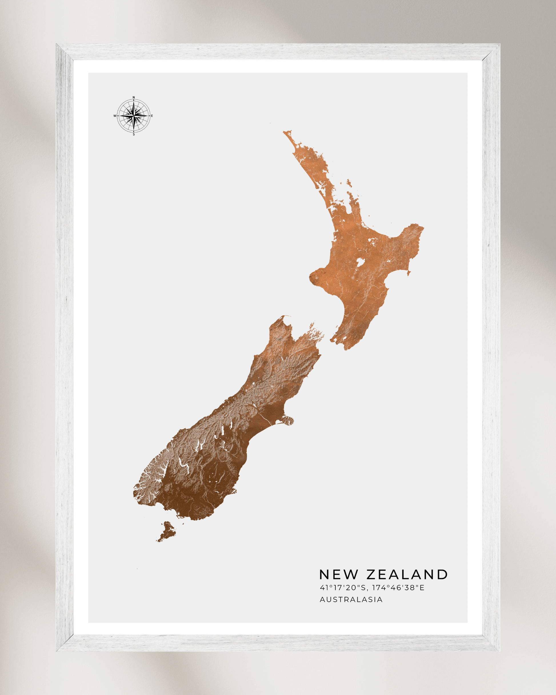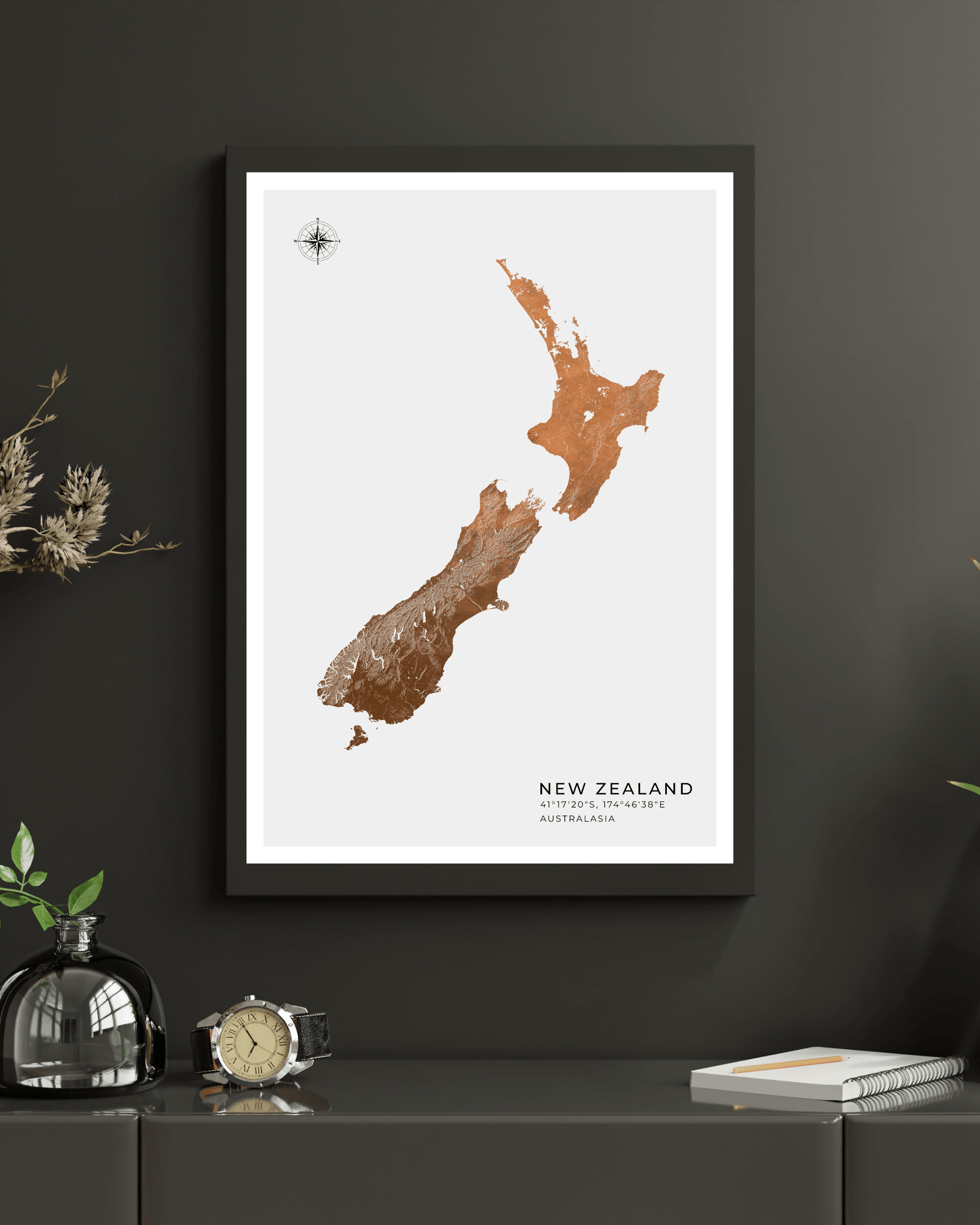 Exceptionally detailed, this map of New Zealand, inclusive of all islands, outlines the topography, complete with all major lakes and waterways.