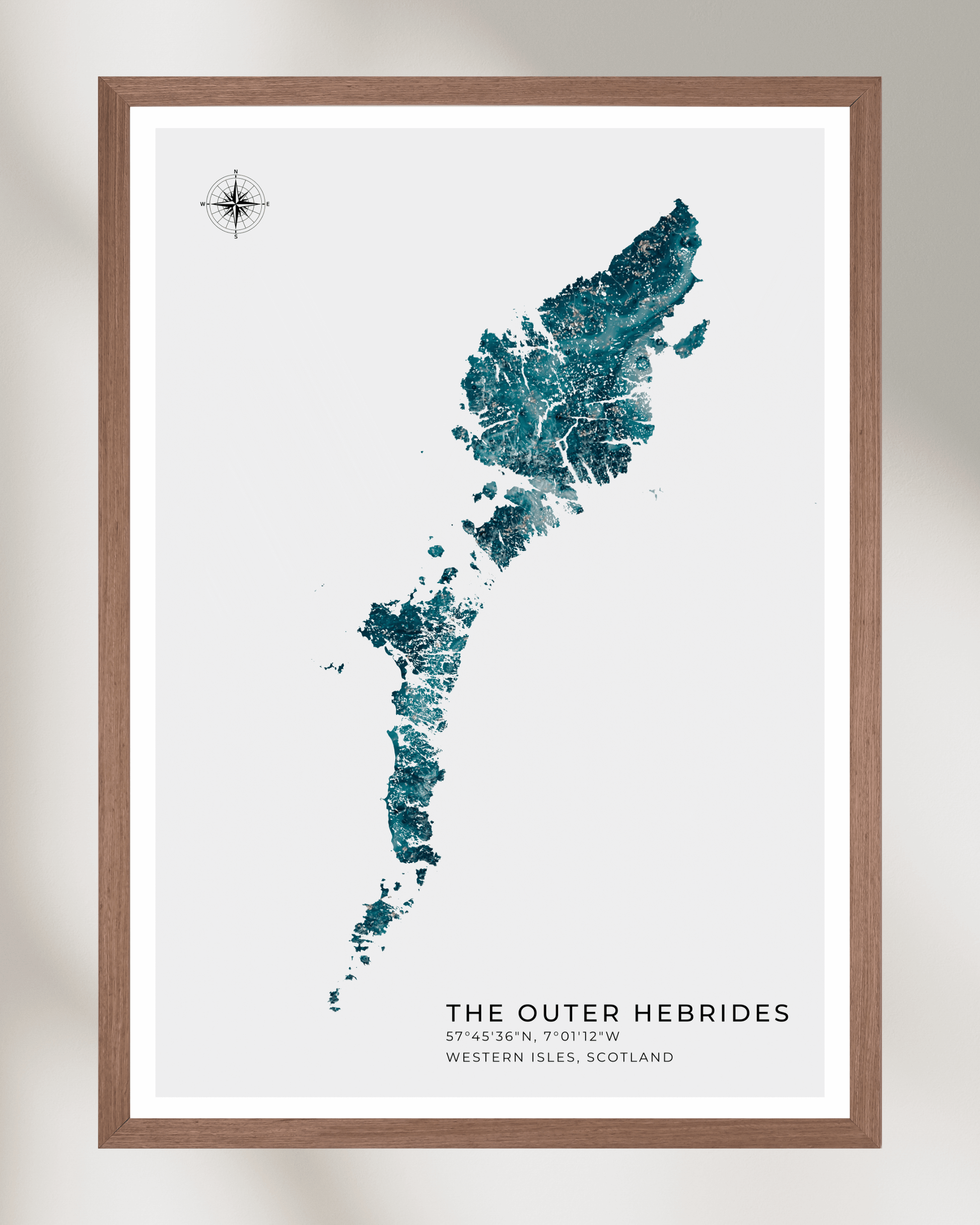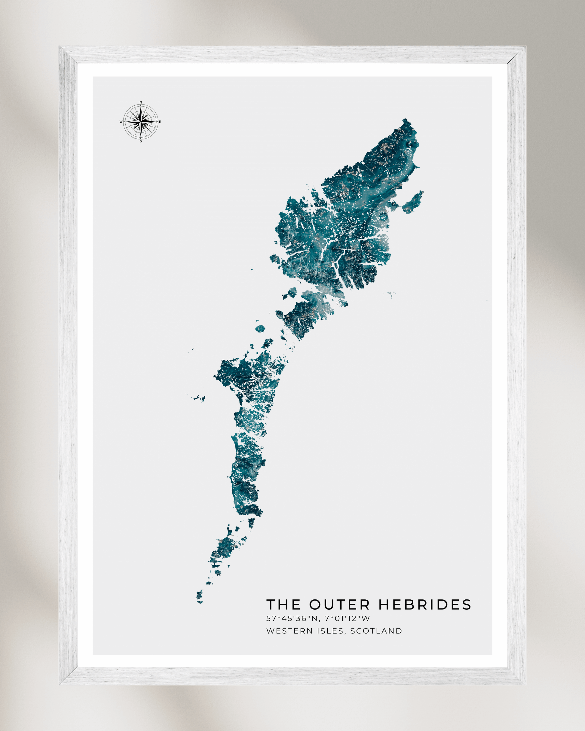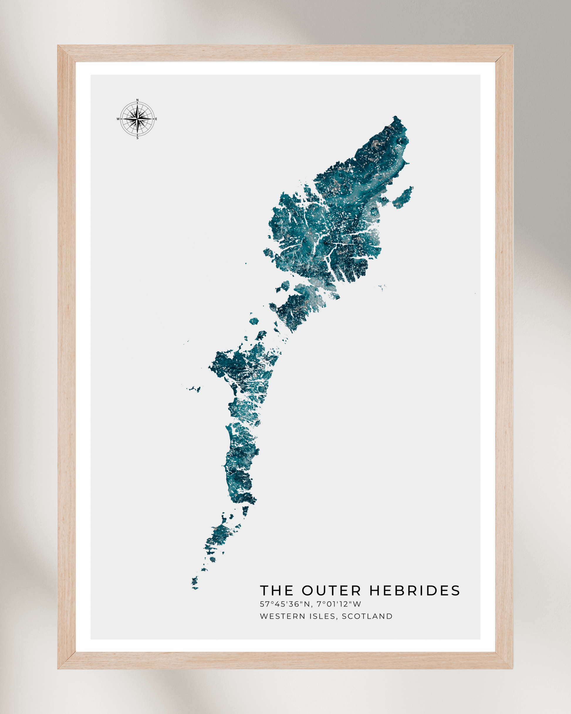 Immerse yourself in the rugged beauty of The Outer Hebrides with this stunning minimalist map of The Western Isles.