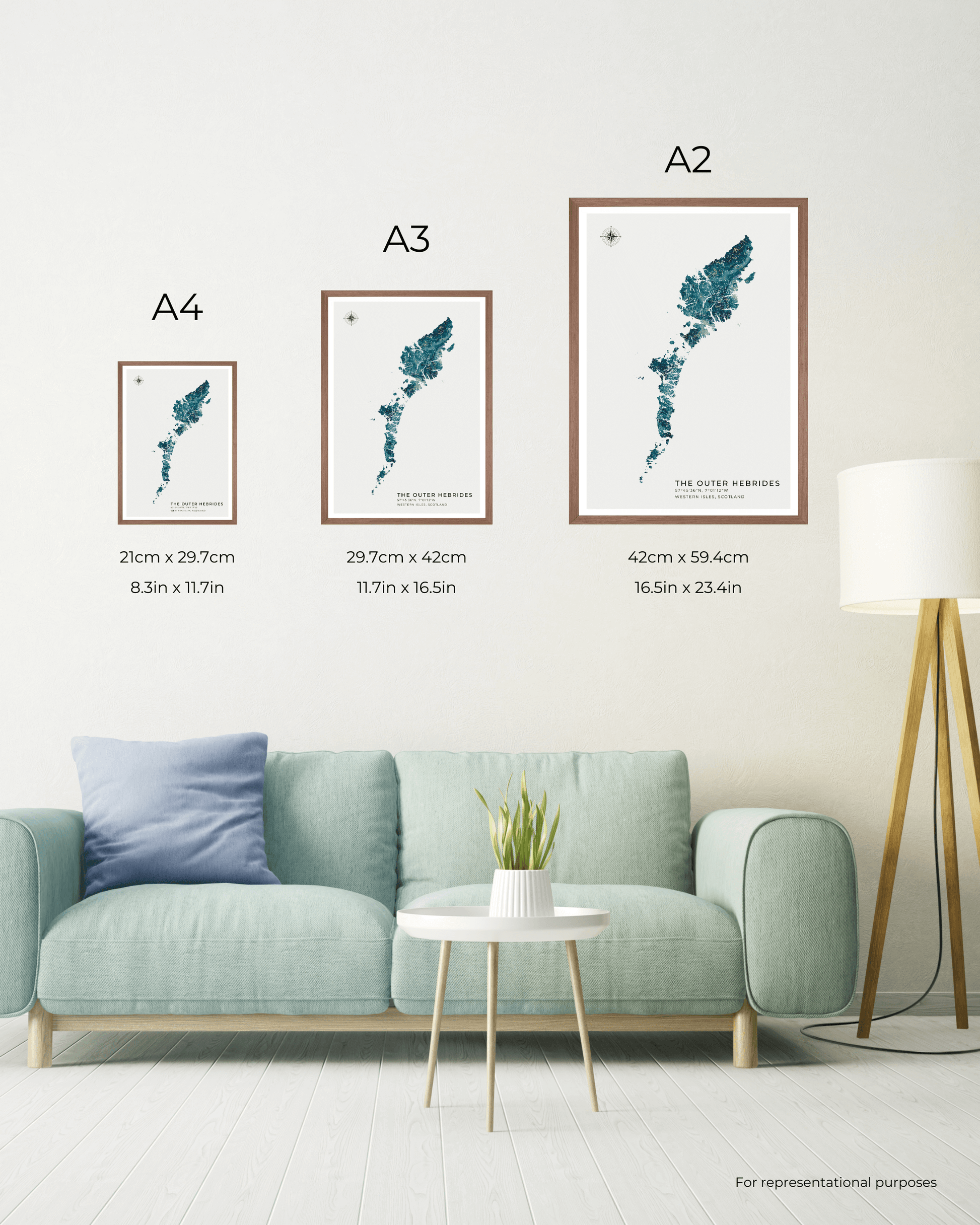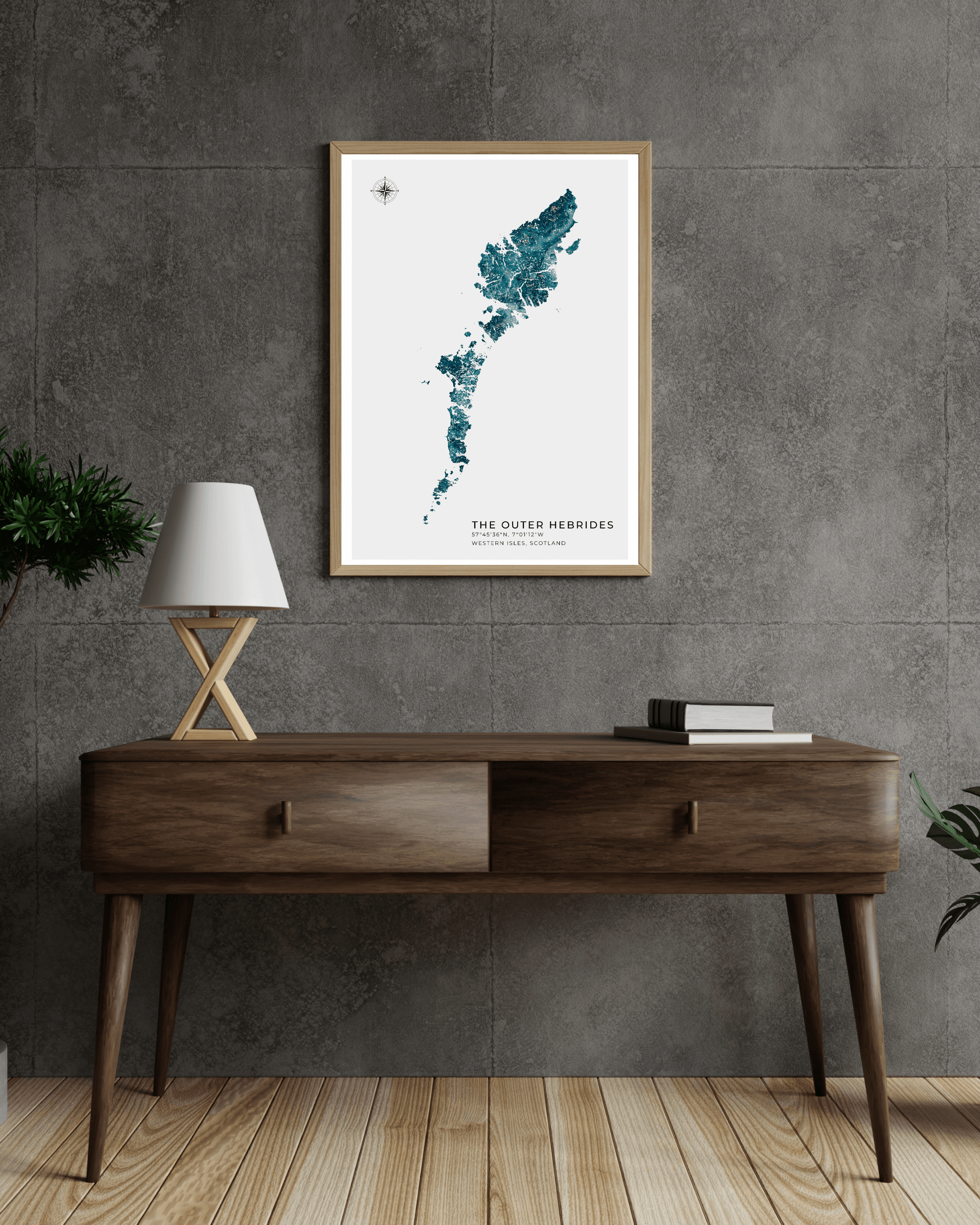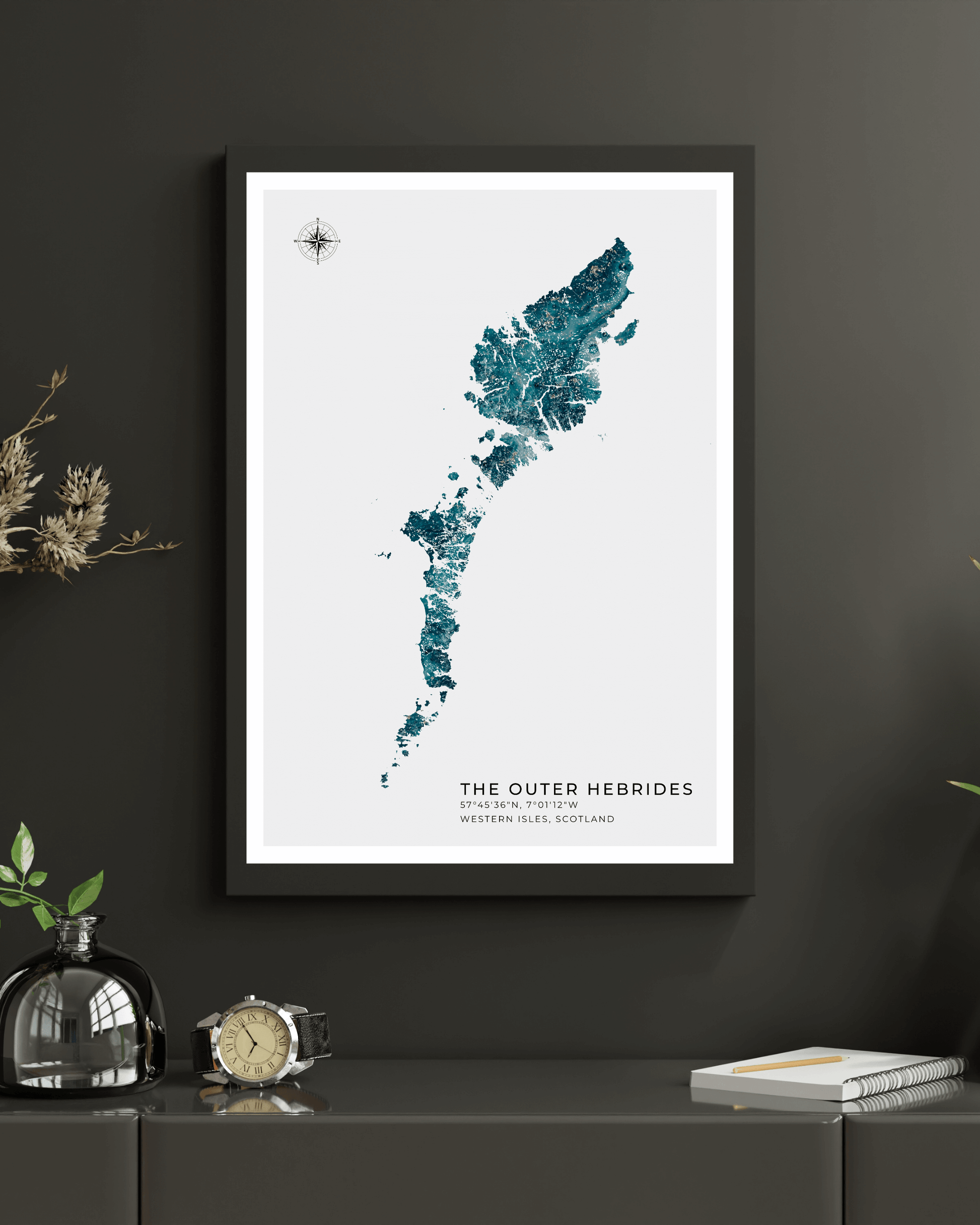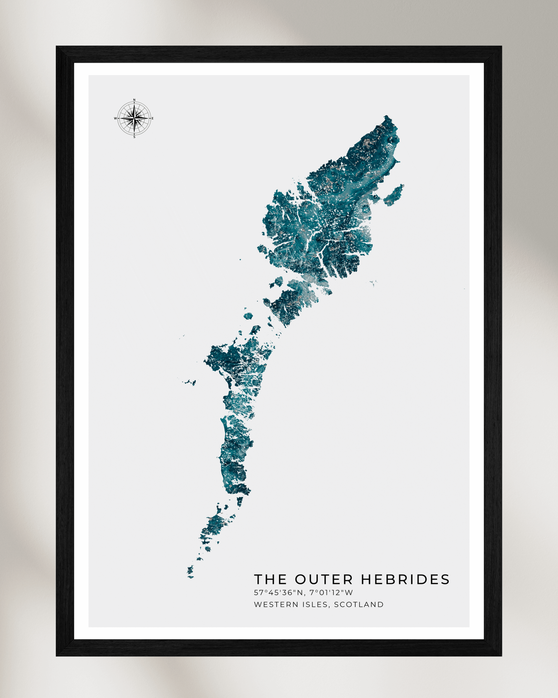 Immerse yourself in the rugged beauty of The Outer Hebrides with this stunning minimalist map of The Western Isles.