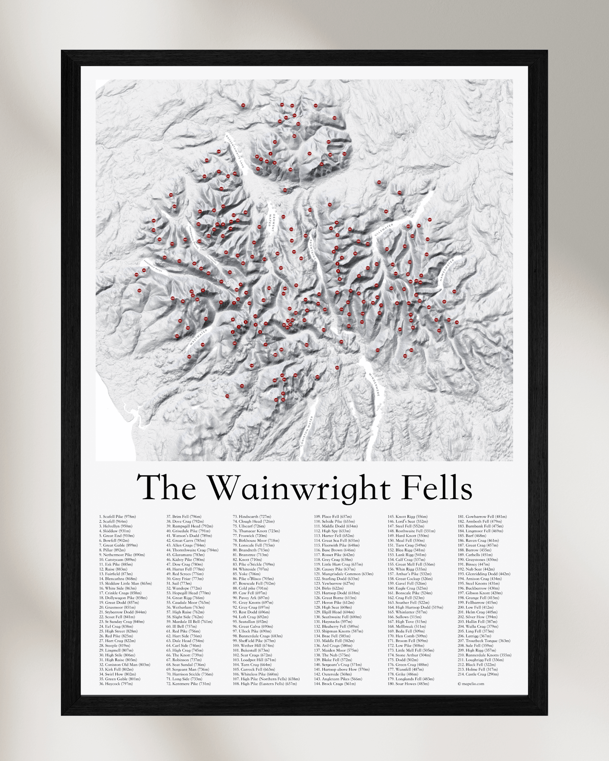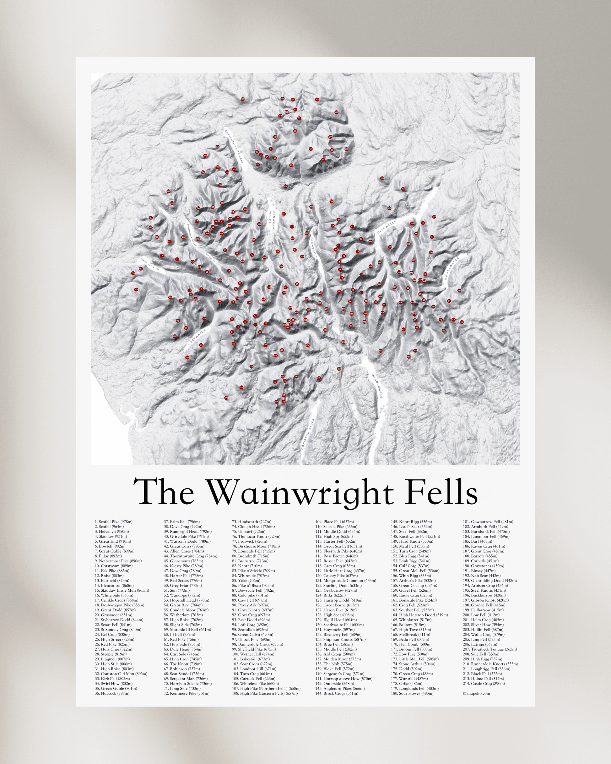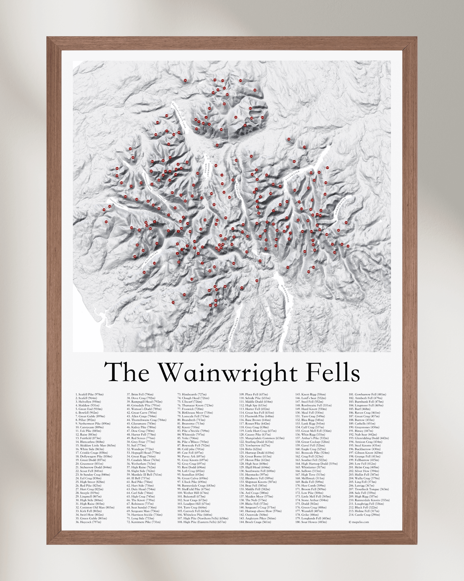Covering all 214 Wainwright Fells in the Lake District, this fine art print accurately pinpoints the location of each fell on a beautiful 3D effect contour map.