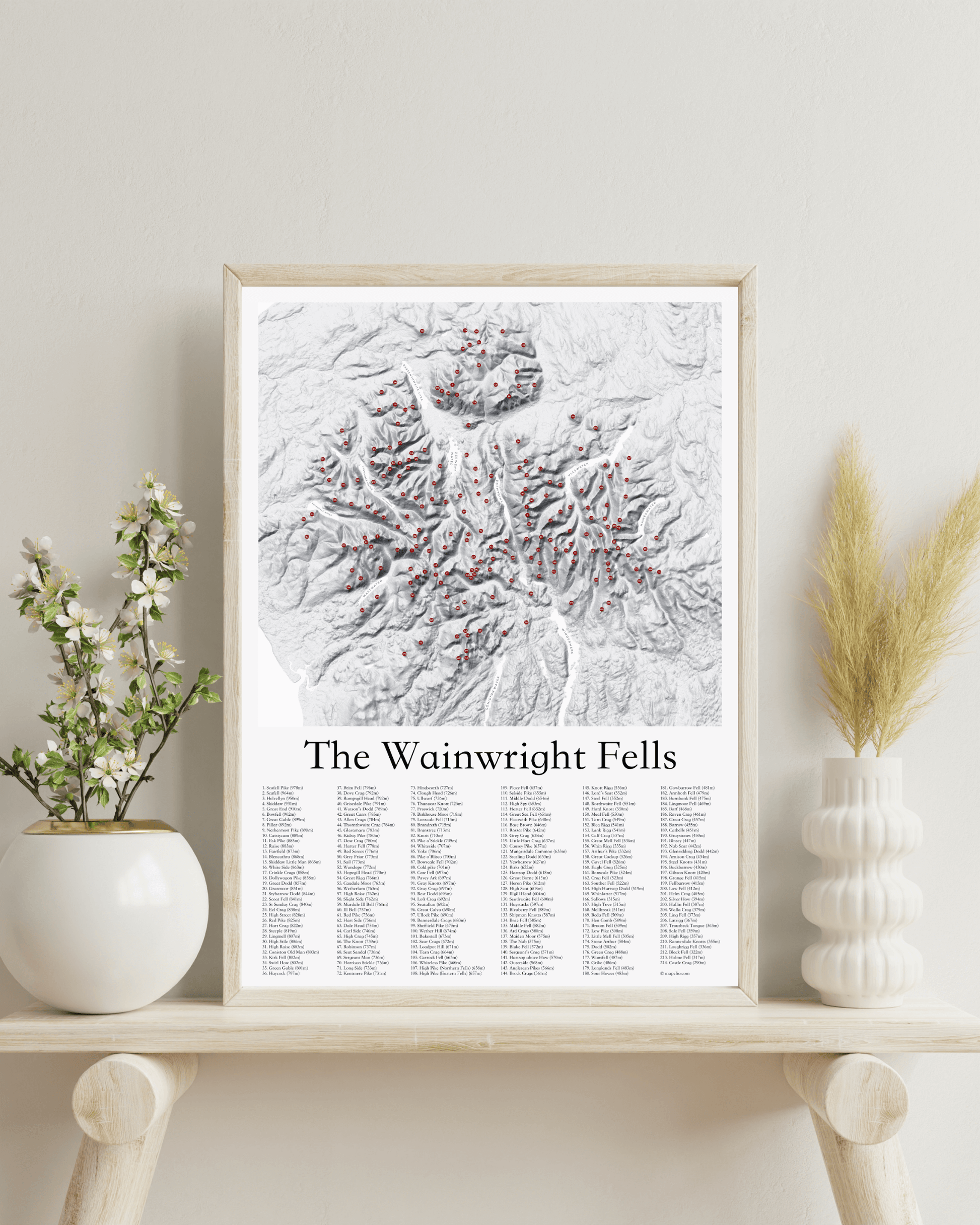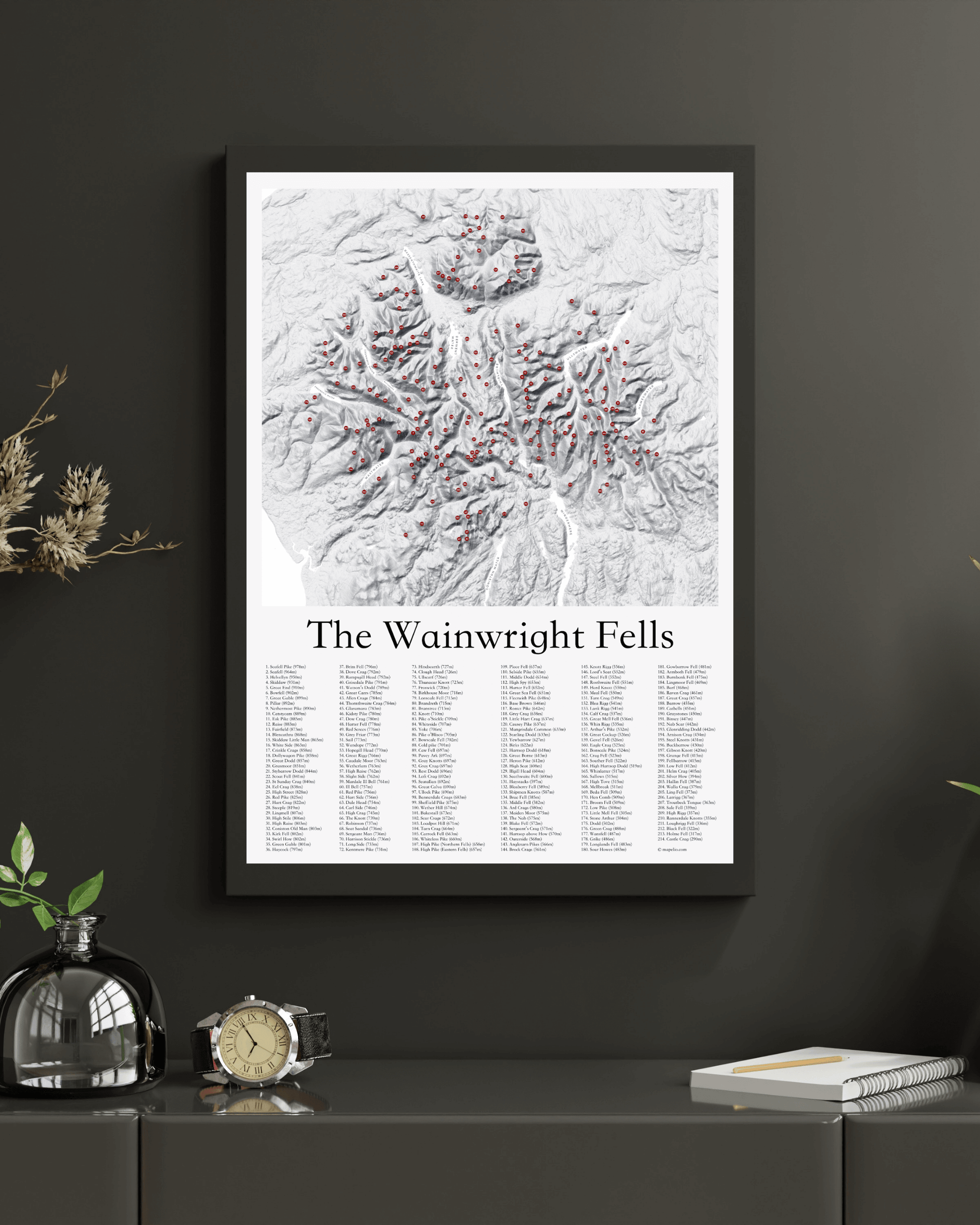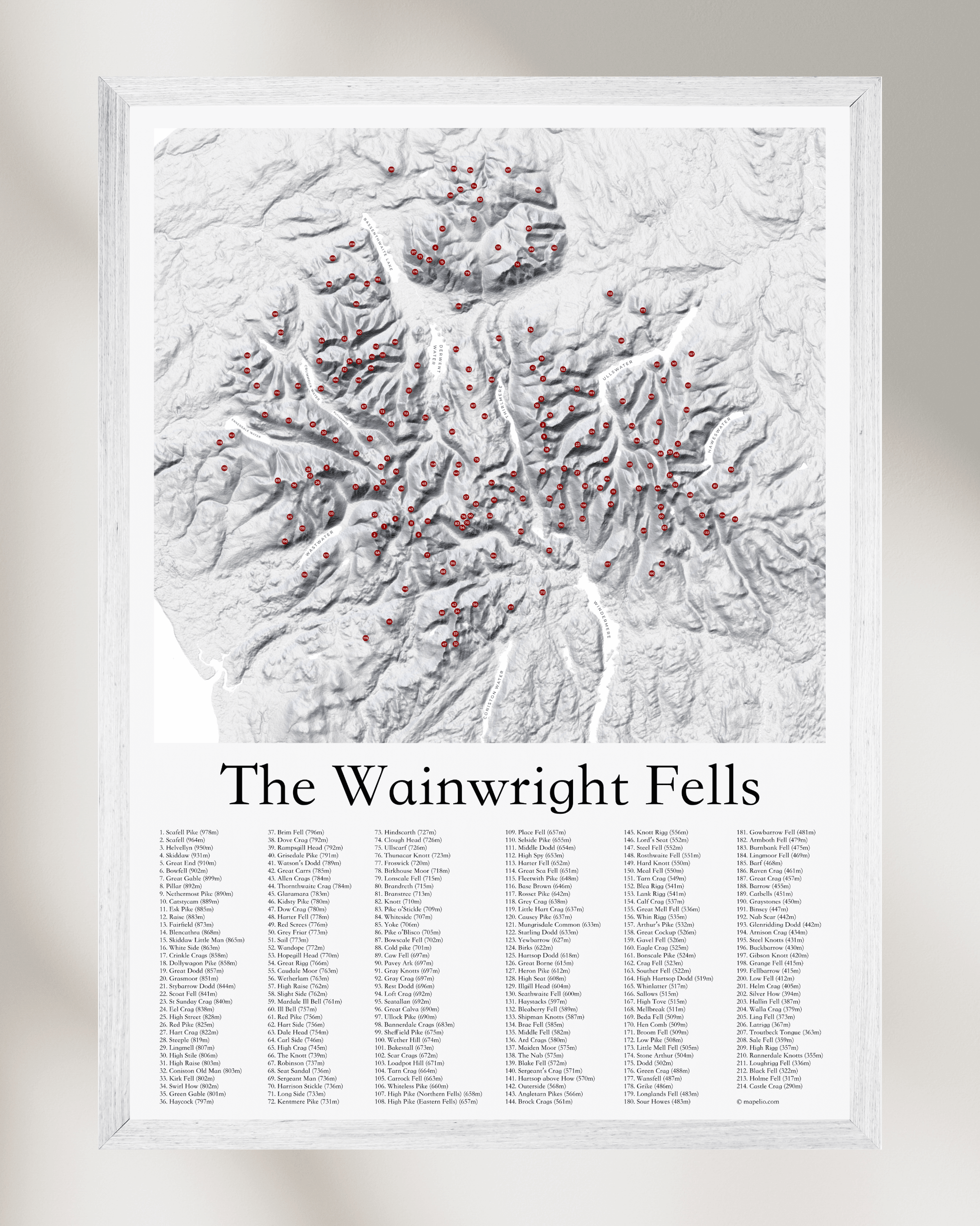 Covering all 214 Wainwright Fells in the Lake District, this fine art print accurately pinpoints the location of each fell on a beautiful 3D effect contour map.