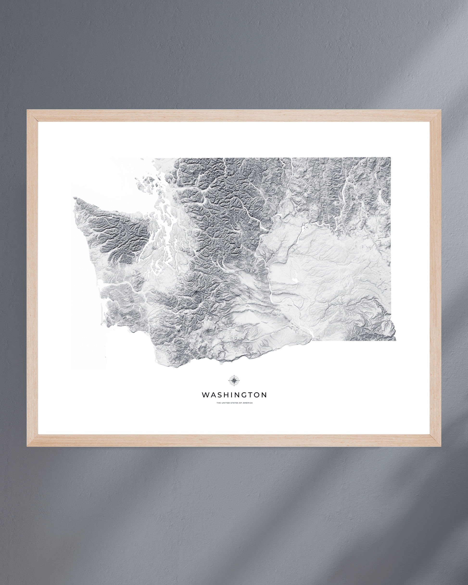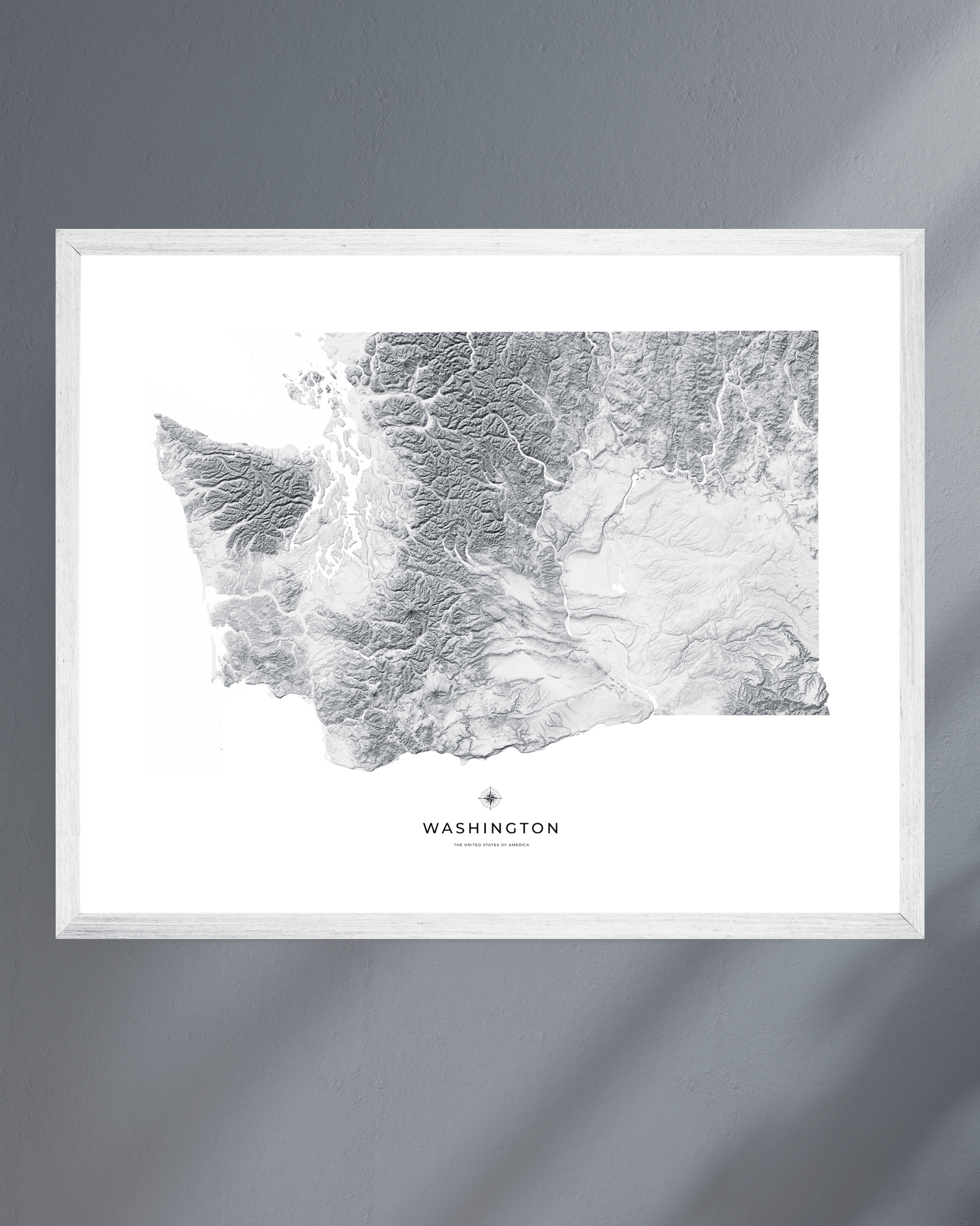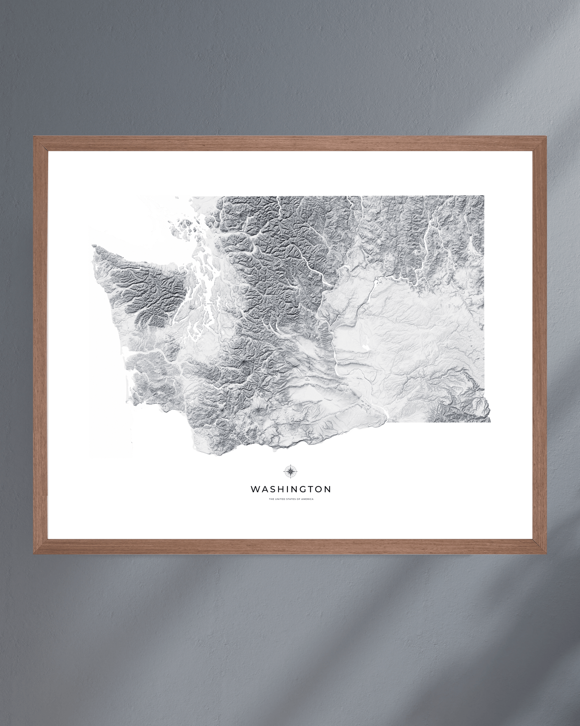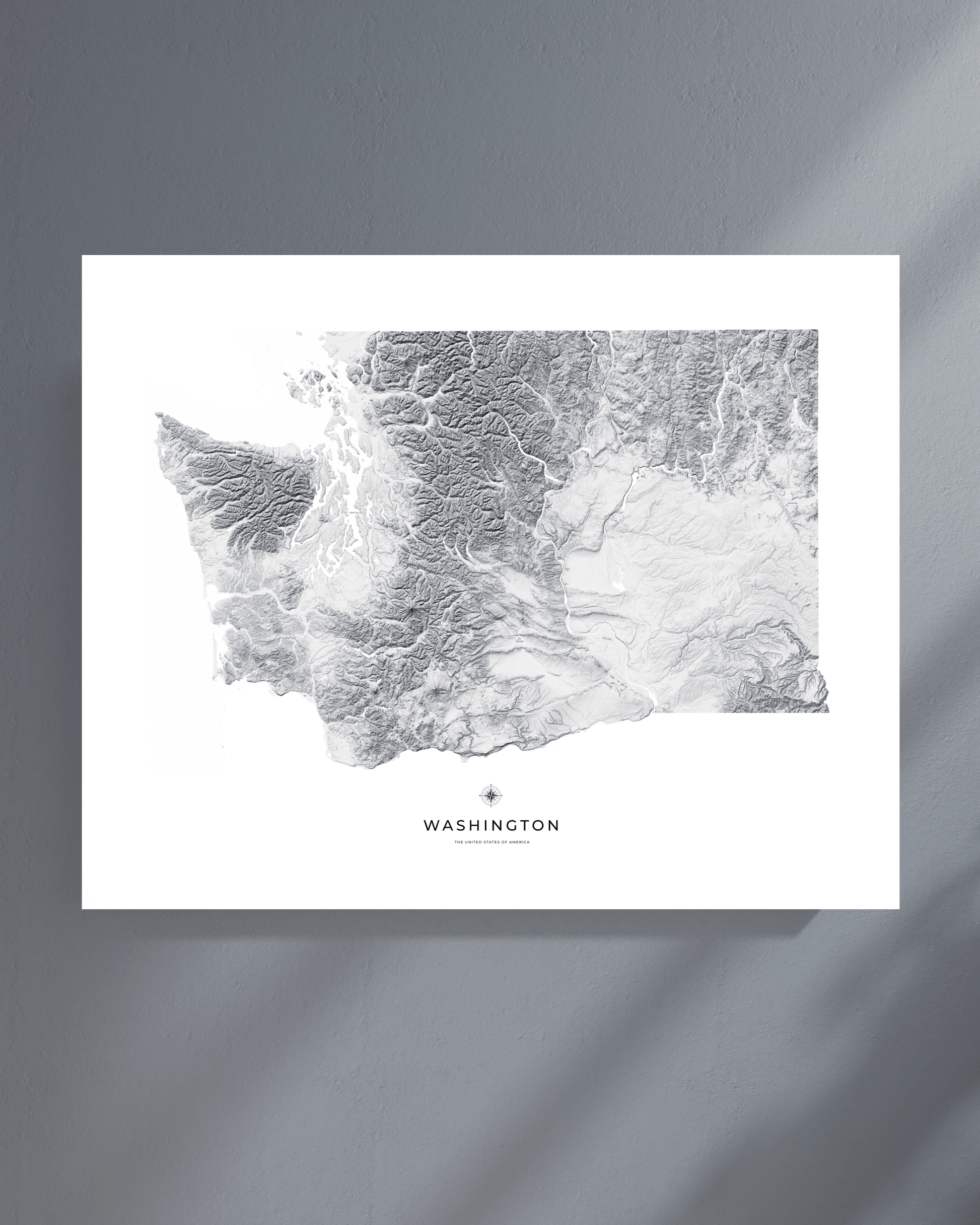 The rugged beauty of Washington captured in stunning topographic detail, with the state capital Seattle discreetly marked.